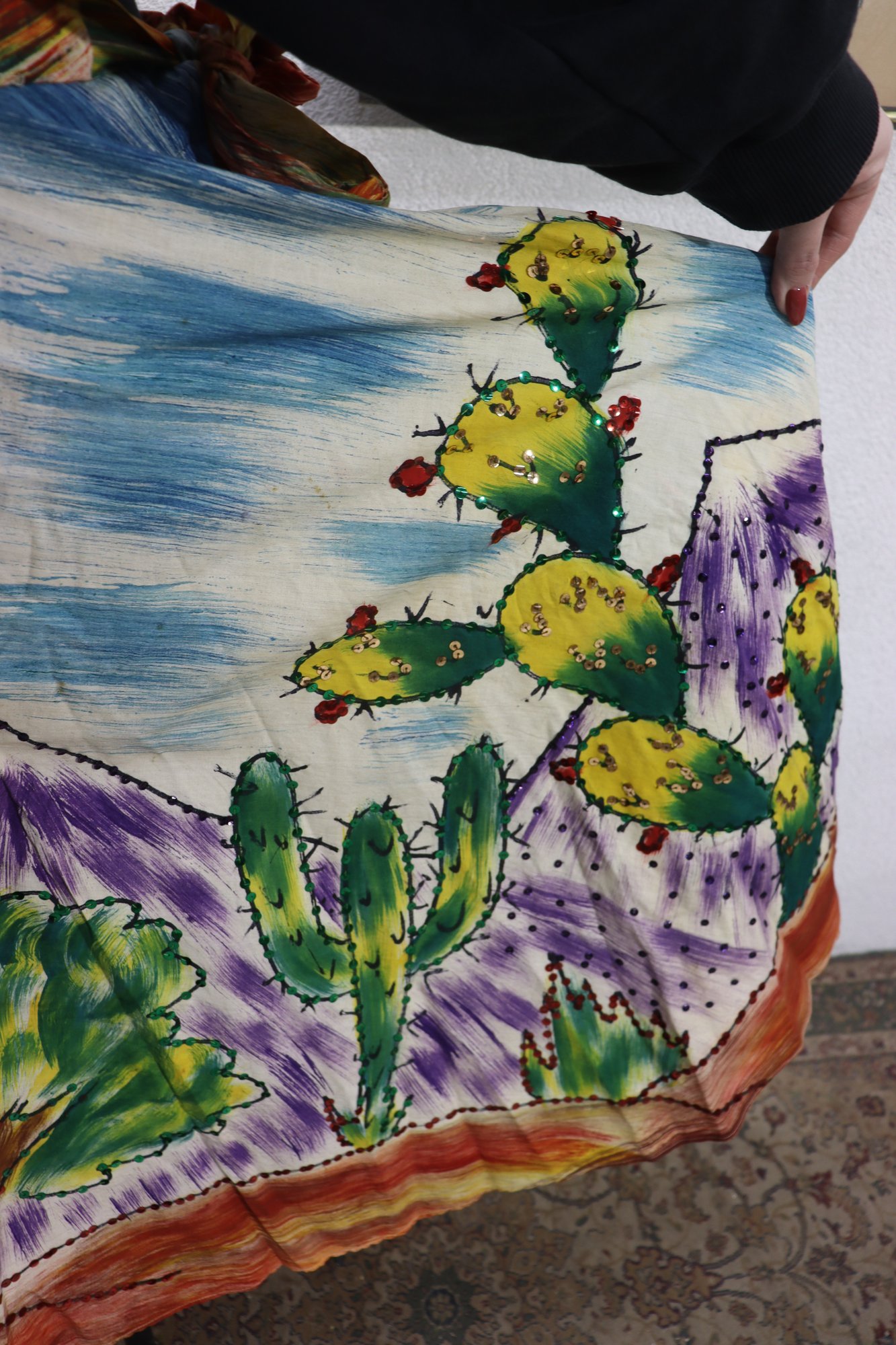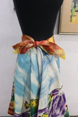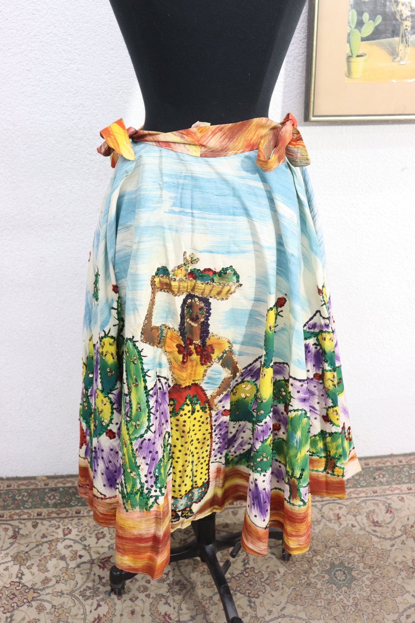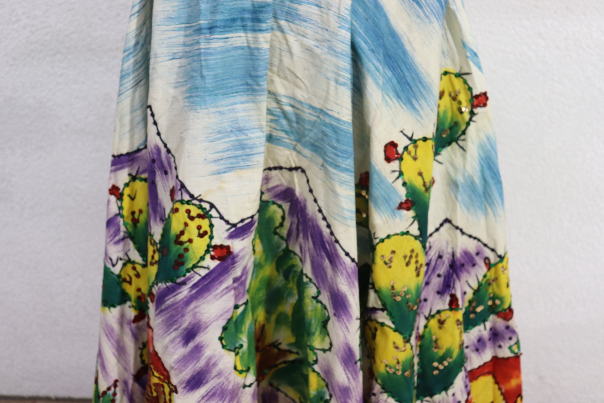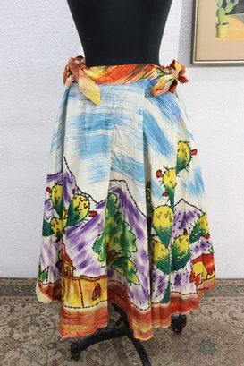 Colorful and eye-catching vintage Mexican scenic skirt featuring vibrant hand-painted–style artwork depicting landscapes, cactus, architecture, and traditional figures. Designed with a wrap-style waist that ties at the sides, this skirt offers an adjustable fit and wonderful movement.