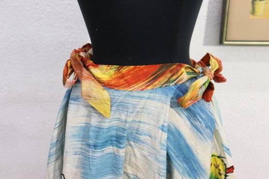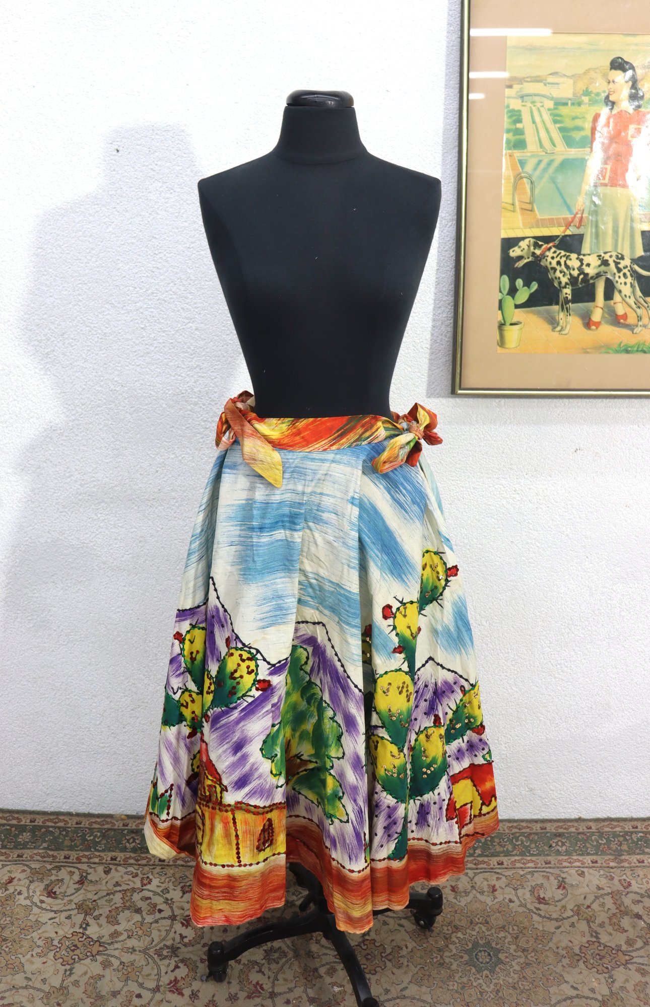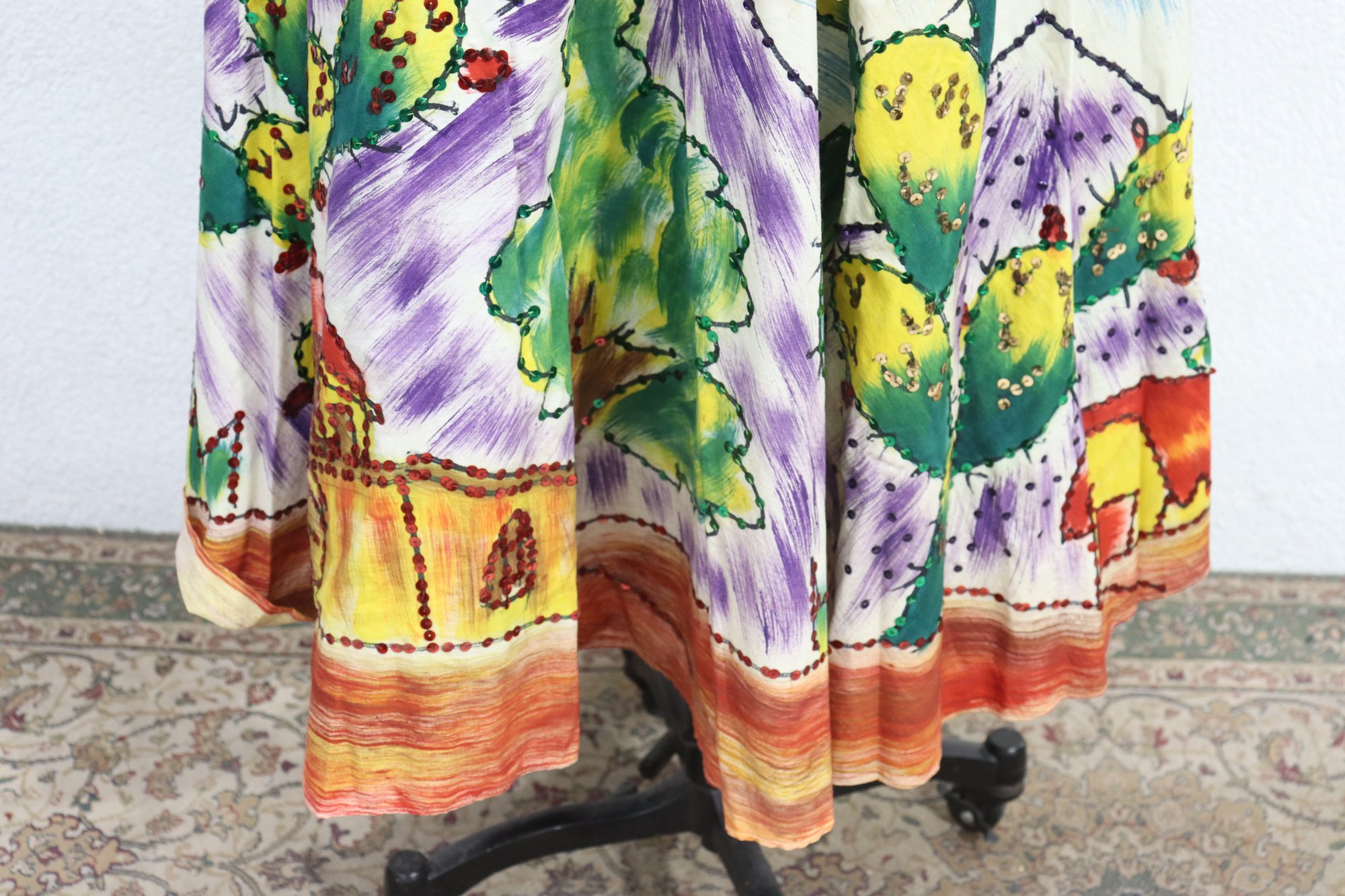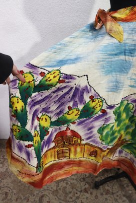 Colorful and eye-catching vintage Mexican scenic skirt featuring vibrant hand-painted–style artwork depicting landscapes, cactus, architecture, and traditional figures. Designed with a wrap-style waist that ties at the sides, this skirt offers an adjustable fit and wonderful movement.