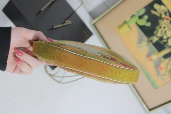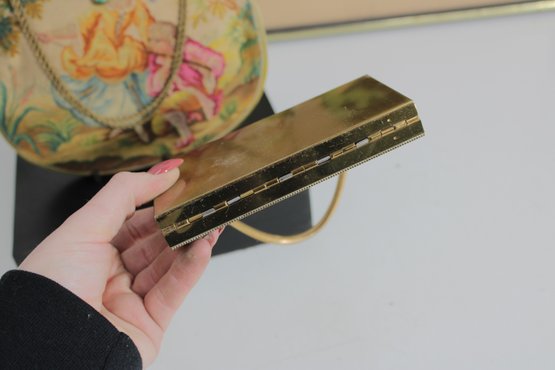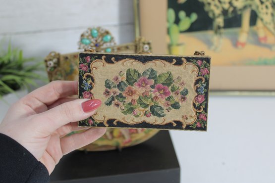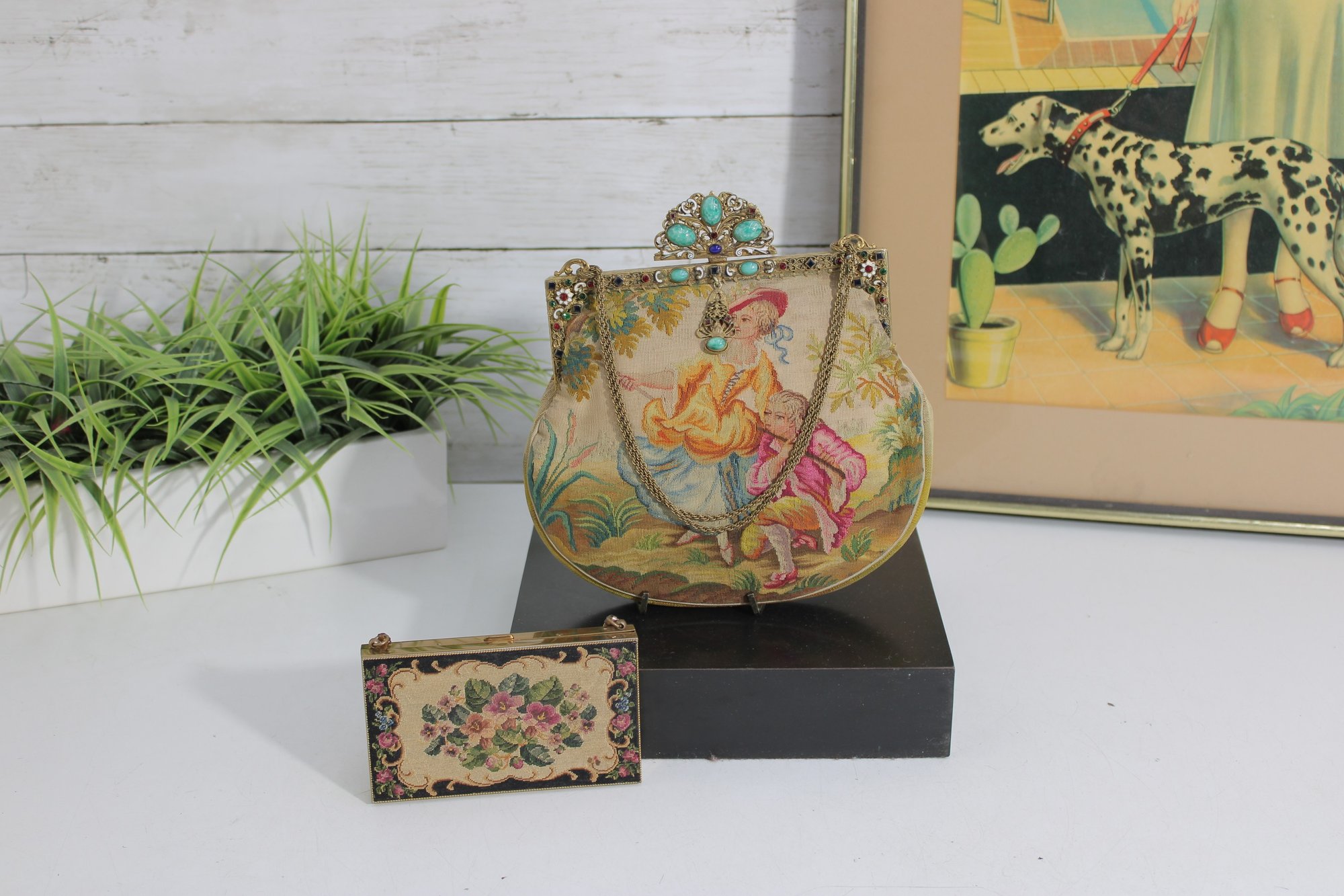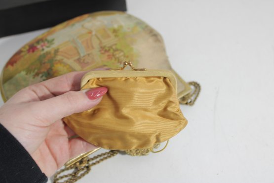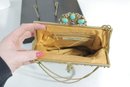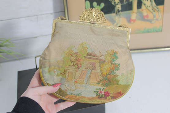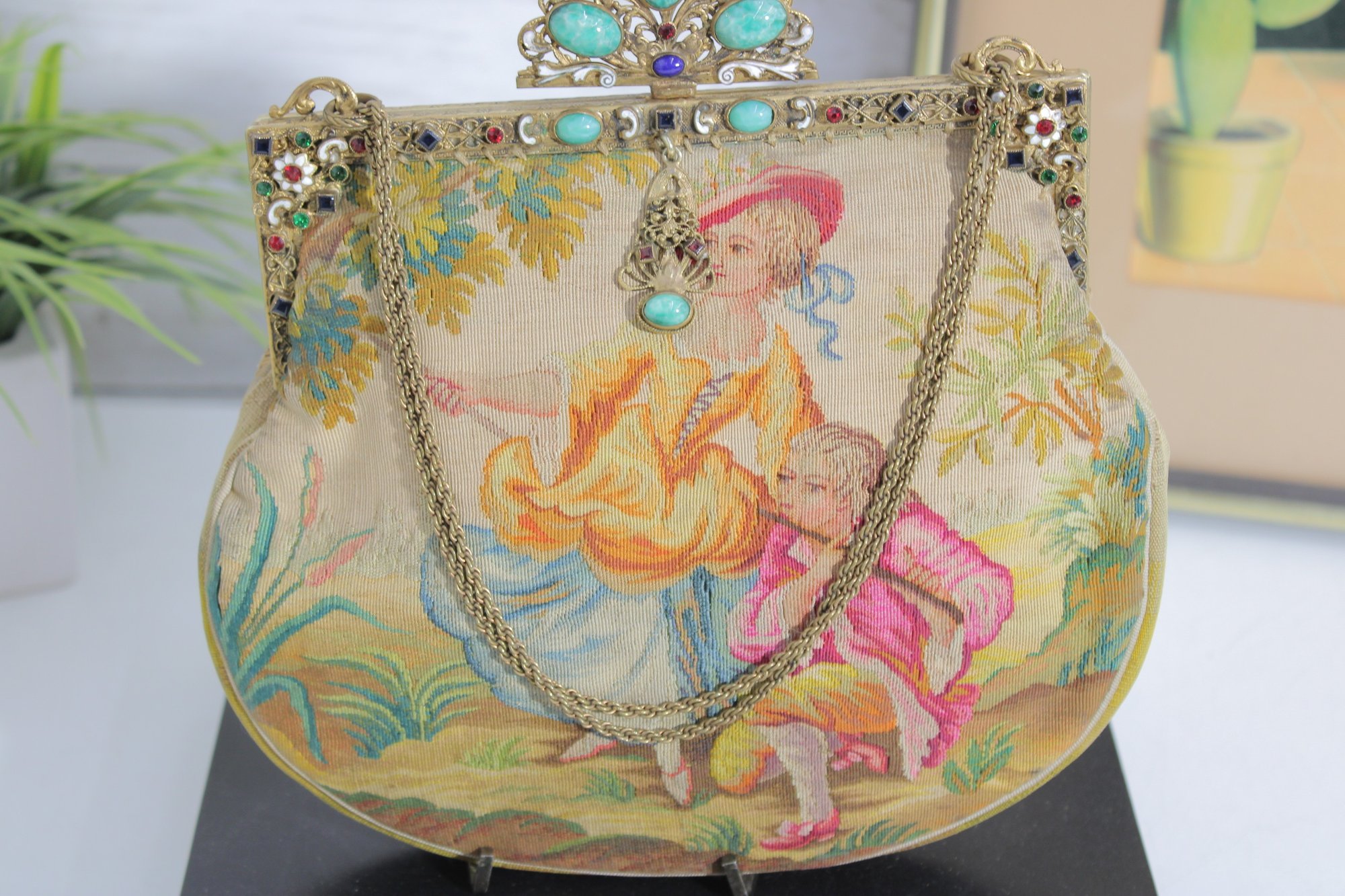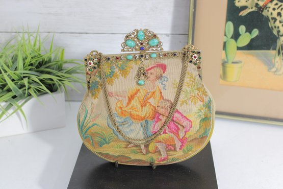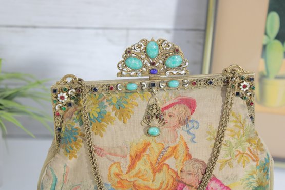 vintage micro-beaded purse featuring a beautiful romantic scene of a courting couple in a pastoral garden setting. This stunning bag is framed in ornate gold-tone metal and topped with a jeweled clasp accented with turquoise and colored stones. The delicate beadwork showcases soft, elegant colors and intricate detail throughout.