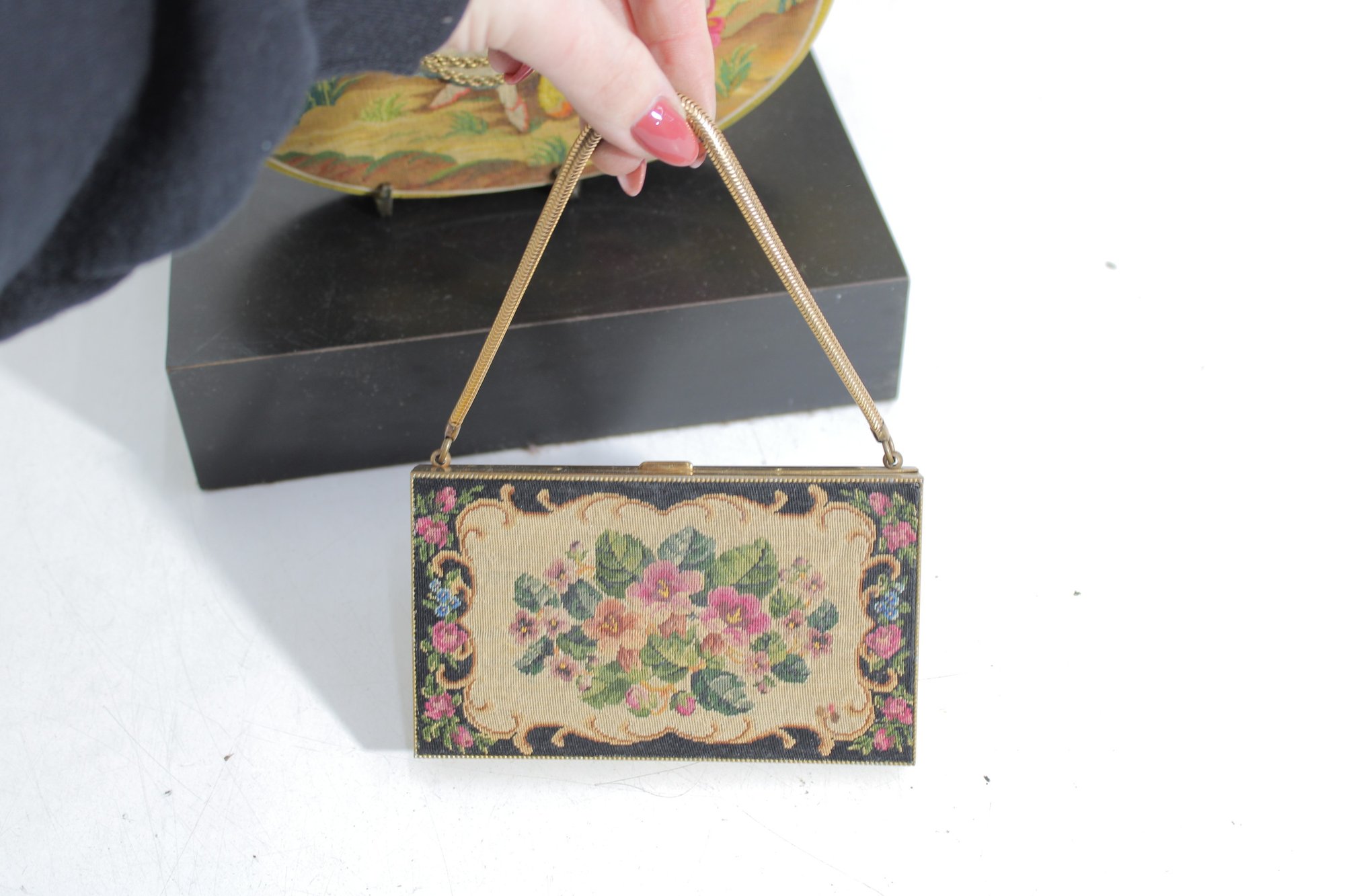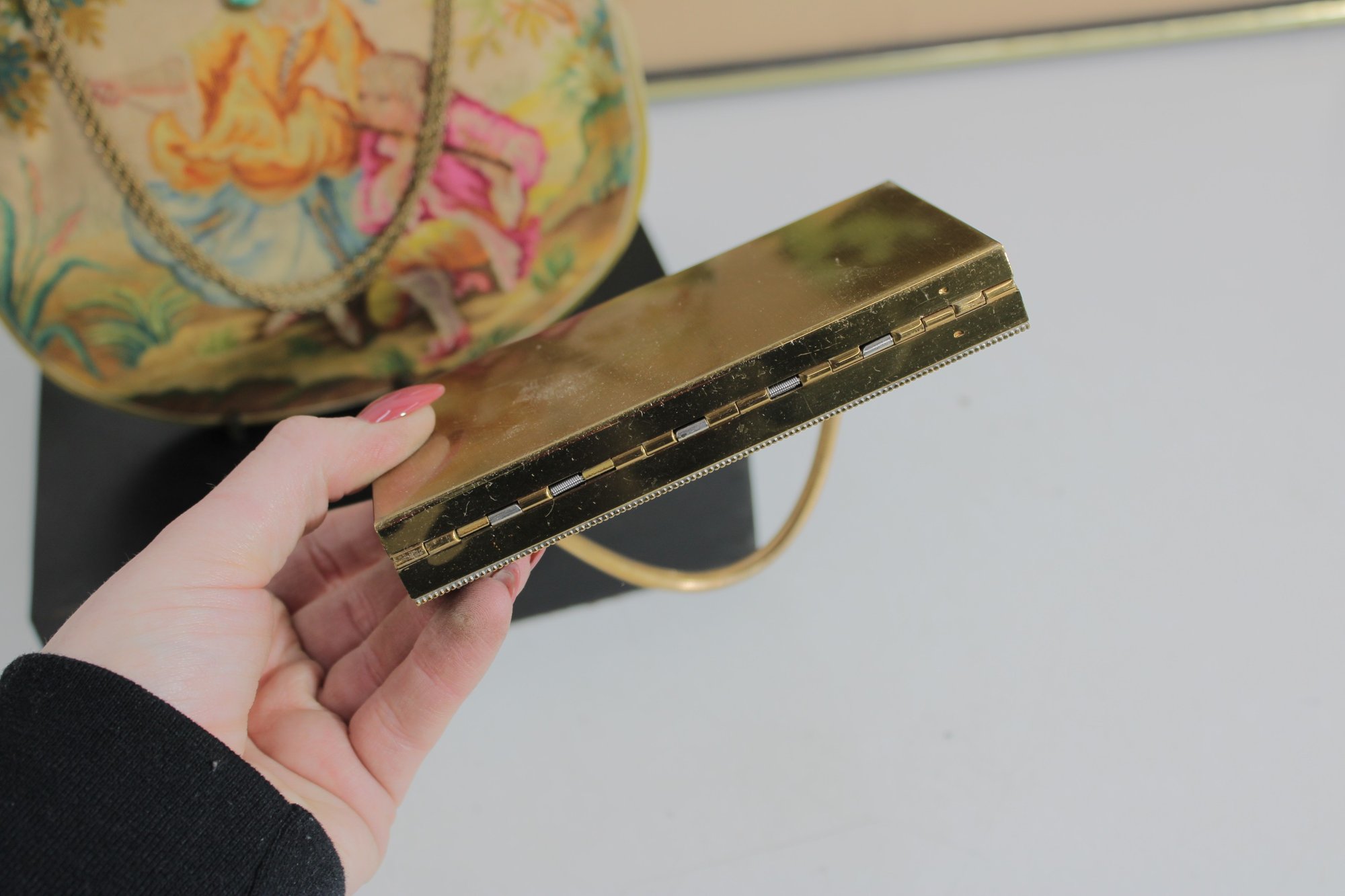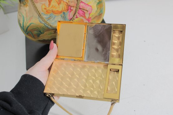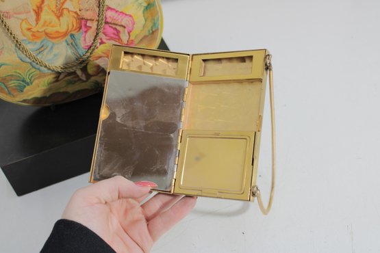 Included is the original matching compact, decorated with coordinating floral artwork. The compact opens to reveal a mirror and powder compartment, making this a rare and desirable set for collectors.
