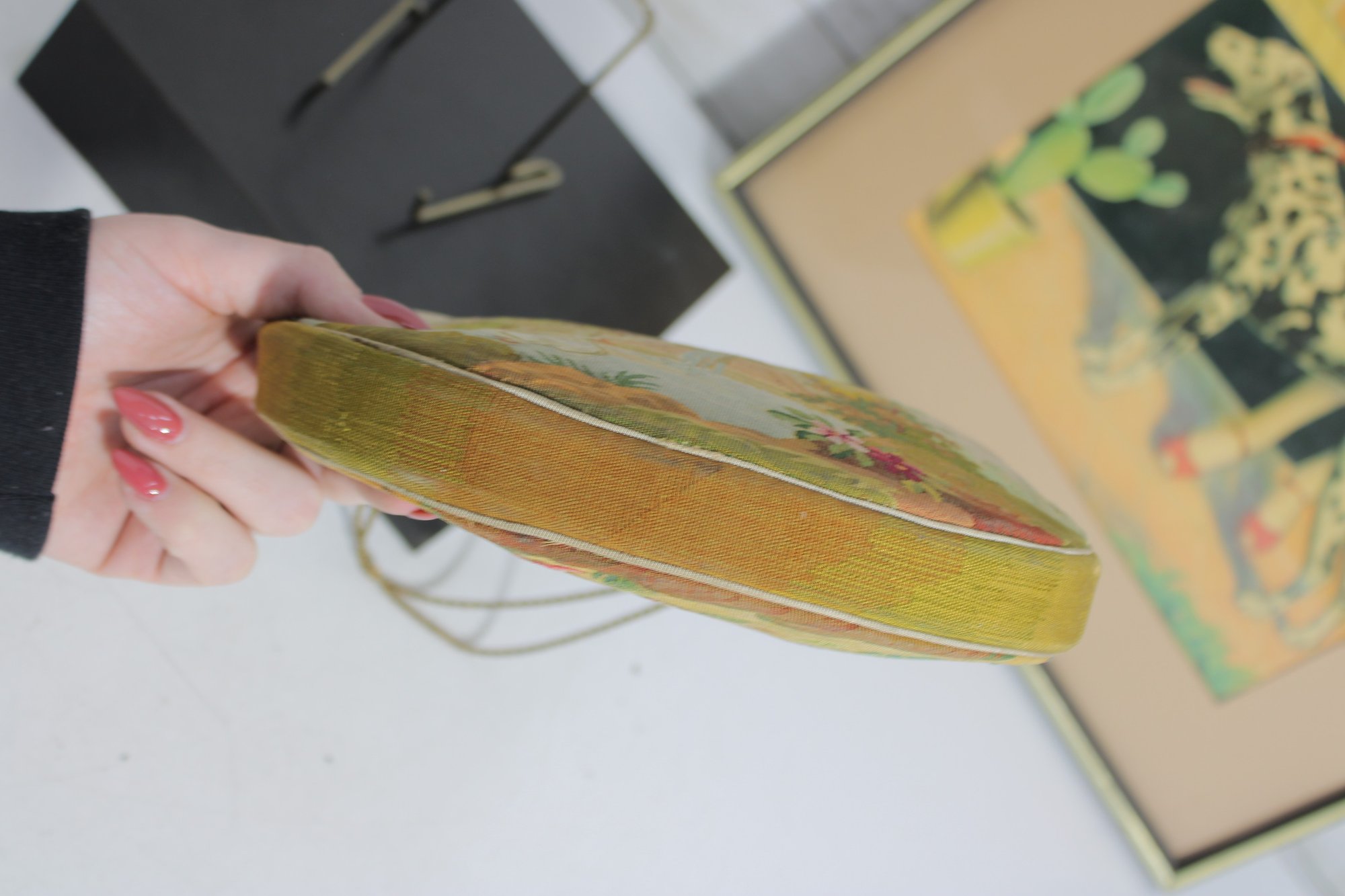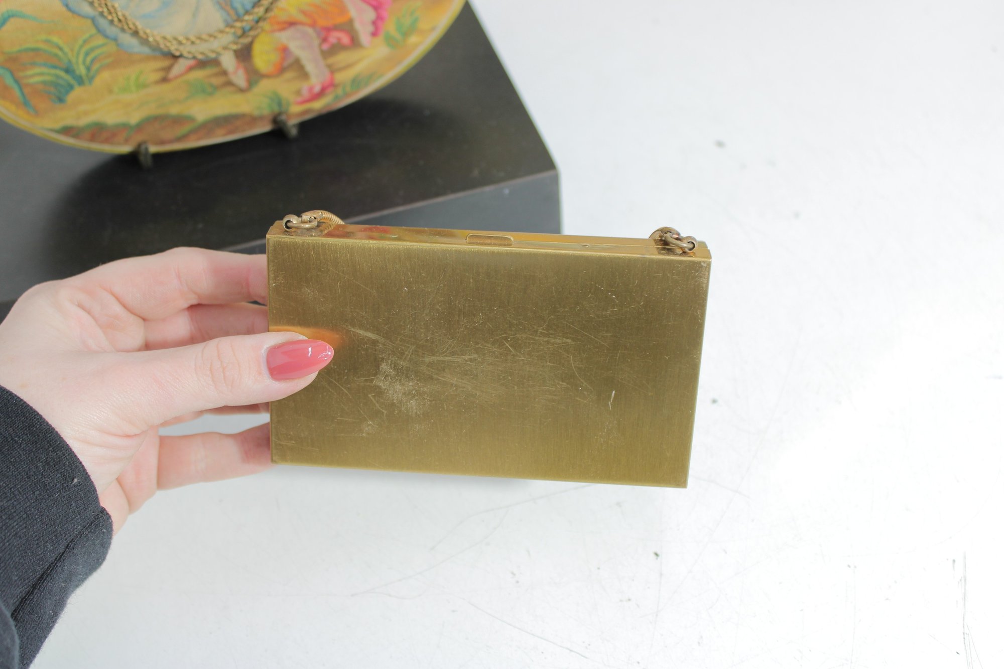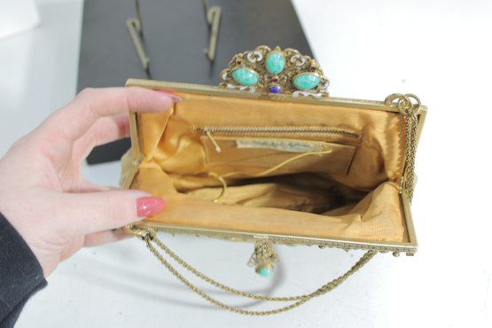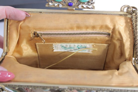 The purse has a graceful drape with a fine chain handle and a satin-lined interior with a zip pocket. Inside label reads “Marlo,” adding to its vintage appeal.