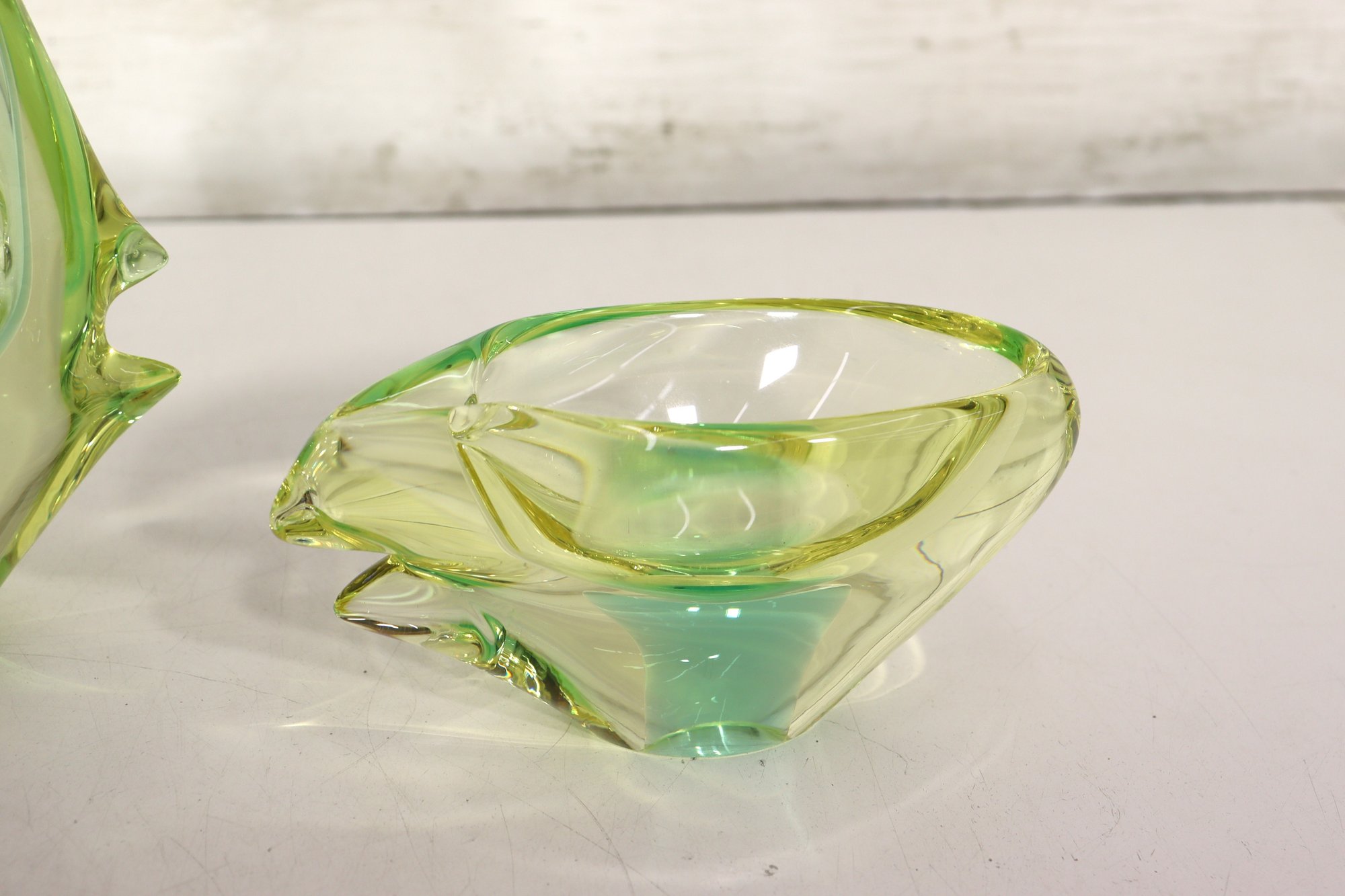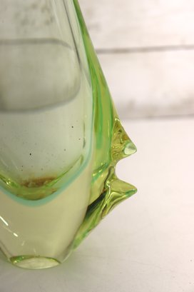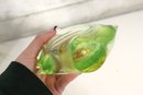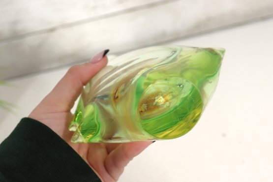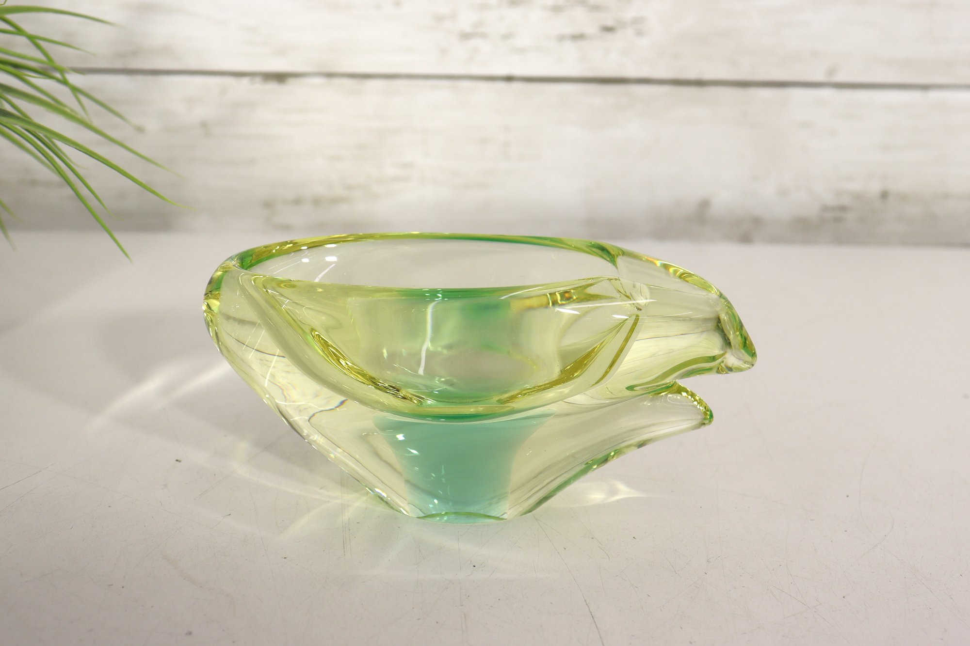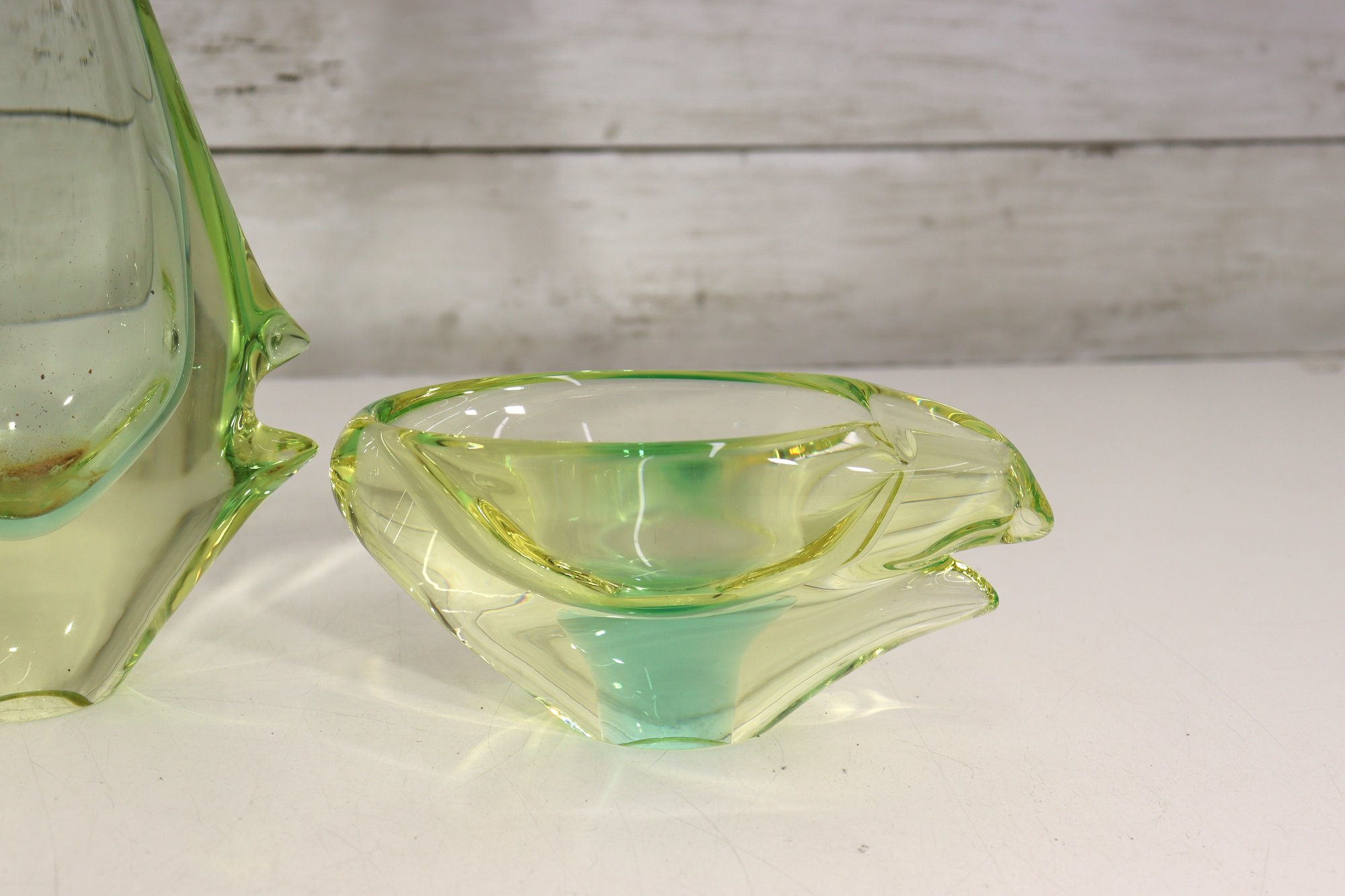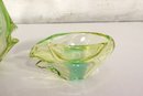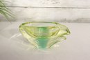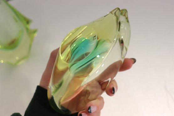 This stunning vintage art glass set includes a sculptural vase and matching bowl, both showcasing beautiful mid-century modern design and expert craftsmanship. Each piece features a mesmerizing green and yellow layered “Sommerso” style that shifts in tone depending on the light, giving off a glowing, almost ethereal quality.