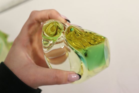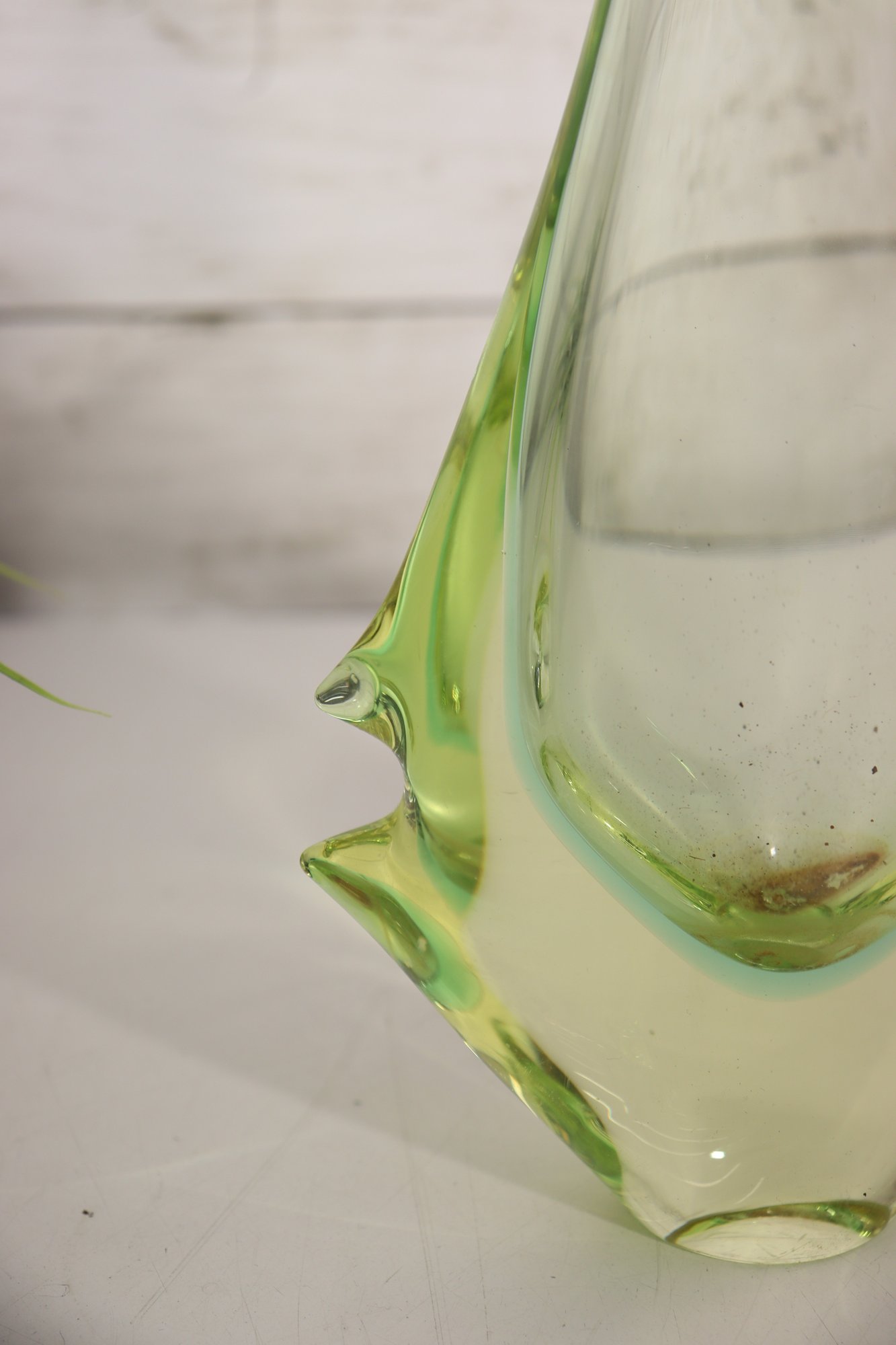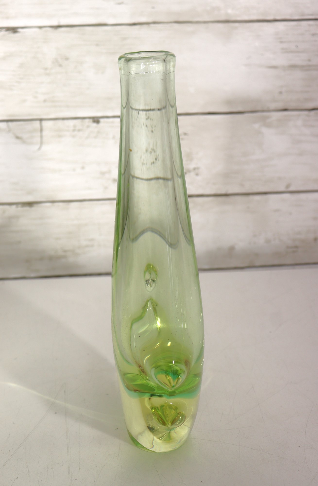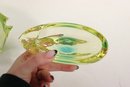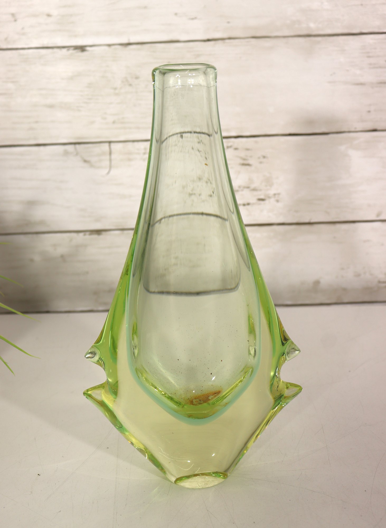 This stunning vintage art glass set includes a sculptural vase and matching bowl, both showcasing beautiful mid-century modern design and expert craftsmanship. Each piece features a mesmerizing green and yellow layered “Sommerso” style that shifts in tone depending on the light, giving off a glowing, almost ethereal quality.