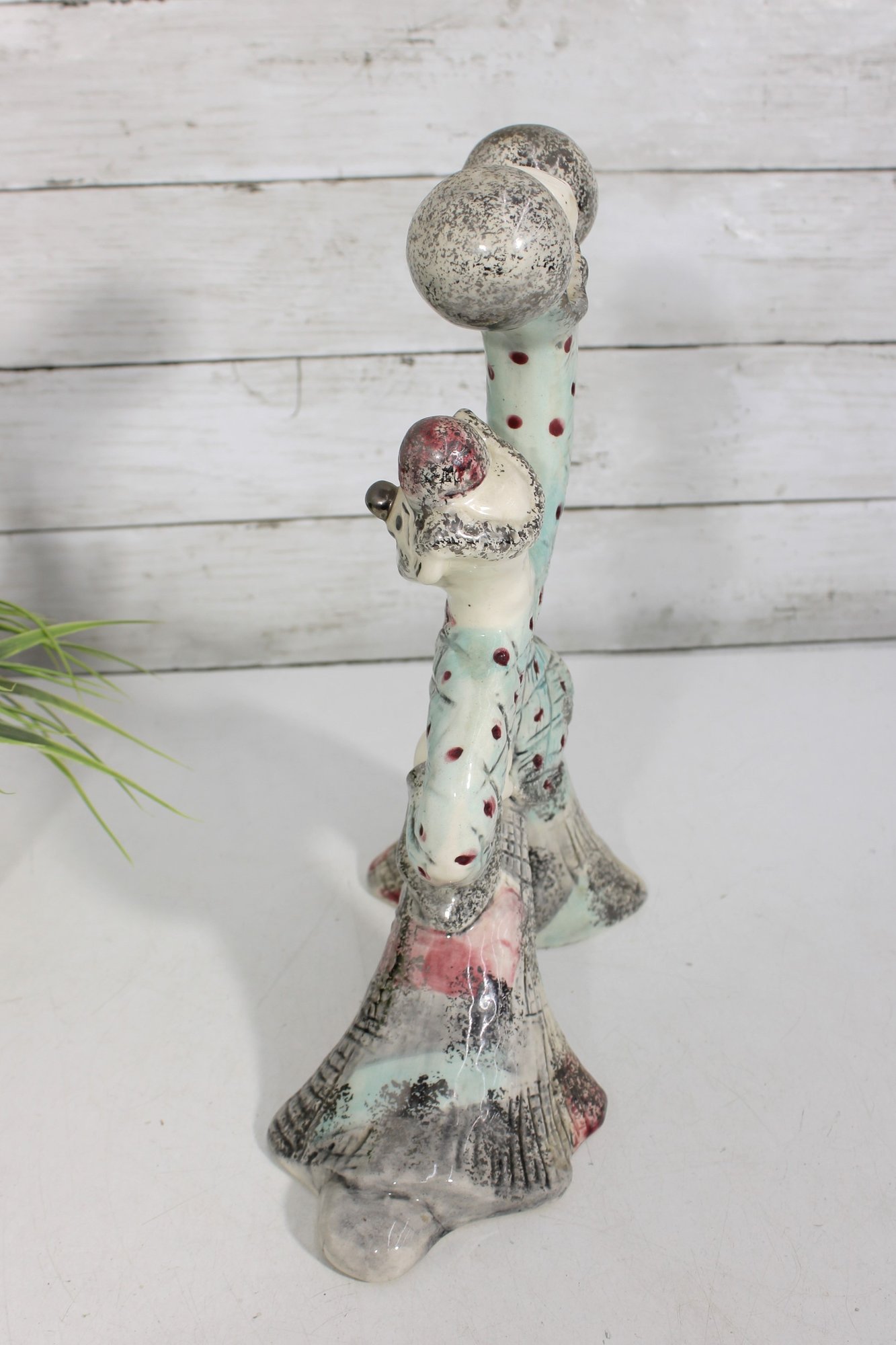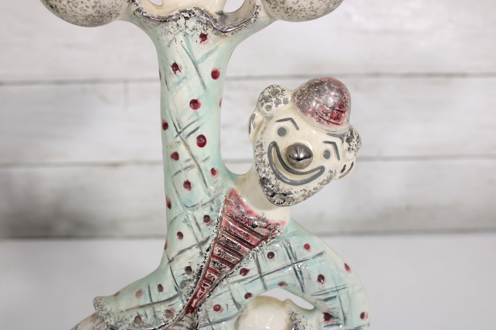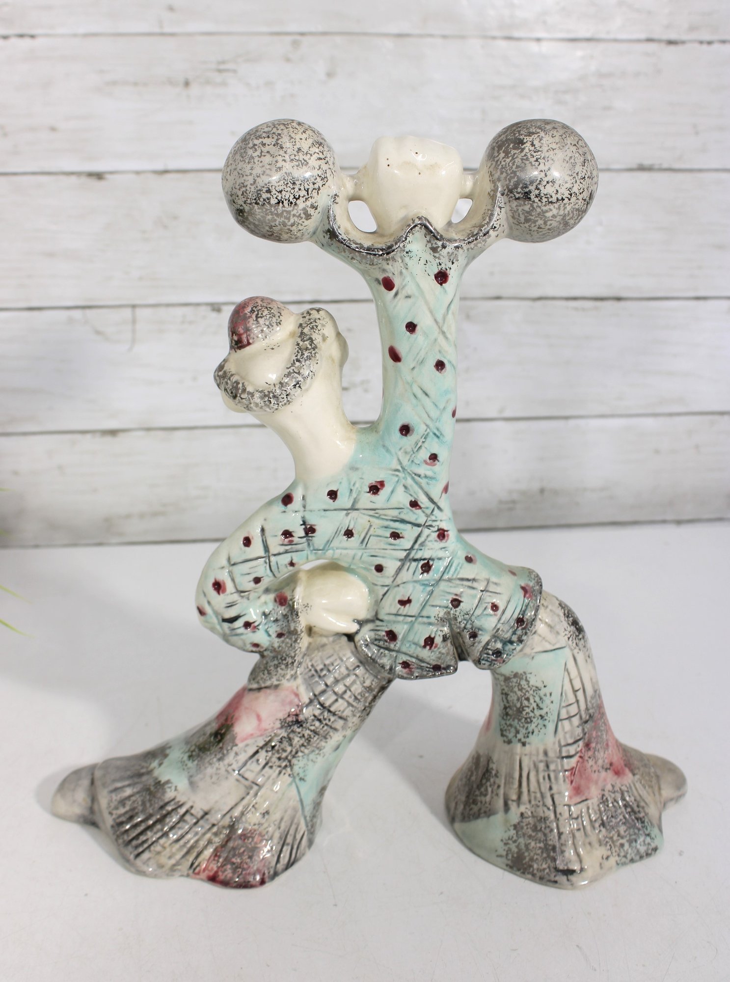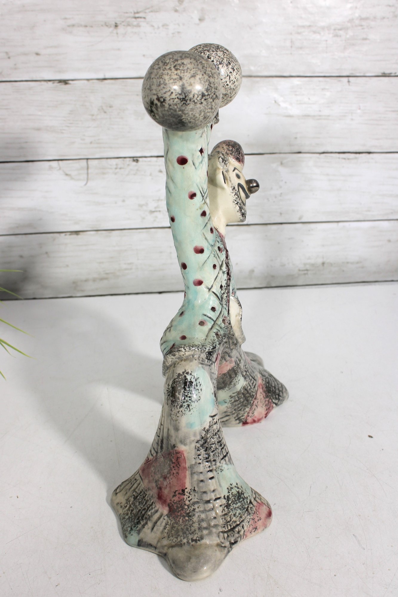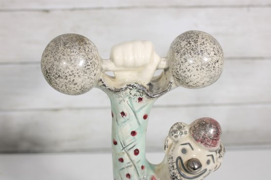 Unique vintage mid-century modern figural sculpture featuring a whimsical clown balancing two textured ball weights overhead. Standing approximately 12.5 inches tall, this eye-catching ceramic piece showcases playful design and detailed hand-painted decoration.