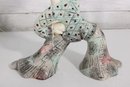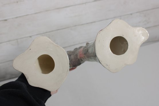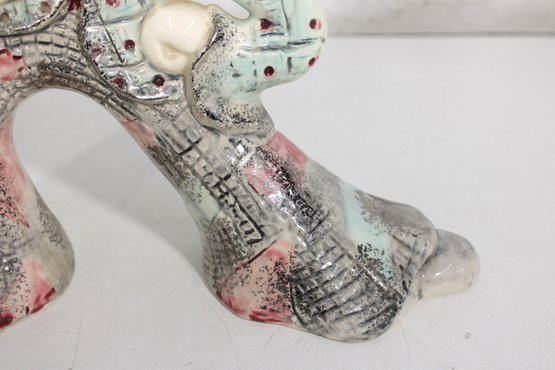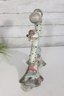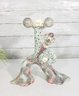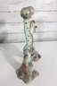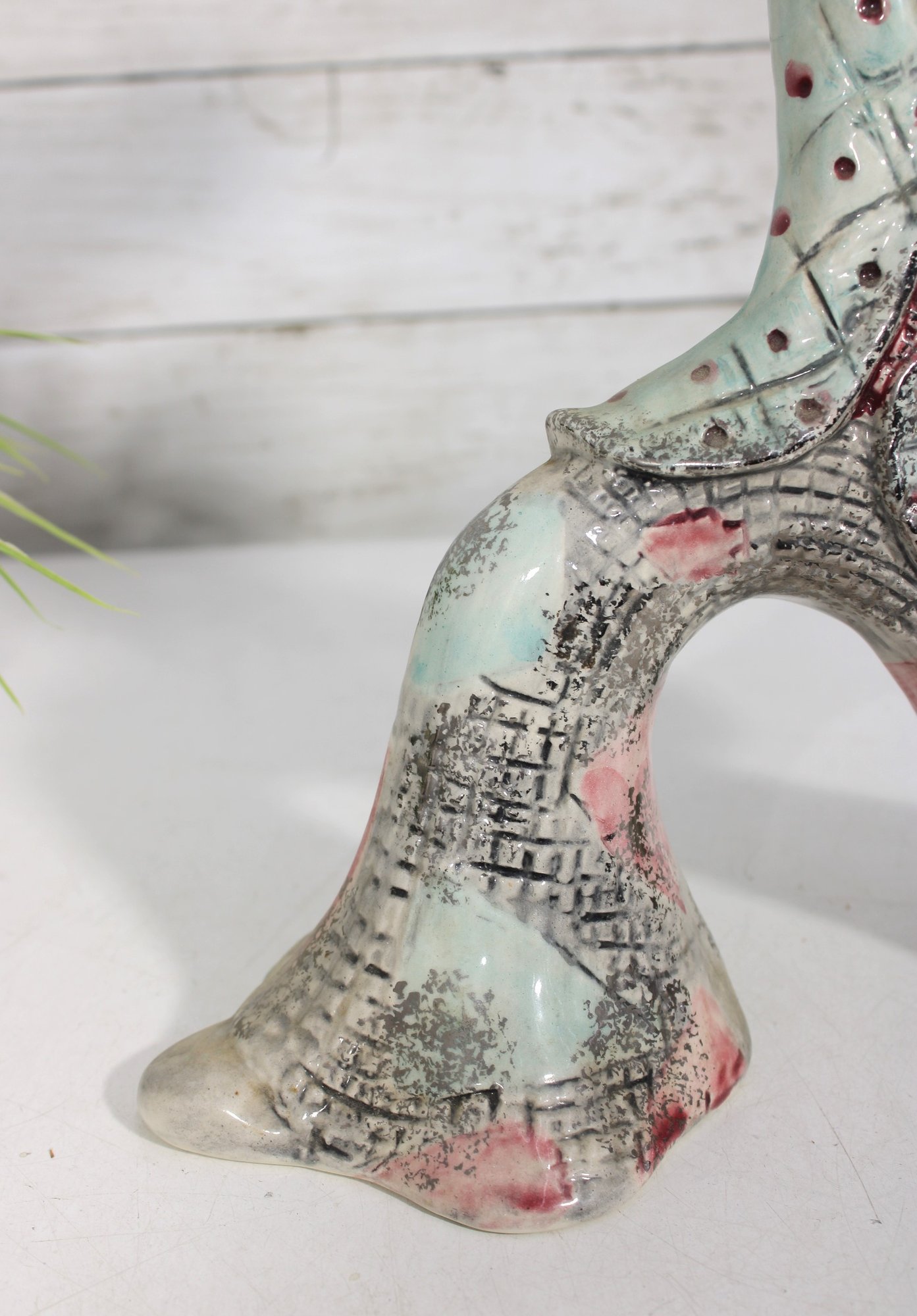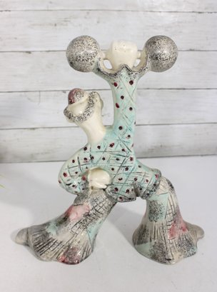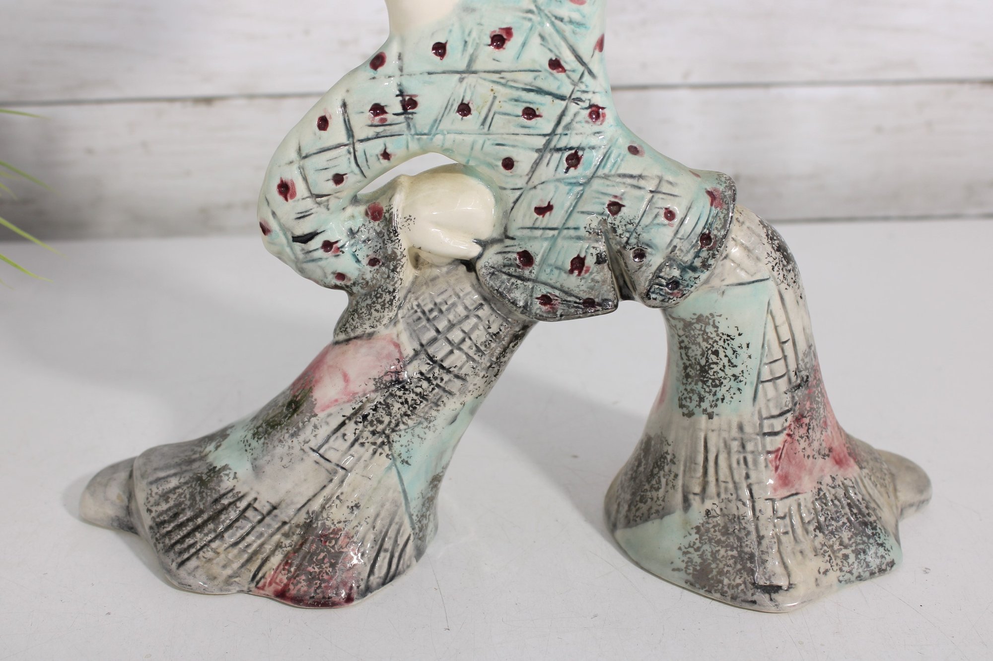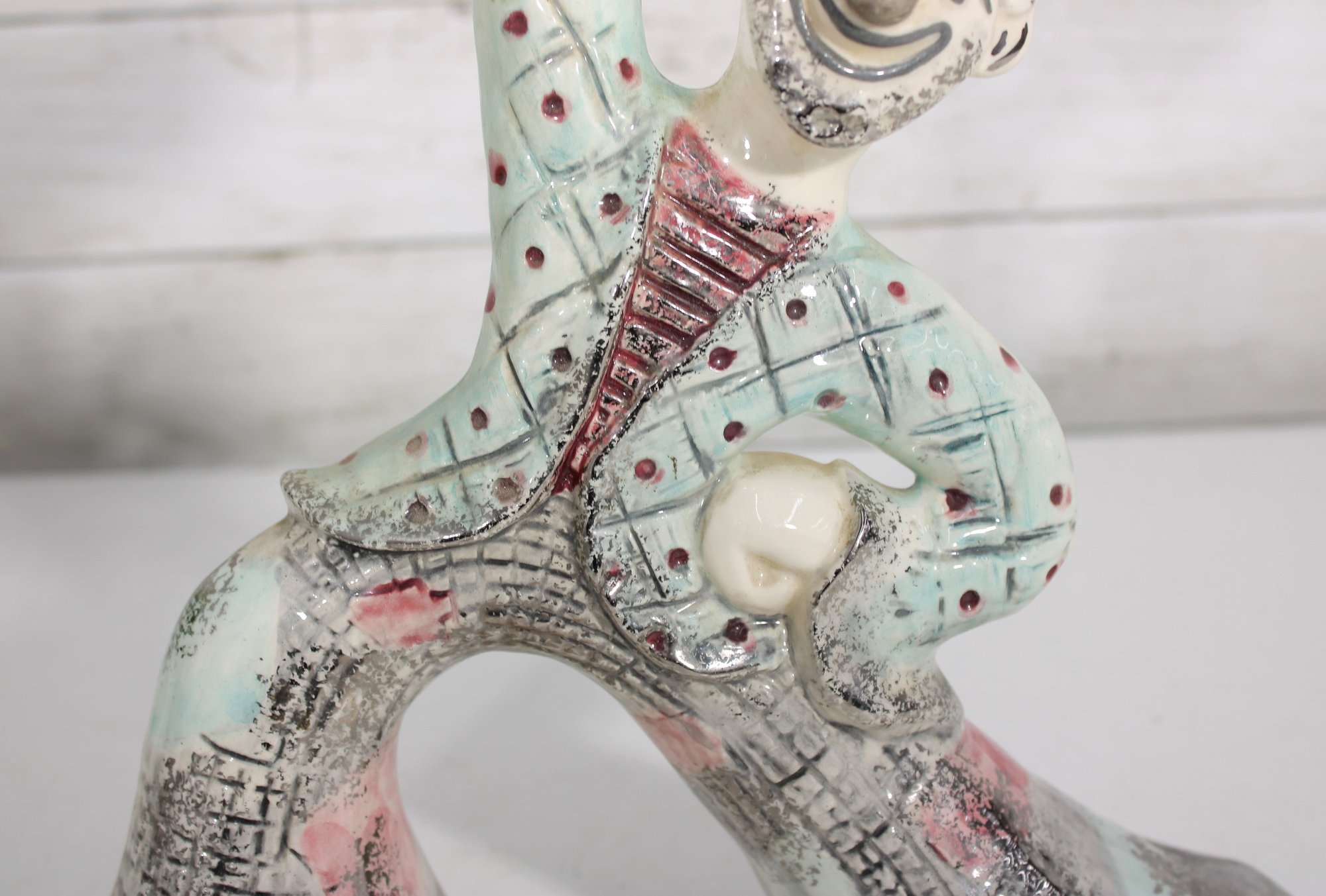 Unique vintage mid-century modern figural sculpture featuring a whimsical clown balancing two textured ball weights overhead. Standing approximately 12.5 inches tall, this eye-catching ceramic piece showcases playful design and detailed hand-painted decoration.