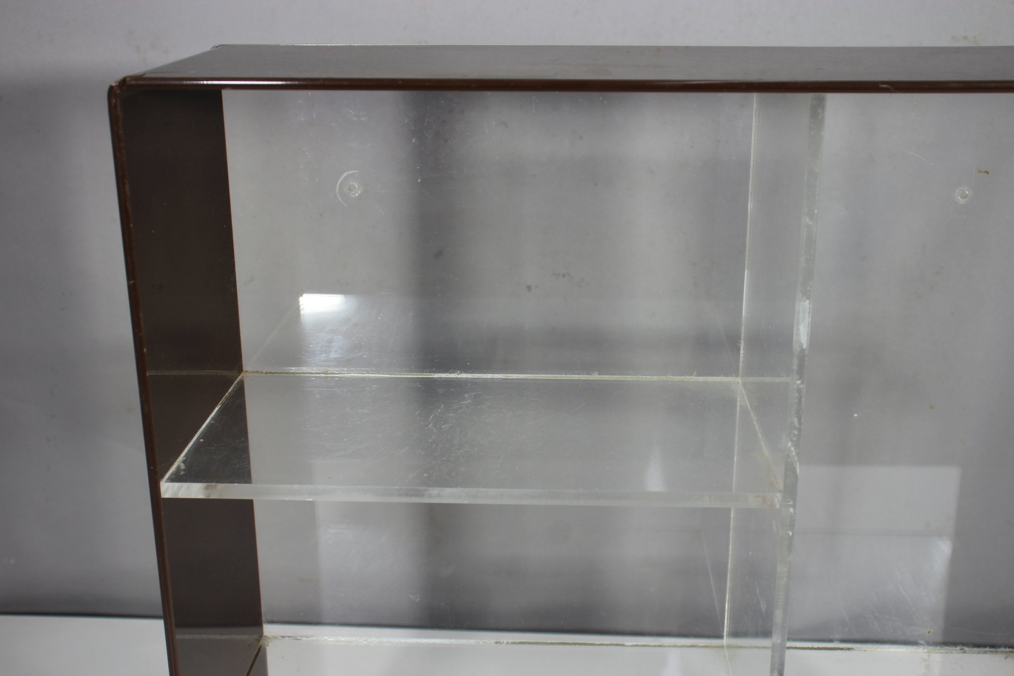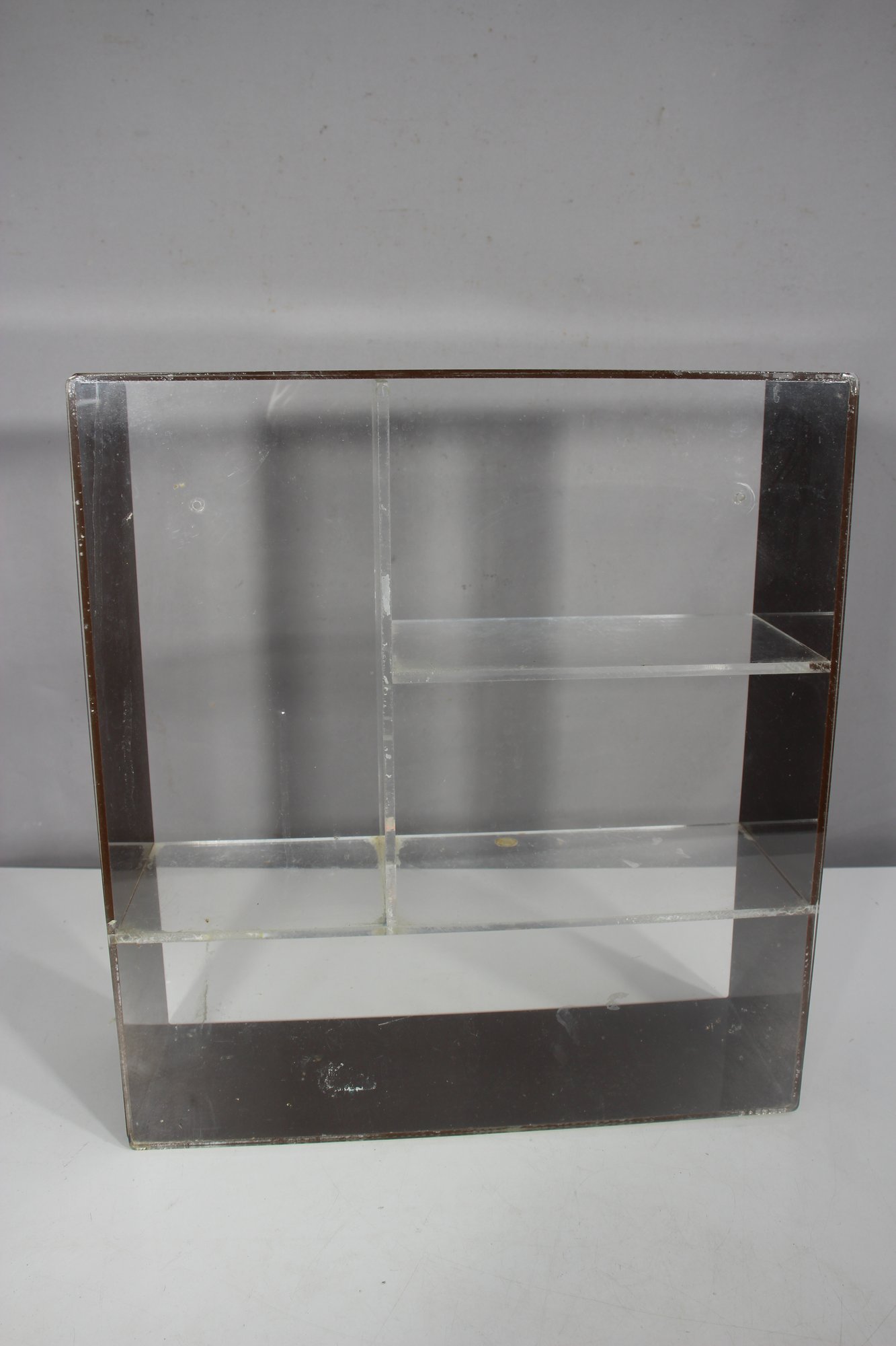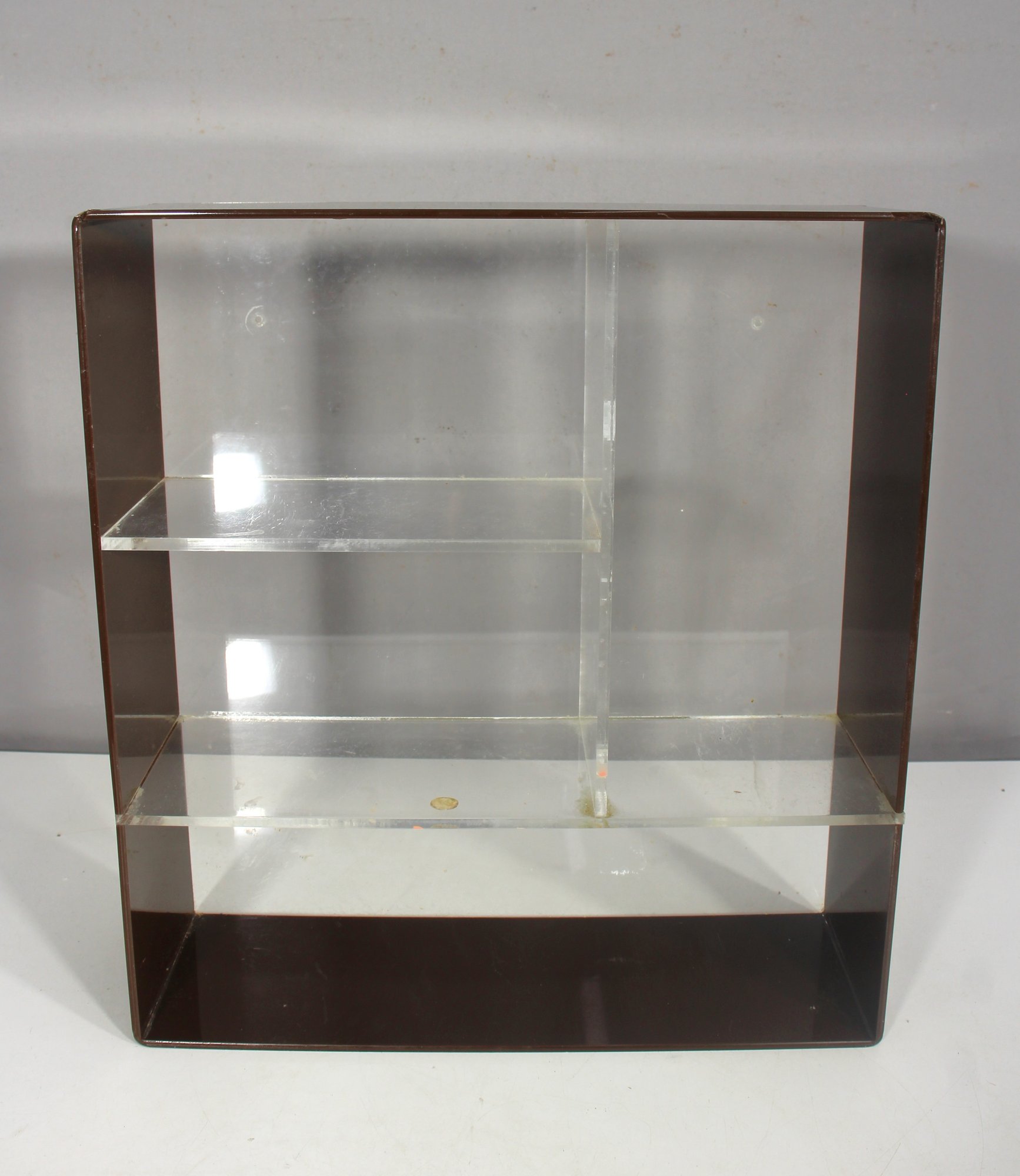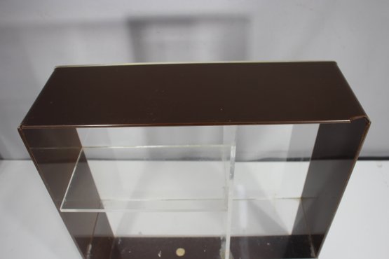 A sleek and minimalist vintage acrylic wall shelf, perfect for displaying collectibles, books, or decor. Featuring a clear and smoked acrylic frame, this piece embodies a classic mid-century modern aesthetic with clean lines and a simple yet stylish design.Ideal for wall mounting or tabletop display in any modern, retro, or minimalist space