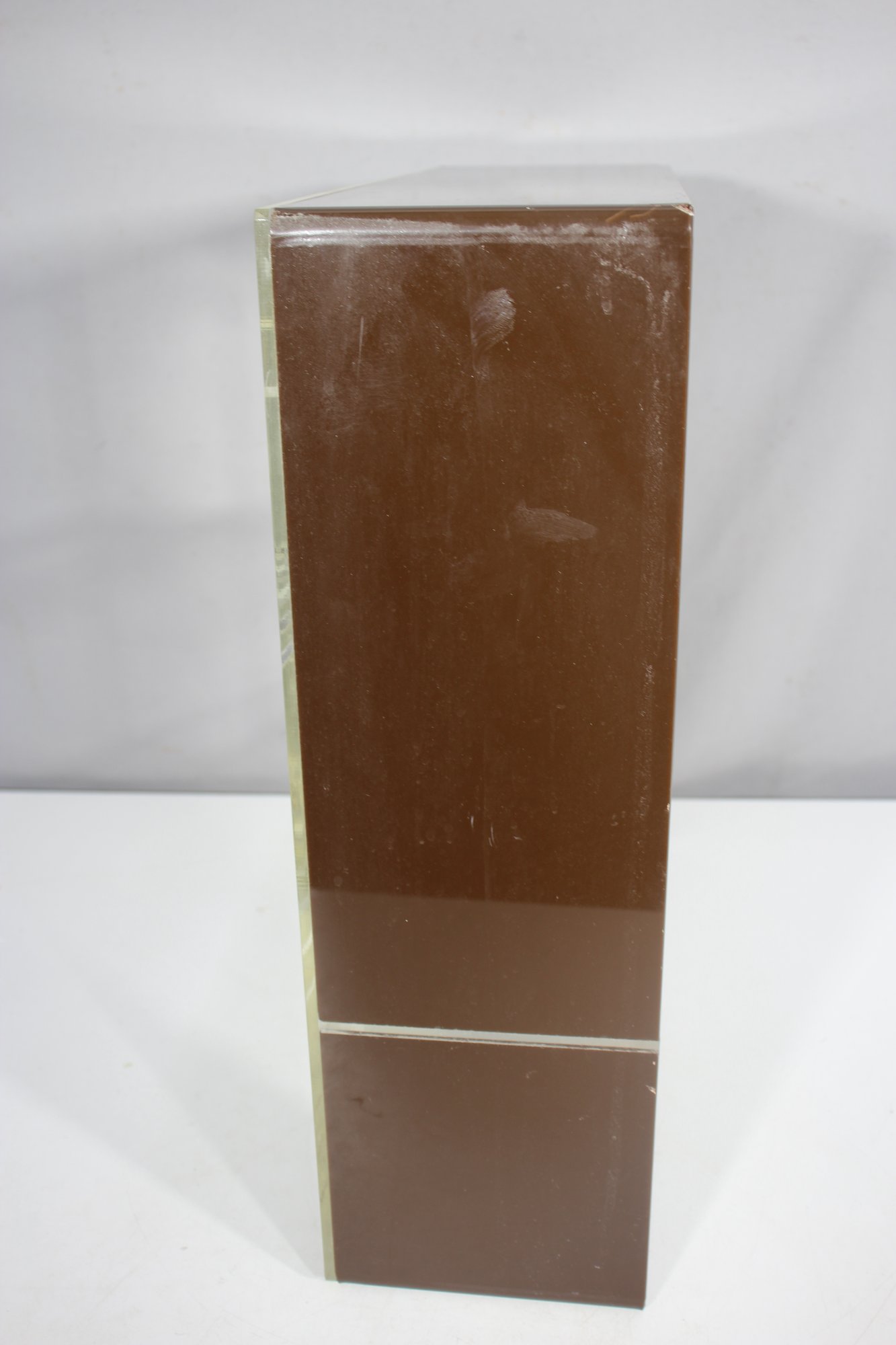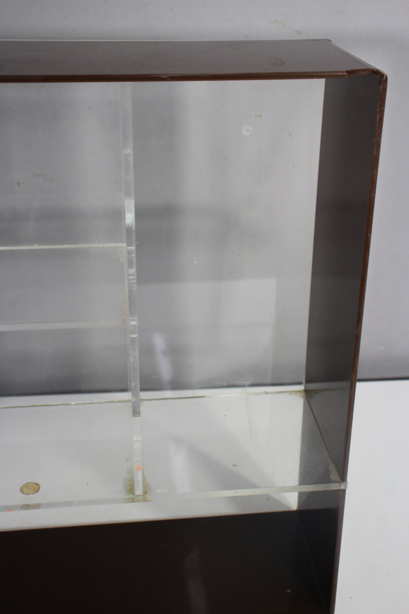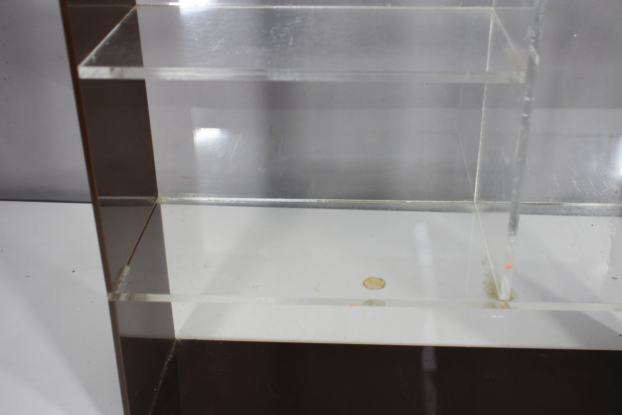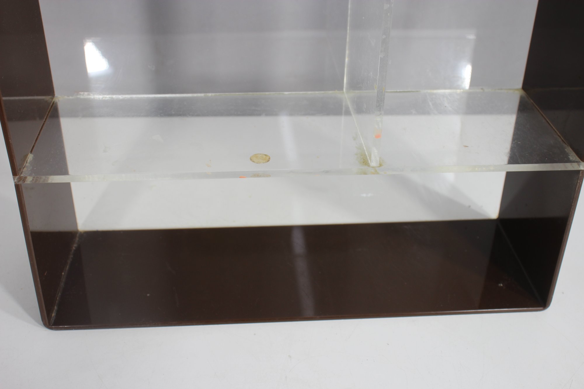 A sleek and minimalist vintage acrylic wall shelf, perfect for displaying collectibles, books, or decor. Featuring a clear and smoked acrylic frame, this piece embodies a classic mid-century modern aesthetic with clean lines and a simple yet stylish design.Ideal for wall mounting or tabletop display in any modern, retro, or minimalist space