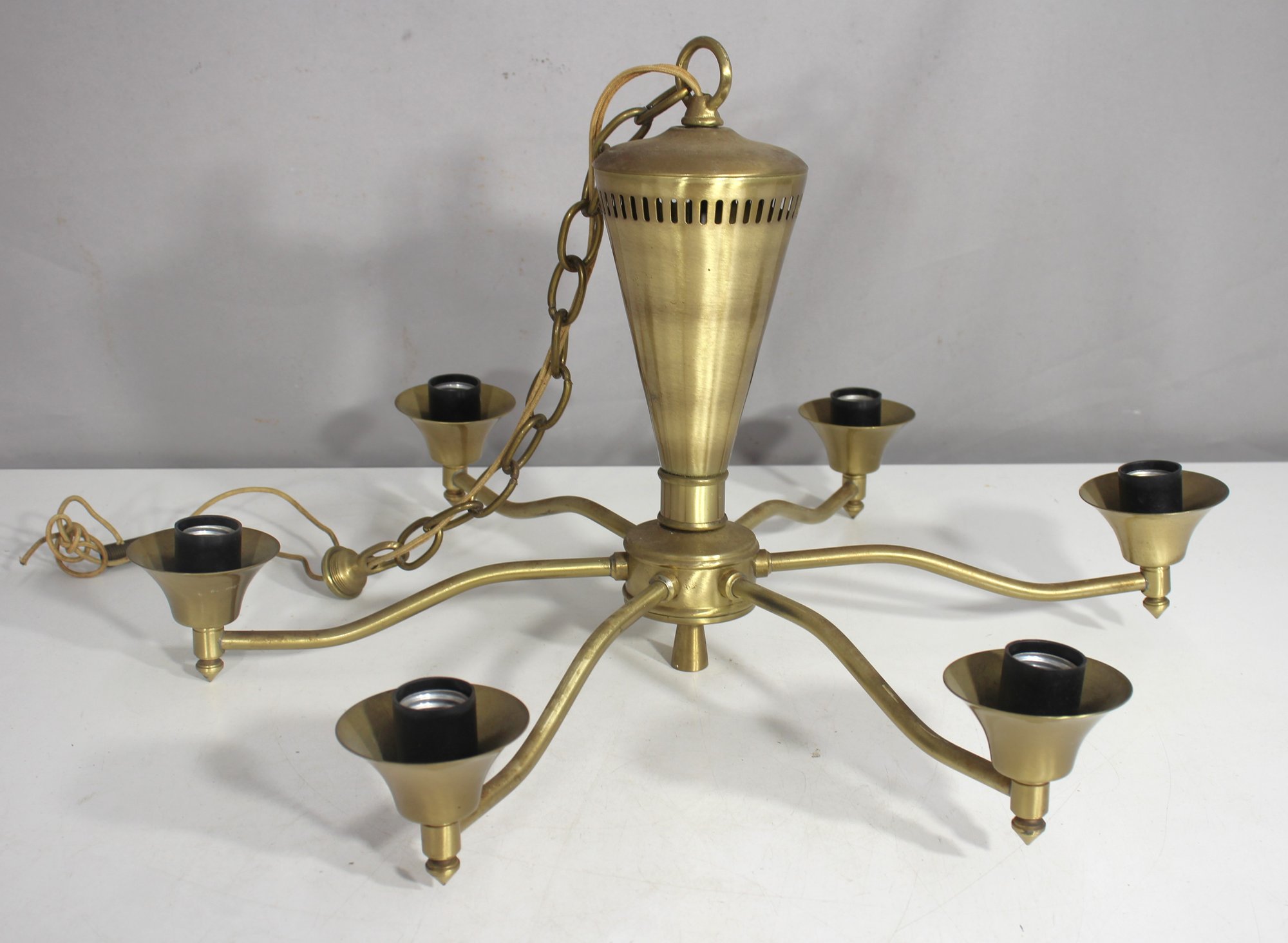 This vintage mid-century modern brass chandelier is a sleek and elegant lighting fixture featuring six gracefully curved arms with bell-shaped light holders. Measuring 12 inches high and 21 inches wide, this classic piece has a timeless brass finish and comes with a hanging chain and canopy.