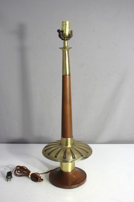 A striking vintage mid-century modern table lamp featuring a sleek brass and wood design. The lamp showcases a tapered column with a flared brass accent, adding a touch of elegance and timeless appeal. Fully functional with updated wiring and includes a working bulb. Perfect for any retro-inspired or modern decor setting.