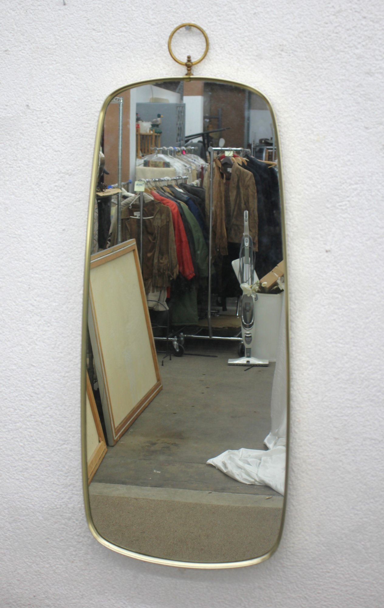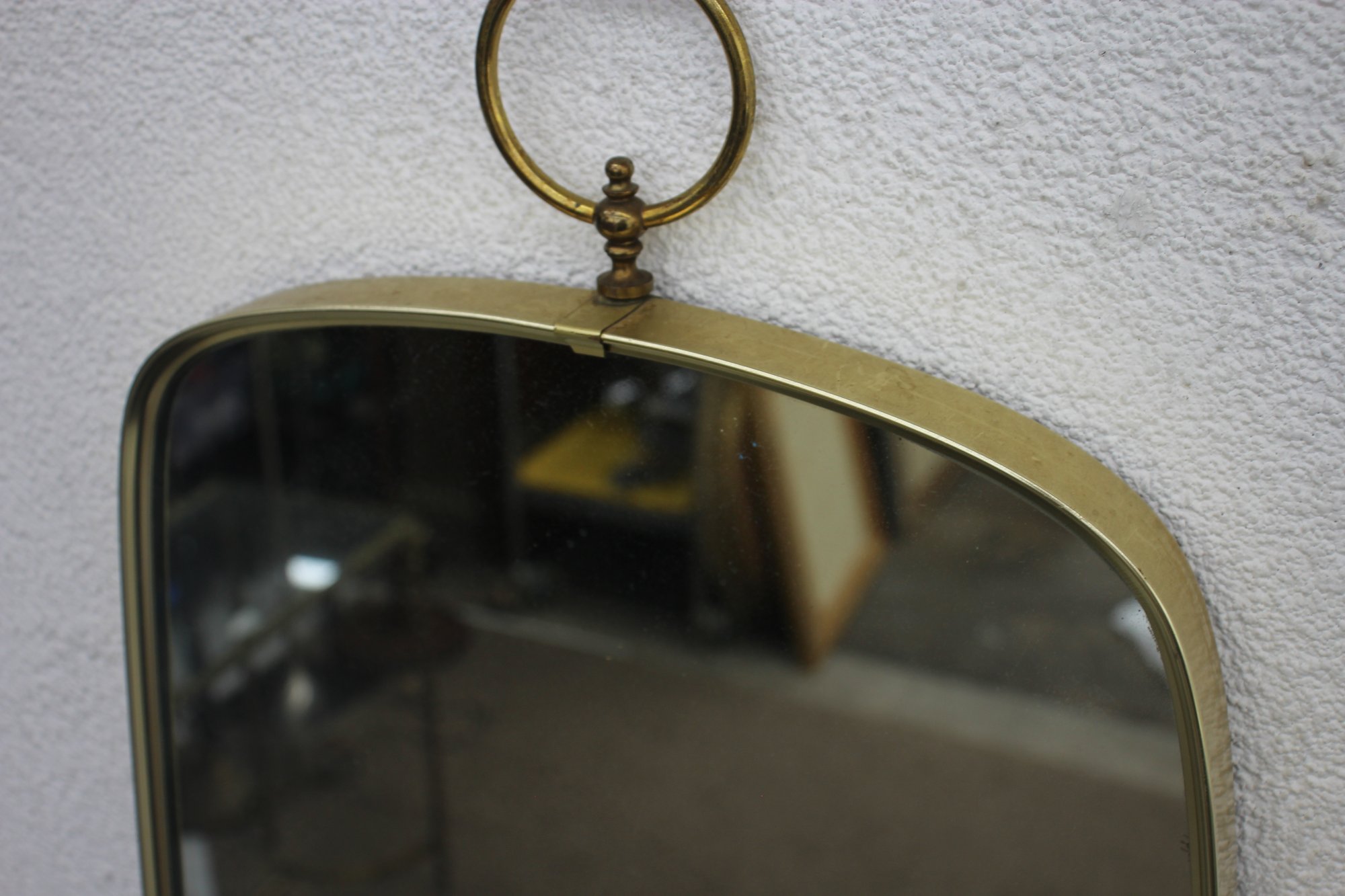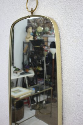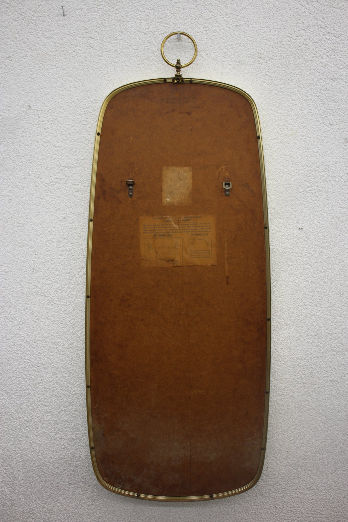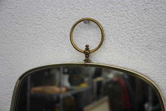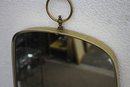 this stunning vintage mid-century modern wall mirror. Featuring a sleek brass frame with a gently curved rectangular shape, this mirror embodies the sophisticated simplicity of classic mid-century design. The decorative brass ring at the top adds a unique and stylish touch, making it a standout piece.