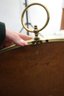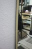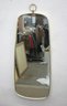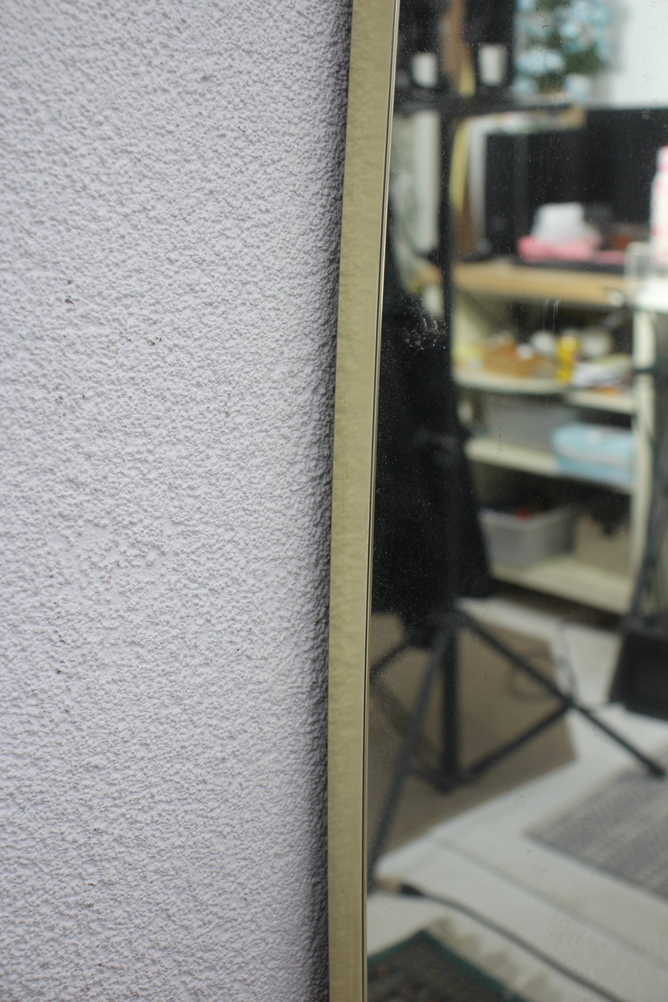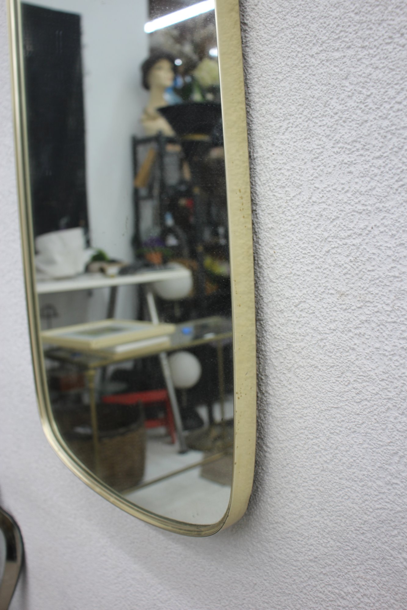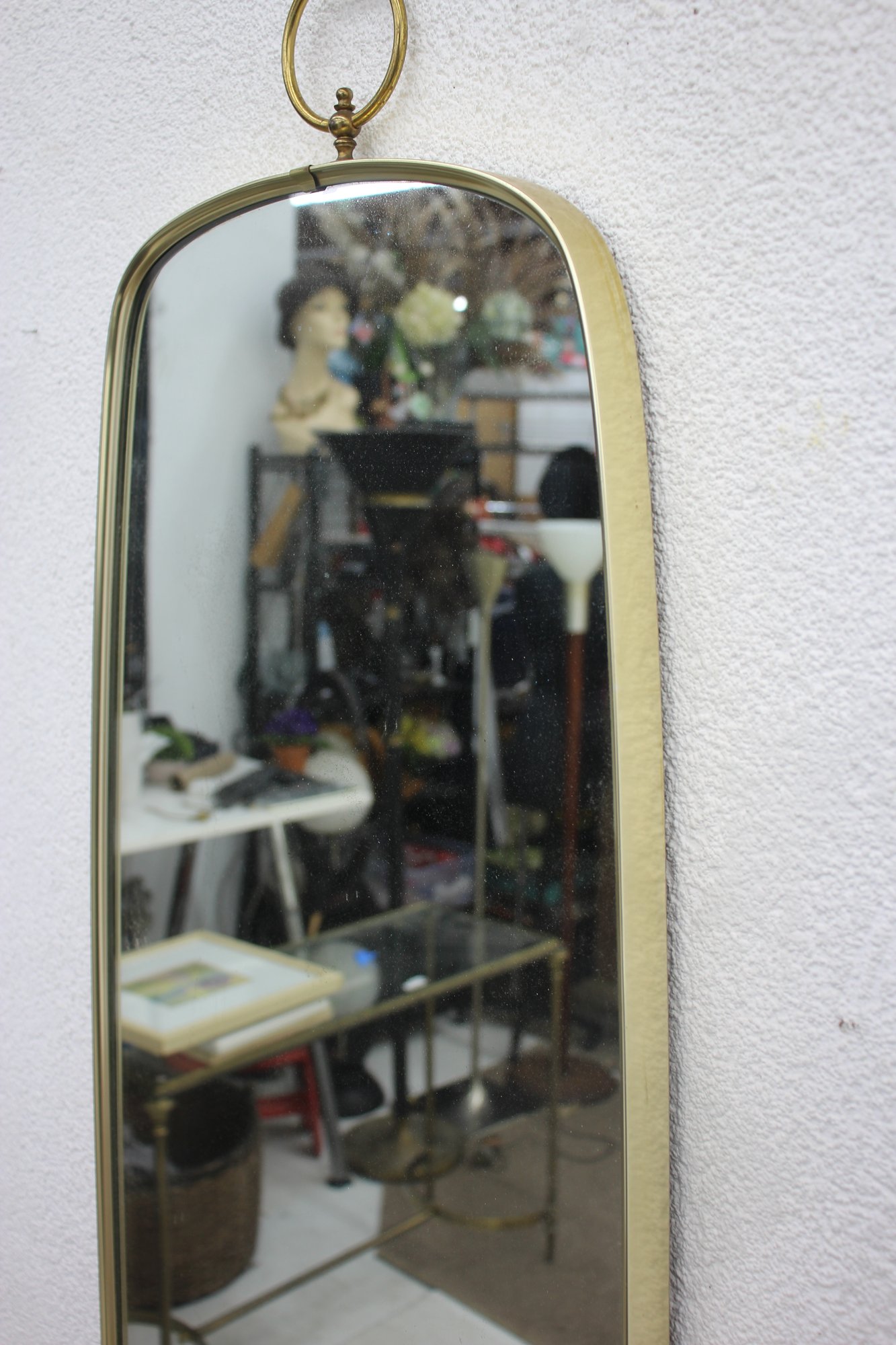 this stunning vintage mid-century modern wall mirror. Featuring a sleek brass frame with a gently curved rectangular shape, this mirror embodies the sophisticated simplicity of classic mid-century design. The decorative brass ring at the top adds a unique and stylish touch, making it a standout piece.