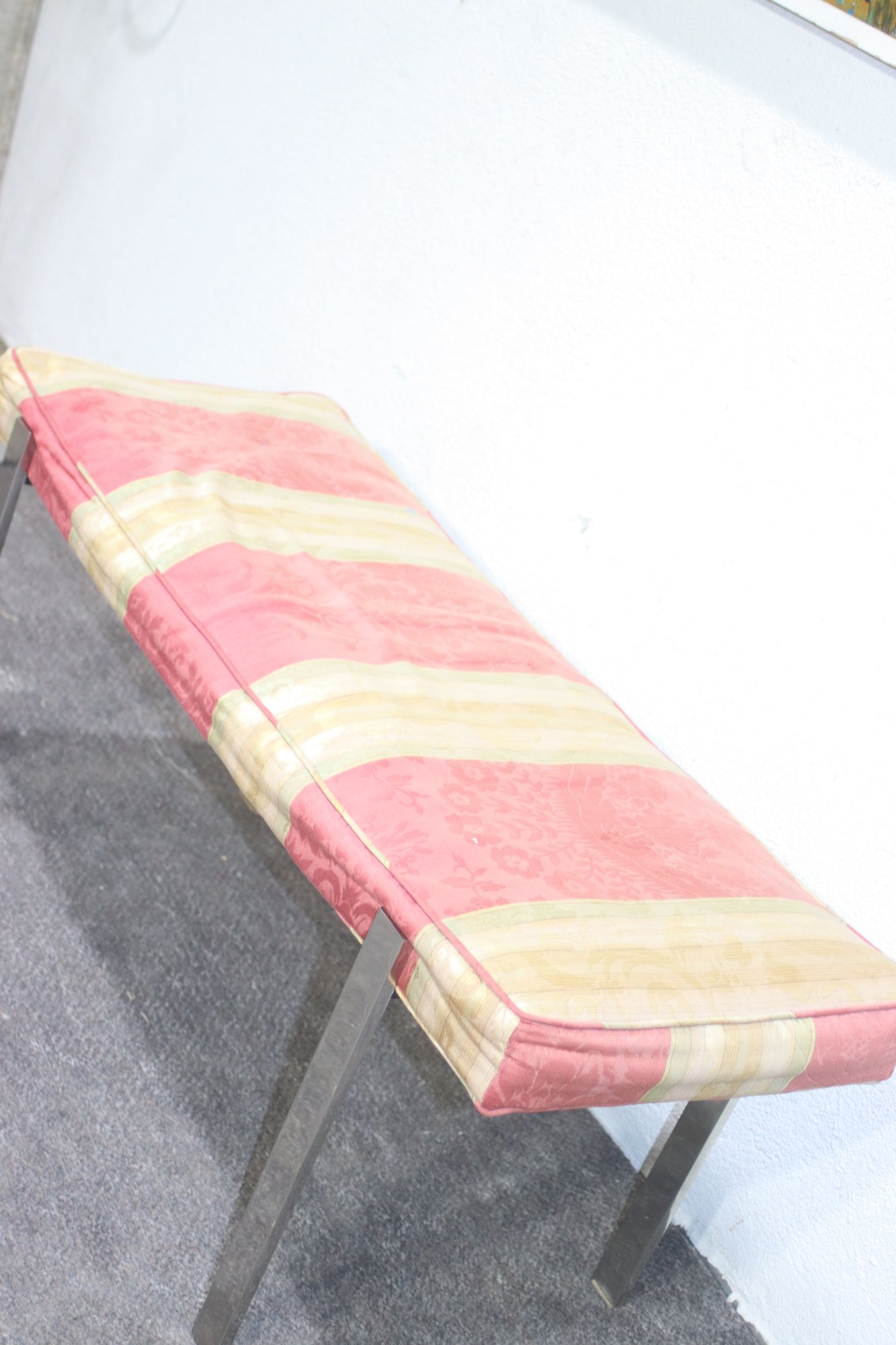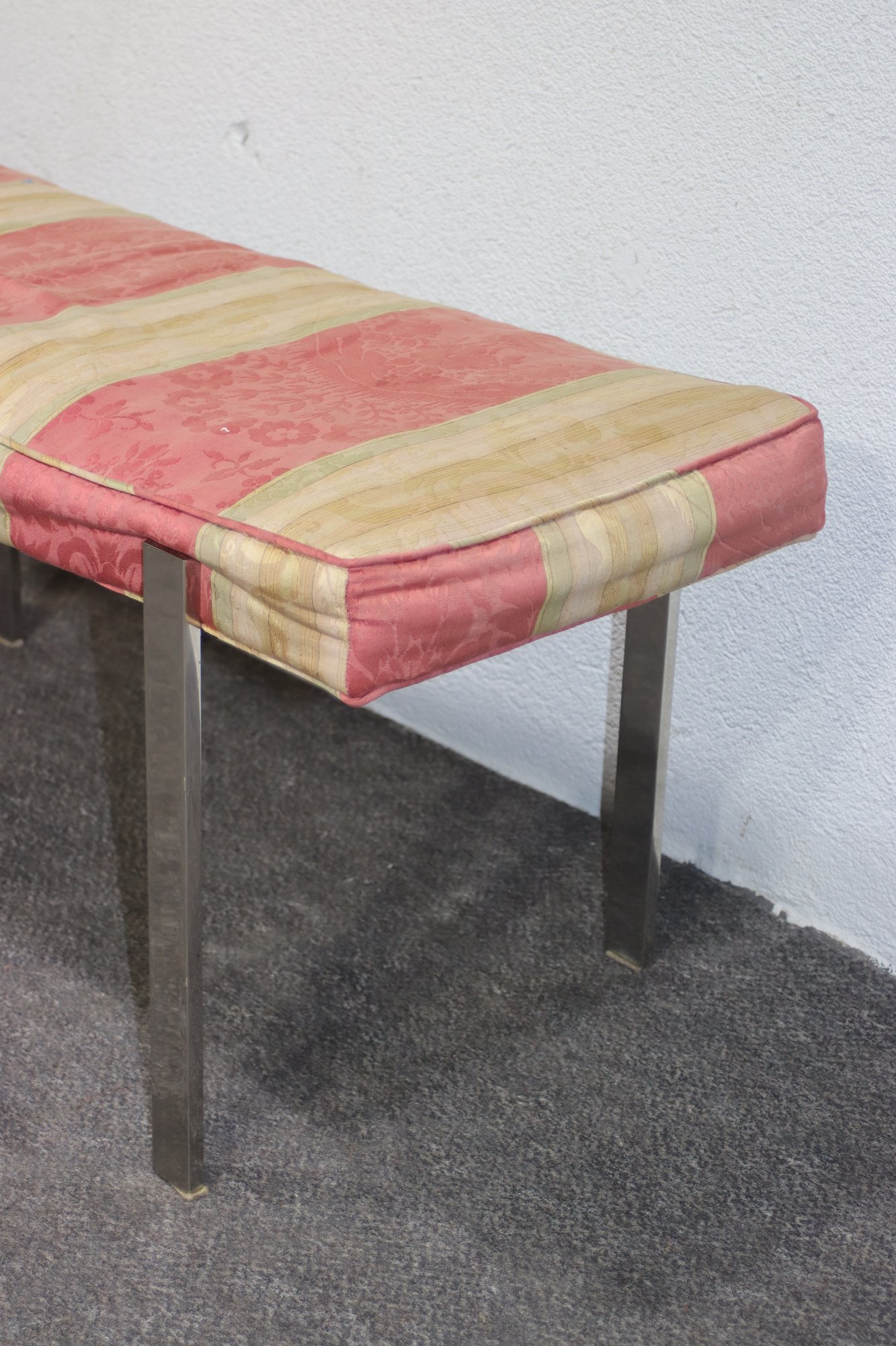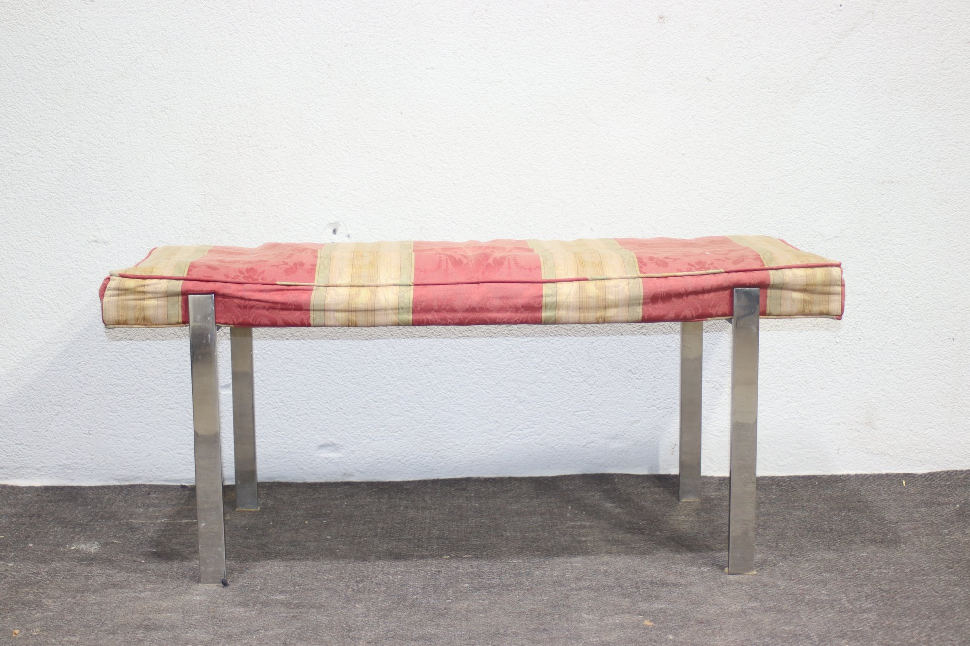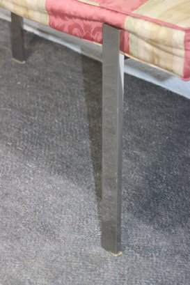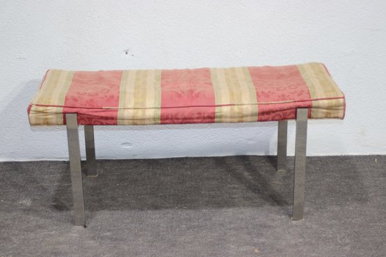 vintage mid-century modern bench features a sleek chrome metal frame with a minimalist design, making it a perfect accent piece for any contemporary, industrial, or modern interior. The cushioned seat showcases a classic striped fabric but needs reupholstering, allowing you to customize it to your personal style.