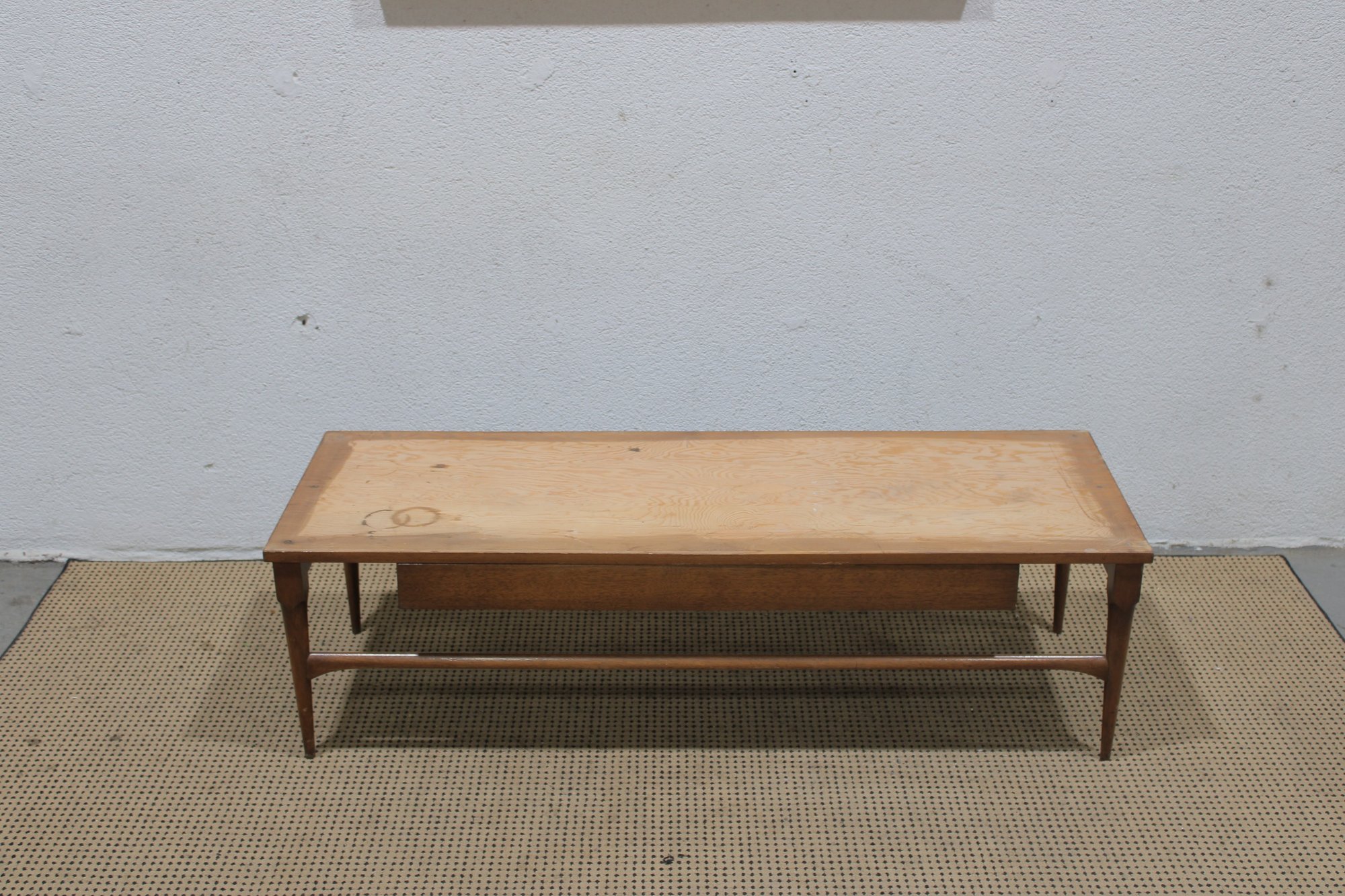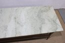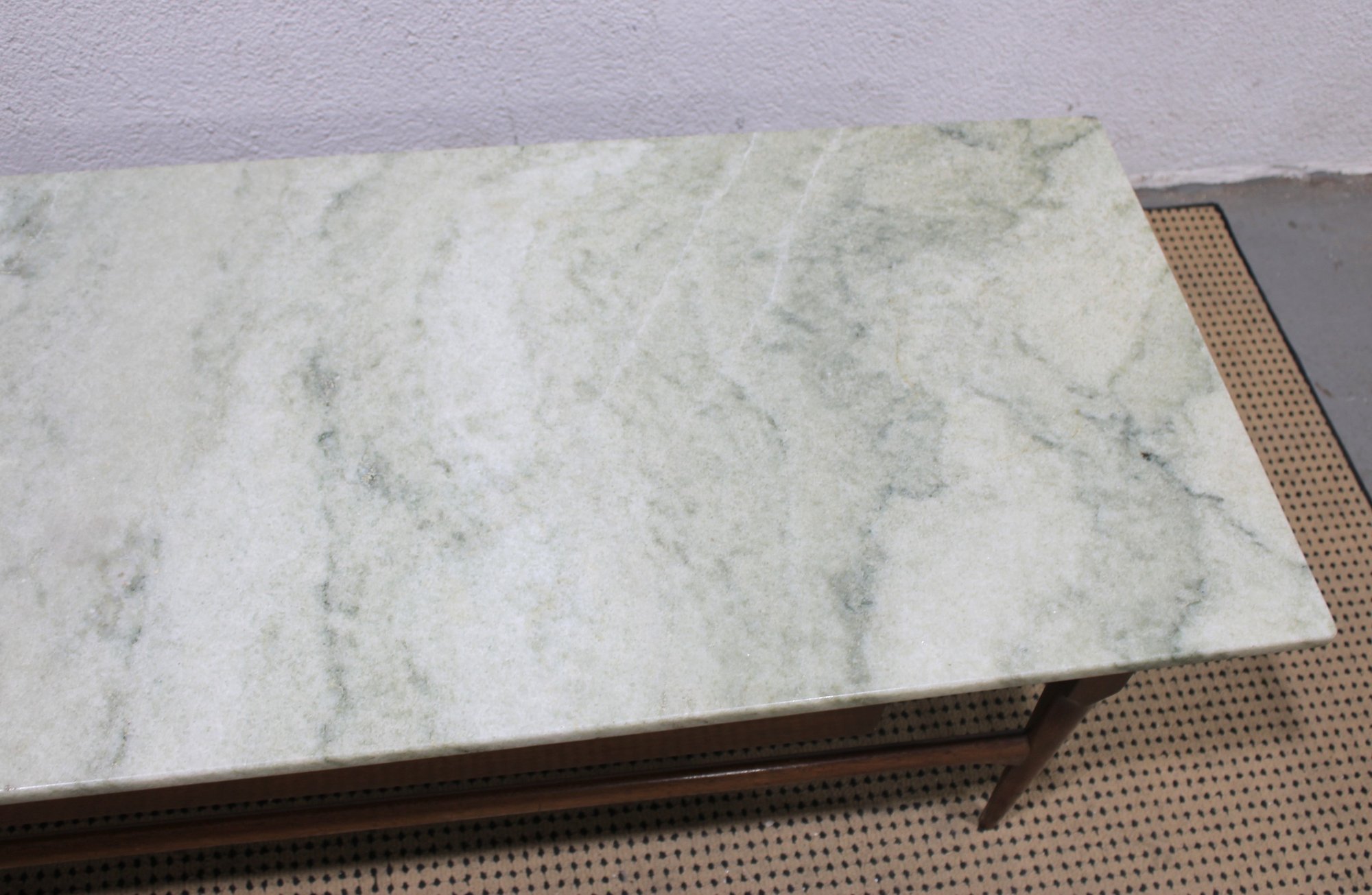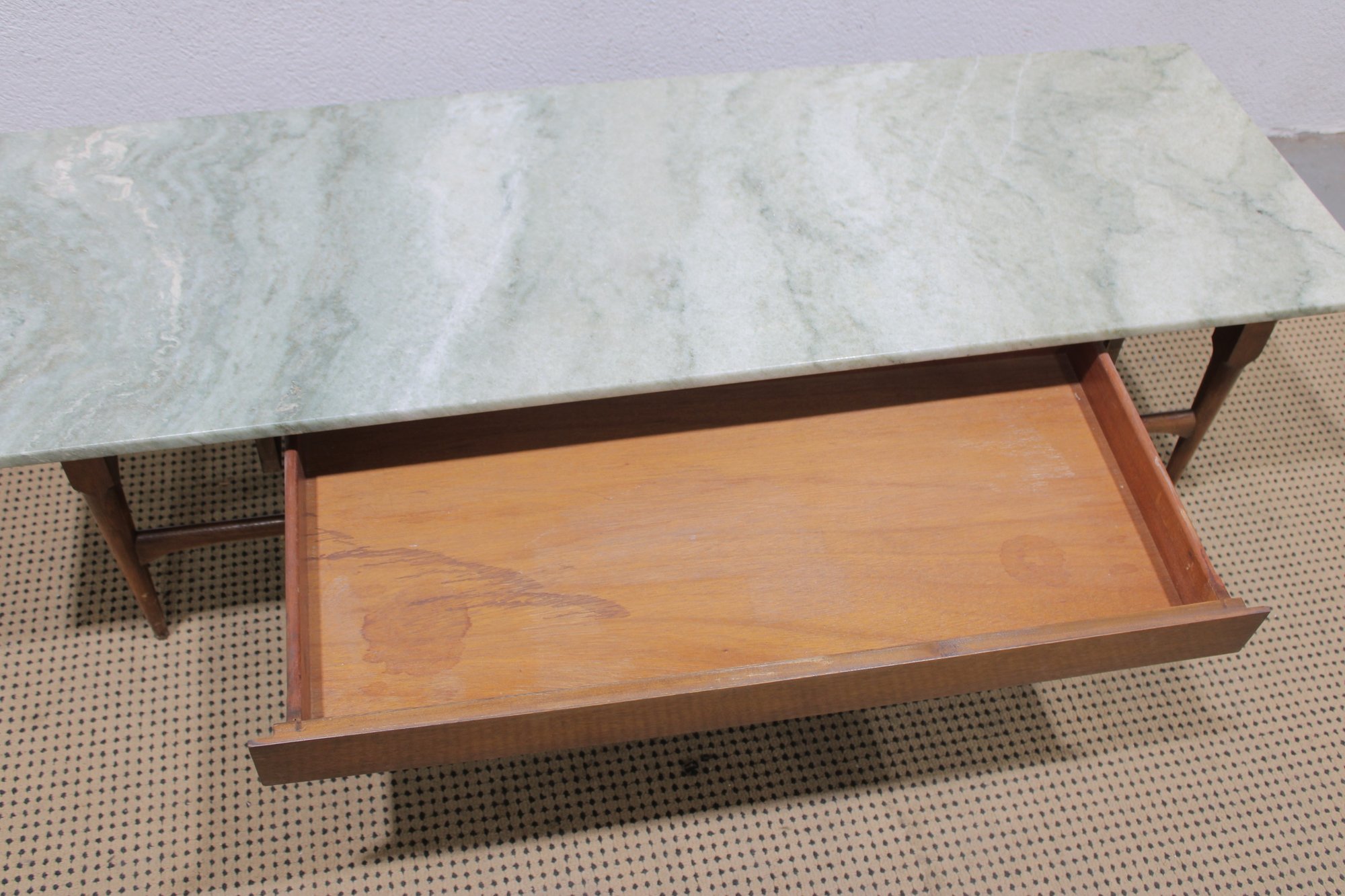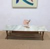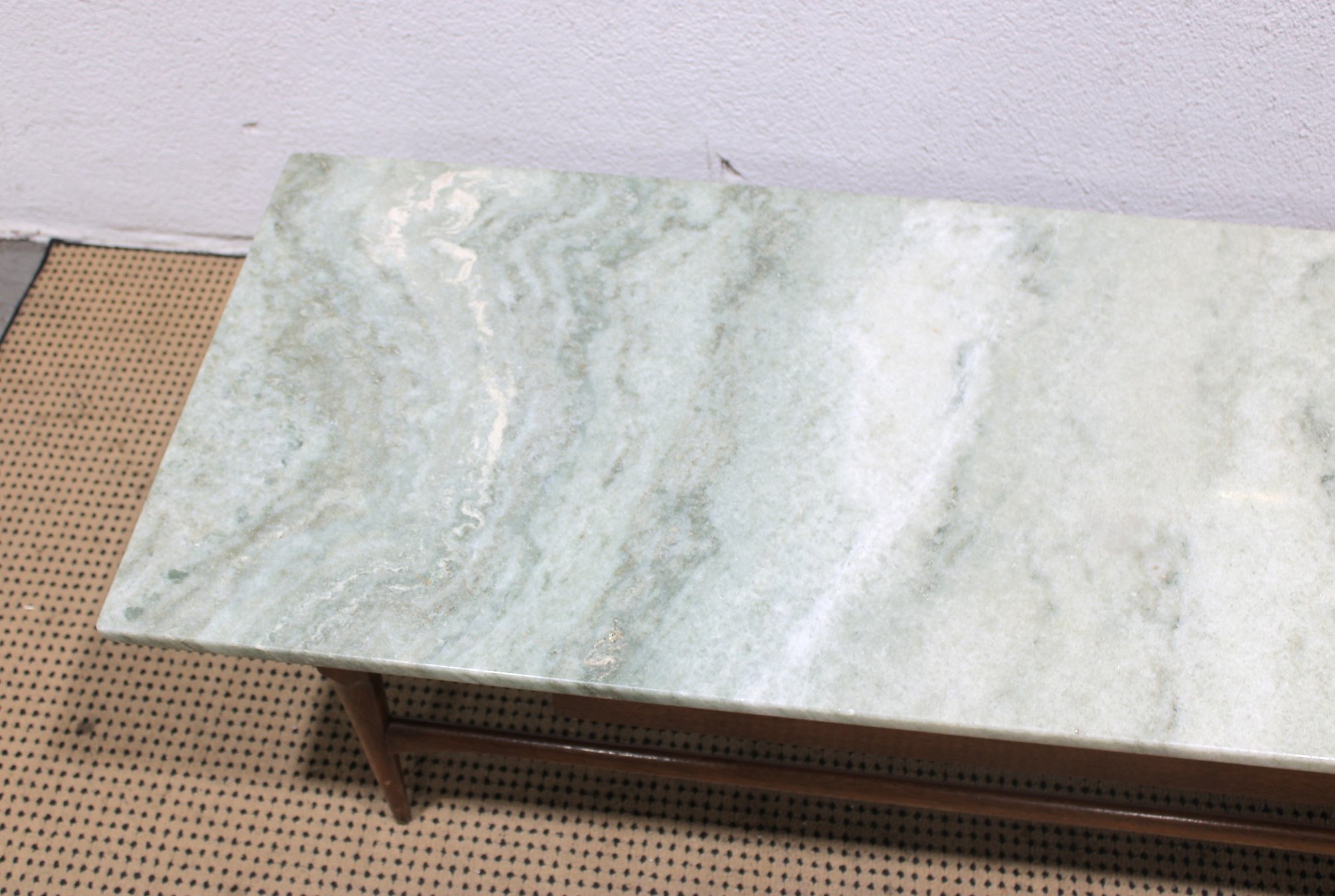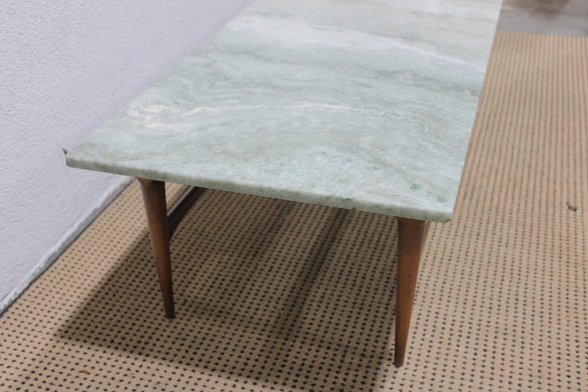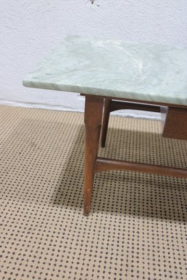 Classic vintage mid-century modern coffee table featuring a beautiful marble top and warm wood base. This timeless design showcases clean lines, sleek tapered legs, and a minimalist profile that embodies true MCM style.