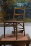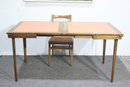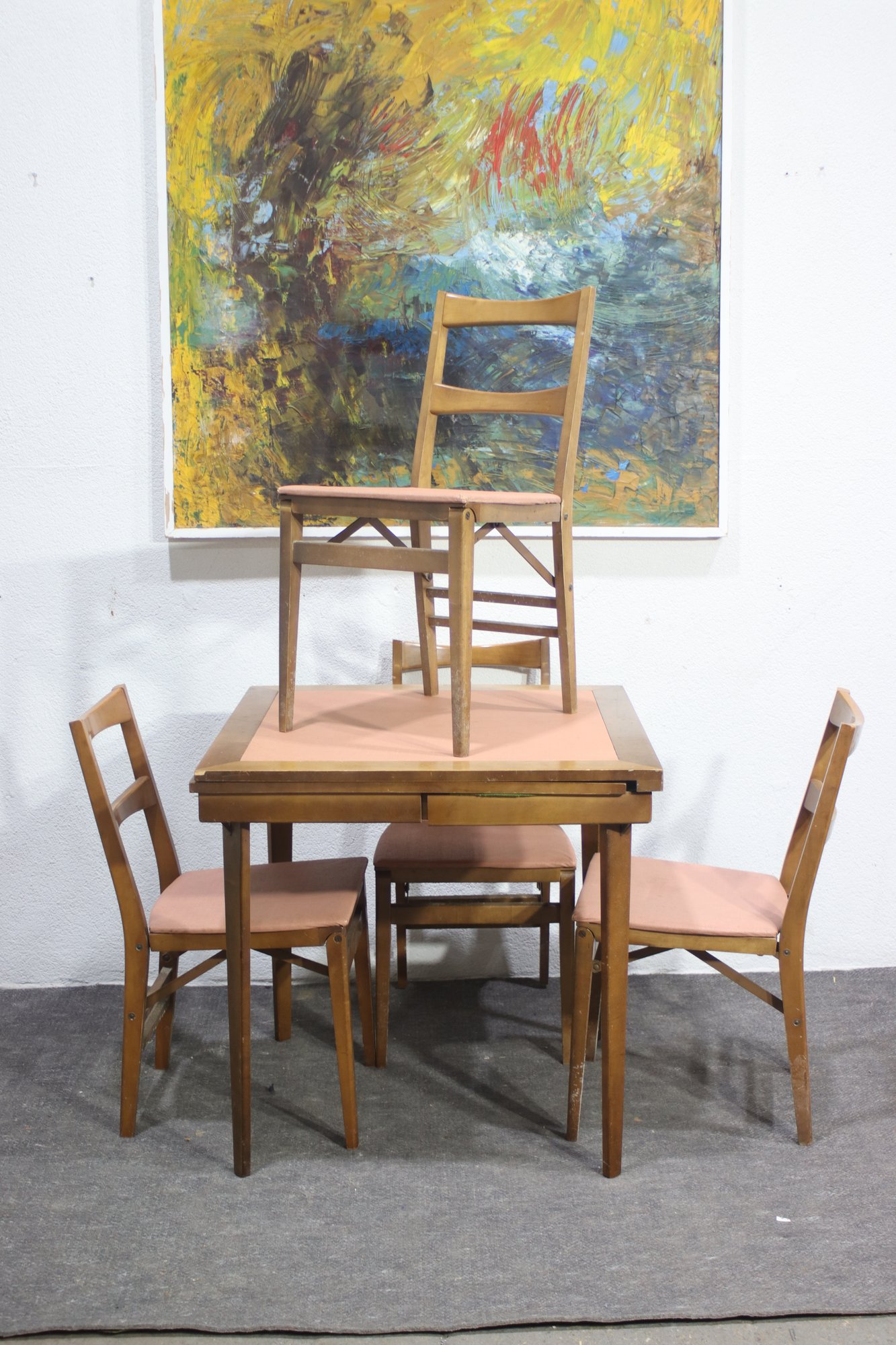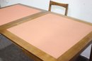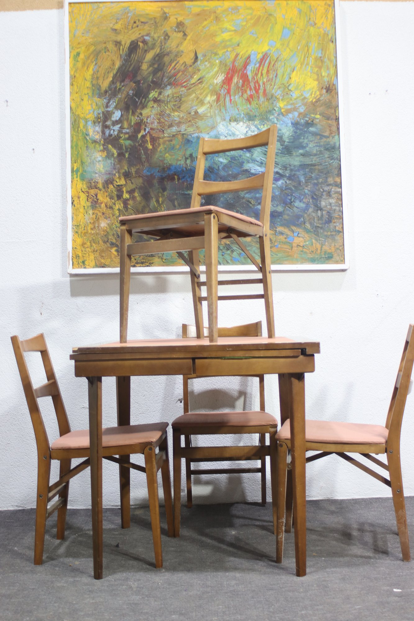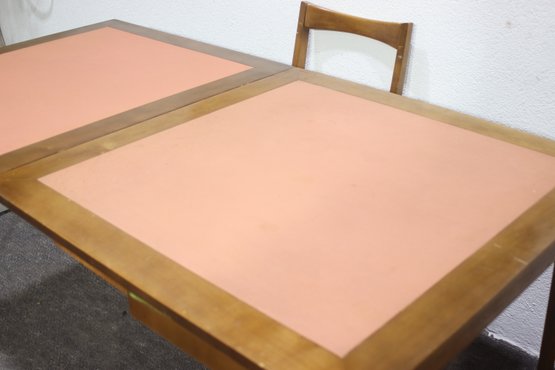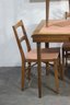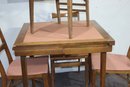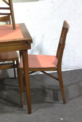 This vintage mid-century modern dining set includes a beautifully crafted expandable wood table and four matching chairs with upholstered seats. The clean lines and simple elegance make this set perfect for classic, Scandinavian, or retro-inspired interiors.