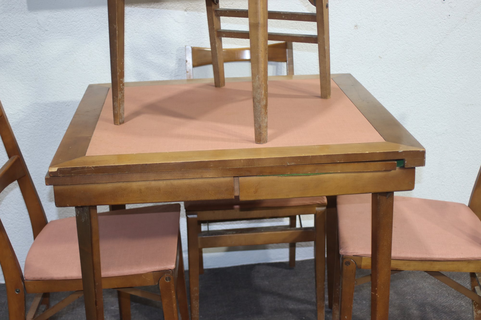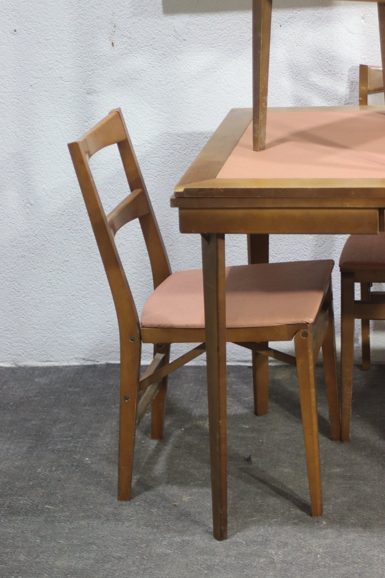 Four sturdy wooden chairs with matching pink upholstered seats