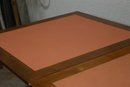Solid wood construction with inset pink-toned laminate panels