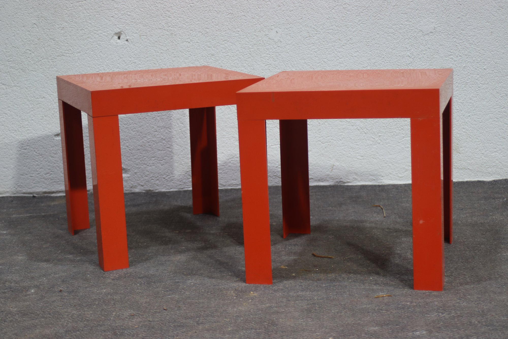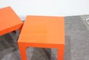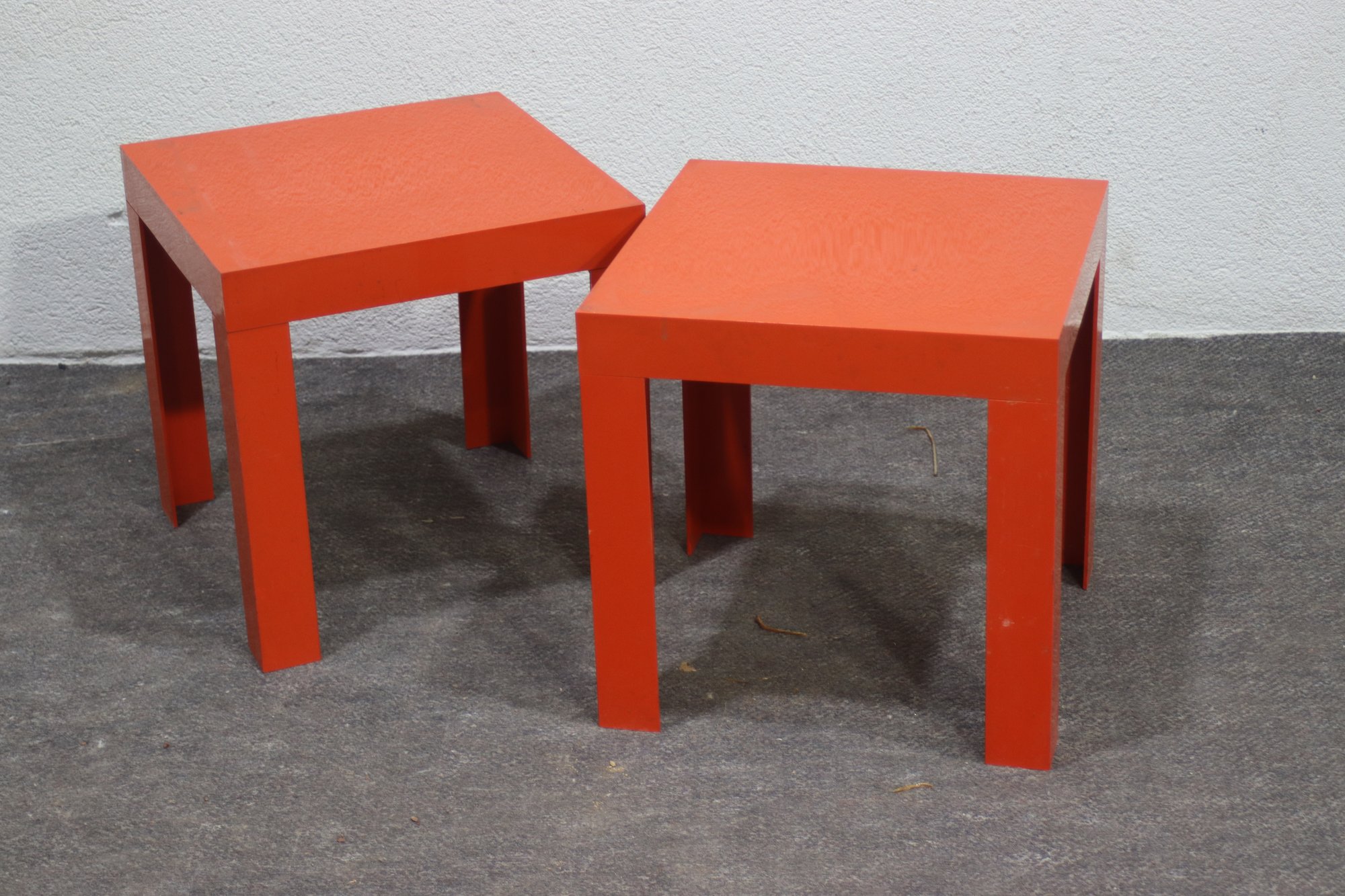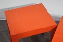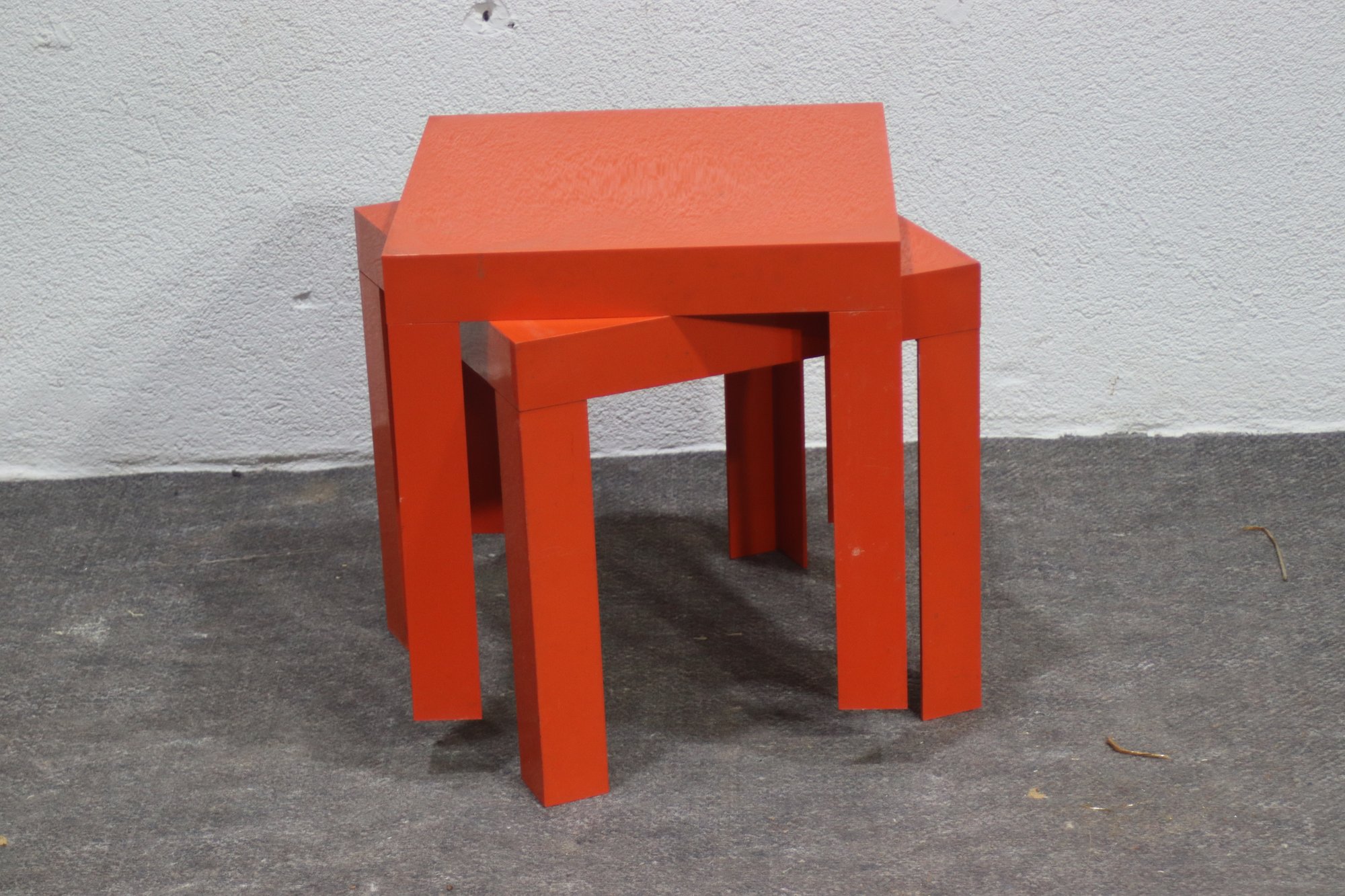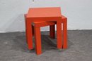 This set of two vintage mid-century modern nesting tables makes a bold statement with its striking orange lacquered finish and sleek geometric design. Perfect for adding a pop of color to any space, these tables are both functional and stylish, offering versatile use as side tables, plant stands, or accent pieces.