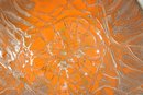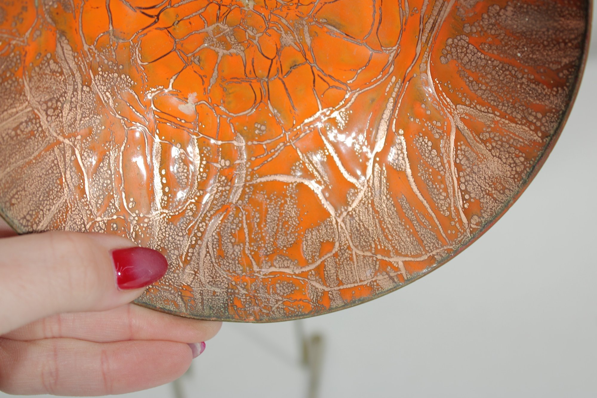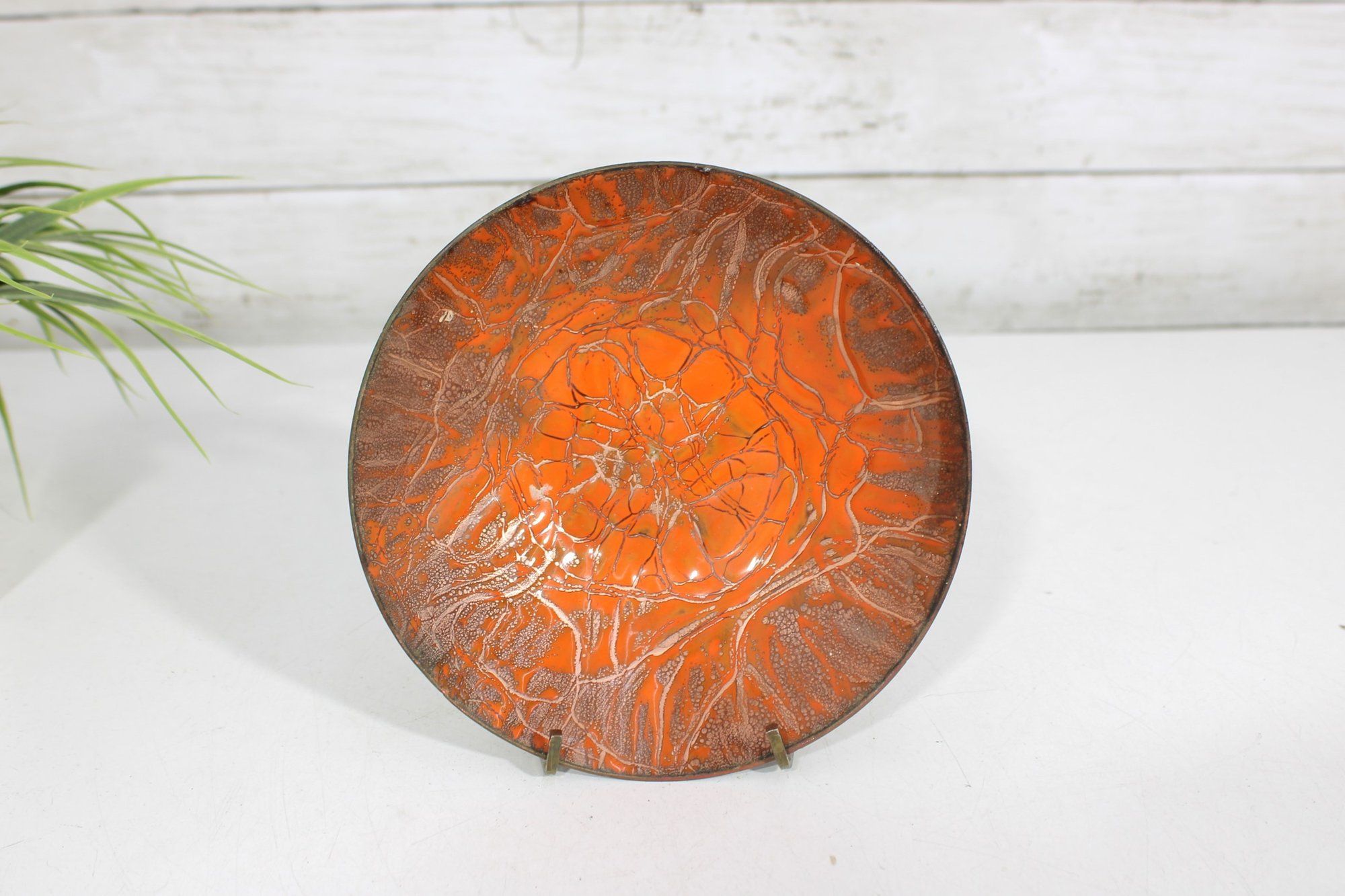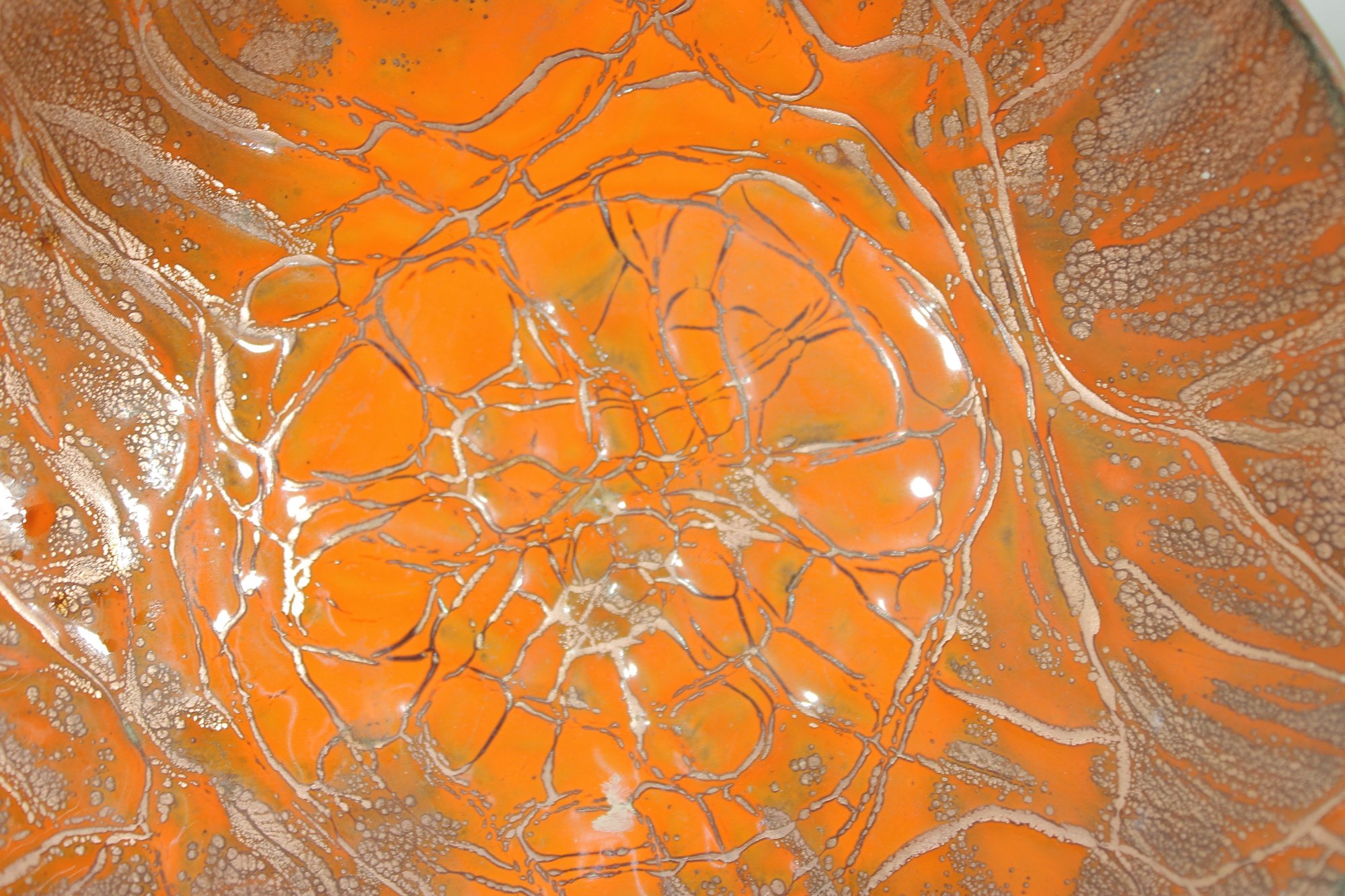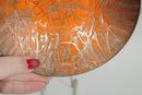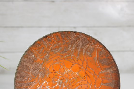 Striking vintage mid-century modern enamel on copper dish featuring a bold and eye-catching abstract design. The interior displays a vibrant orange enamel ground with intricate gold-toned web-like patterning, creating a dynamic, almost cellular effect that beautifully reflects light. The exterior retains a warm copper finish, adding to its authentic MCM appeal.