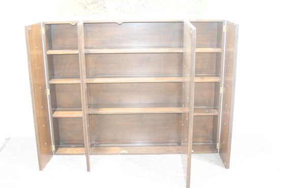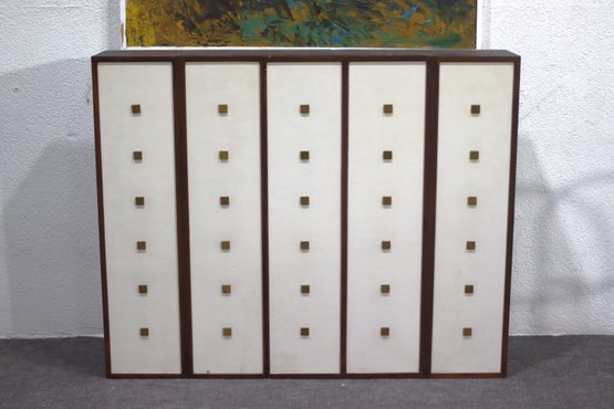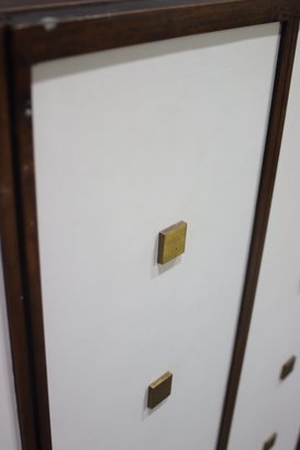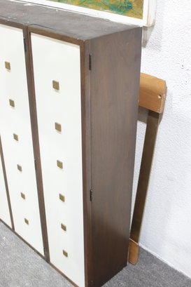 This vintage mid-century modern wall cabinet is a rare and stylish storage piece featuring a bold geometric design with square brass handles, a two-tone wood and cream finish, and ample interior shelving. With its sleek, modern aesthetic, this piece is perfect for adding a touch of retro sophistication to any space.