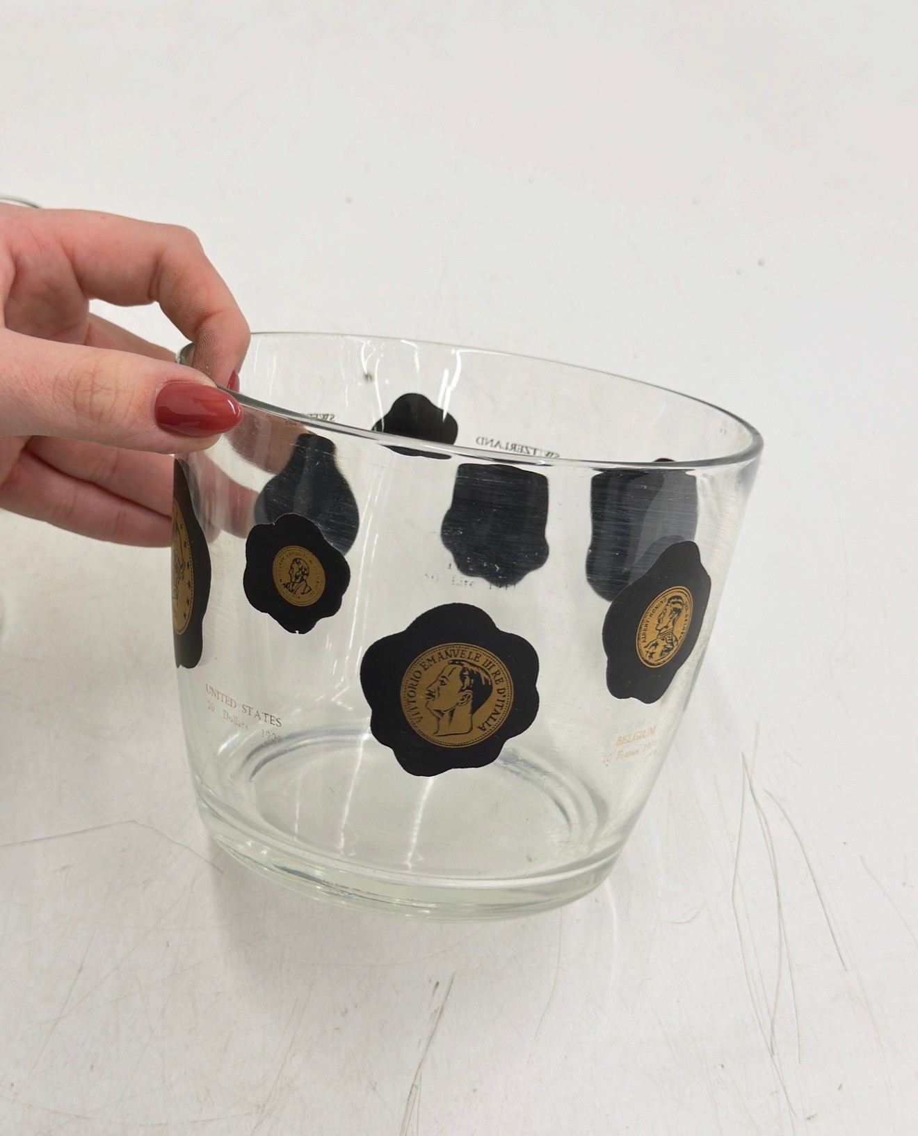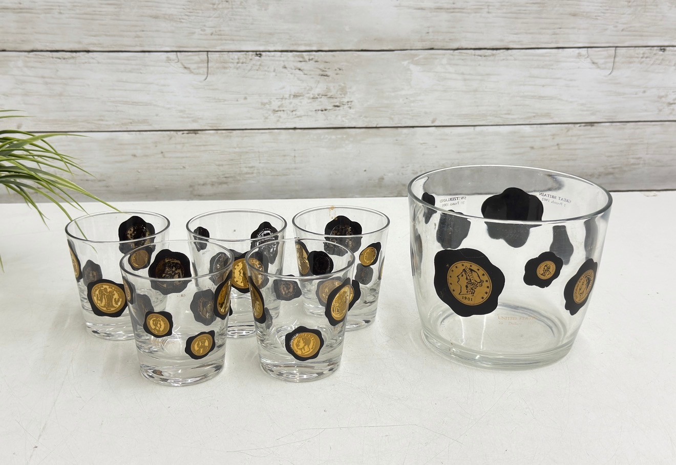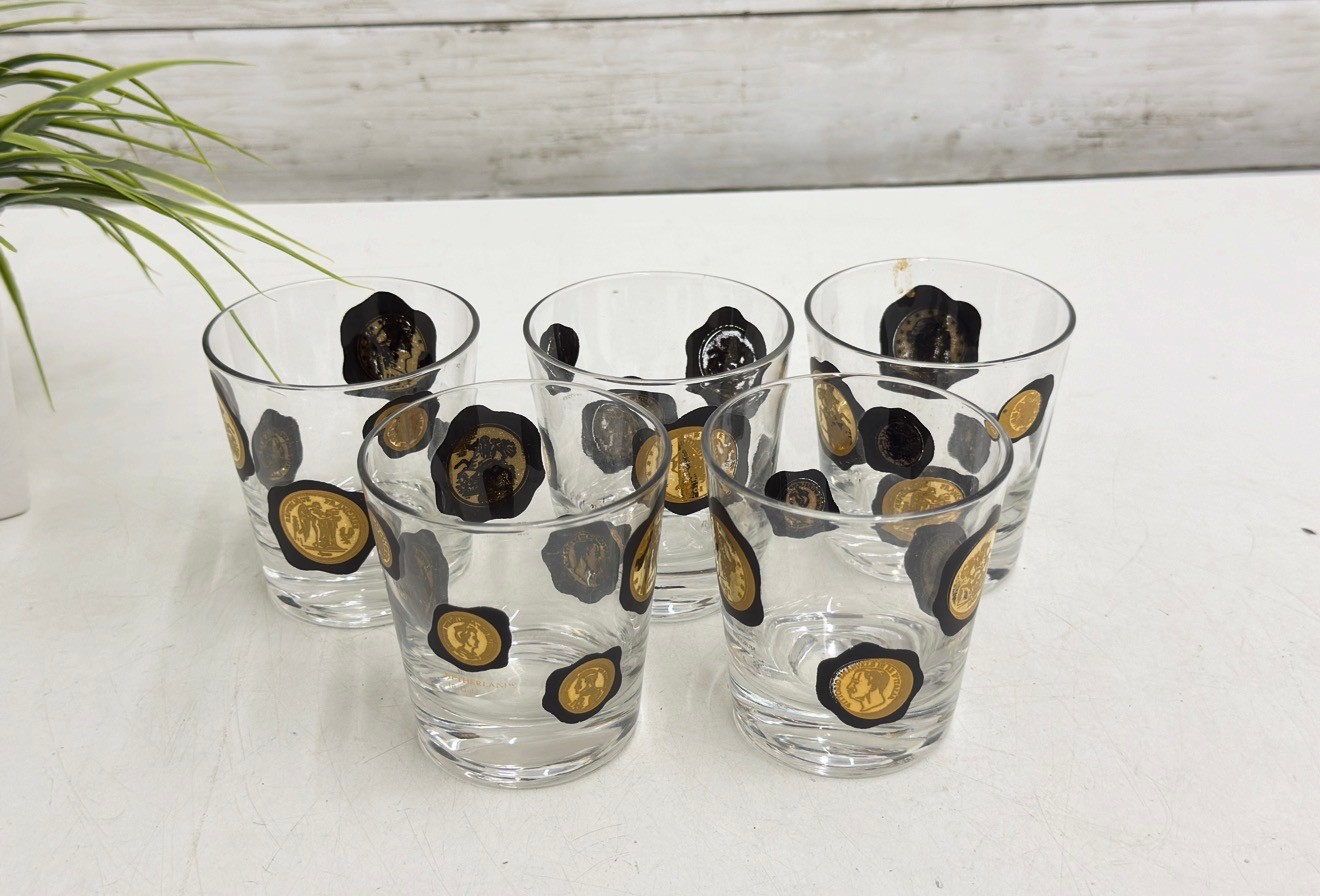 Striking vintage mid-century modern barware set featuring world coin motifs. This set includes decorated tumblers and a matching ice bucket, each showcasing bold black shapes accented with gold-toned coin designs—classic Atomic / MCM style perfect for a retro bar or cocktail display.