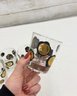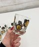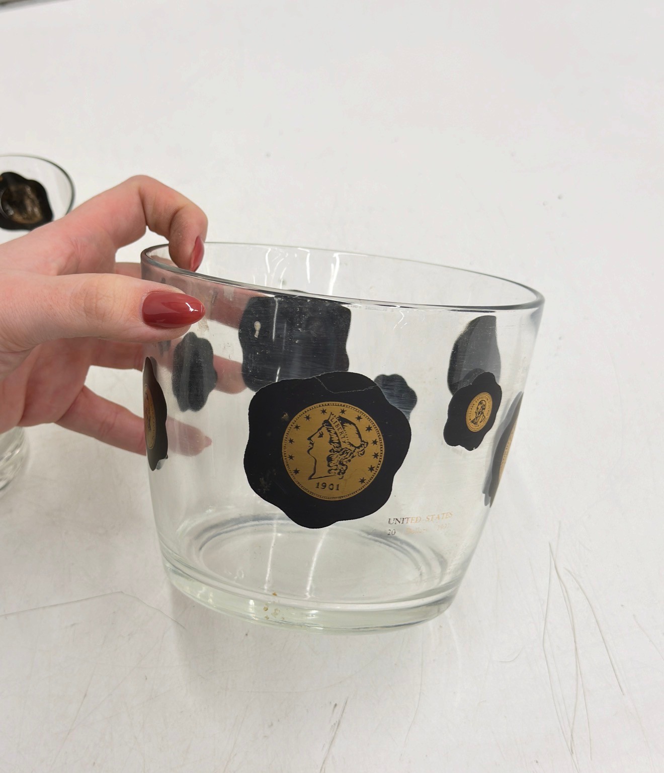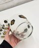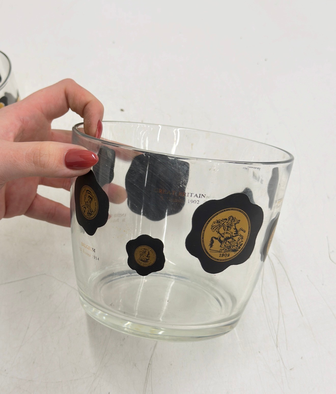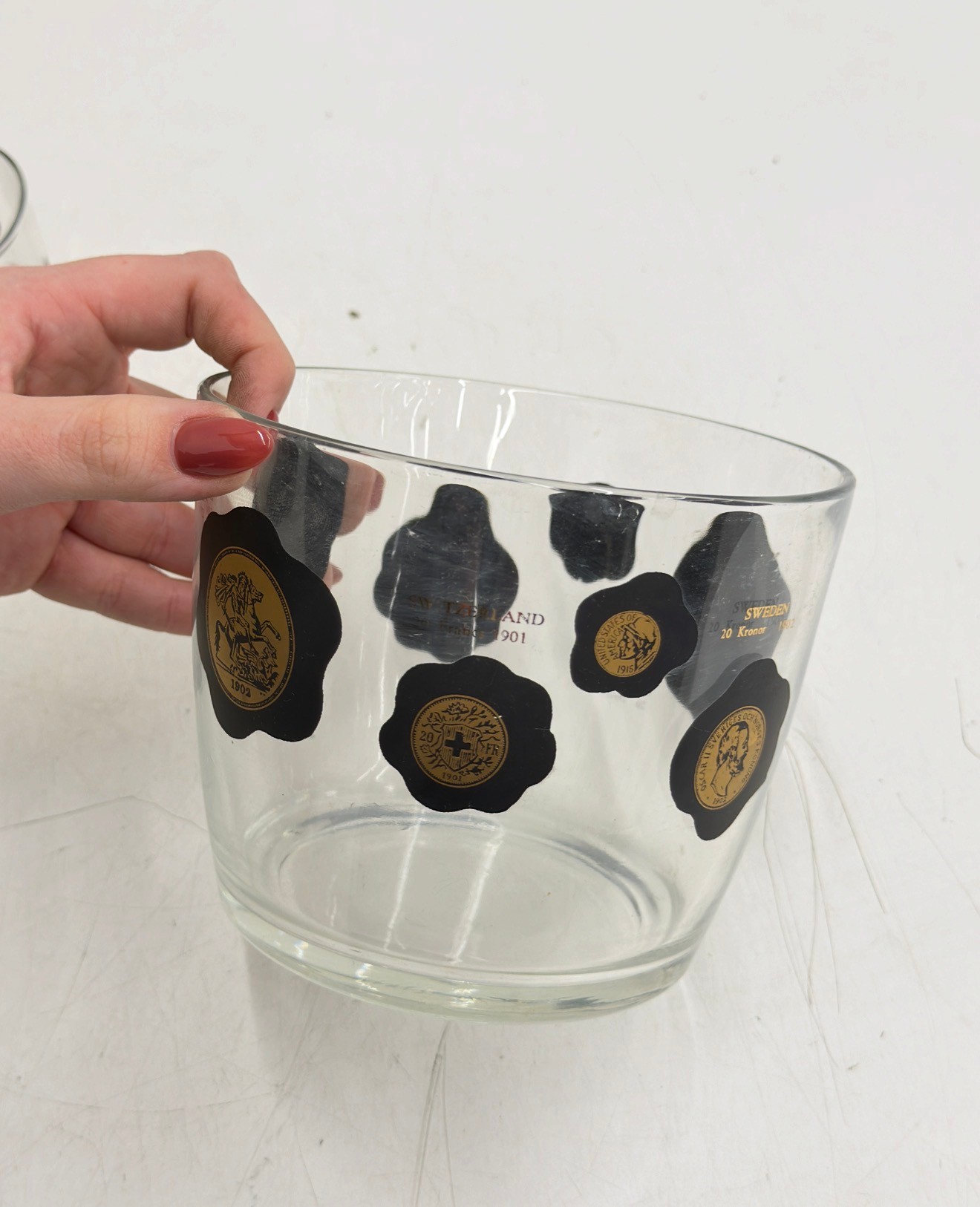 Striking vintage mid-century modern barware set featuring world coin motifs. This set includes decorated tumblers and a matching ice bucket, each showcasing bold black shapes accented with gold-toned coin designs—classic Atomic / MCM style perfect for a retro bar or cocktail display.
