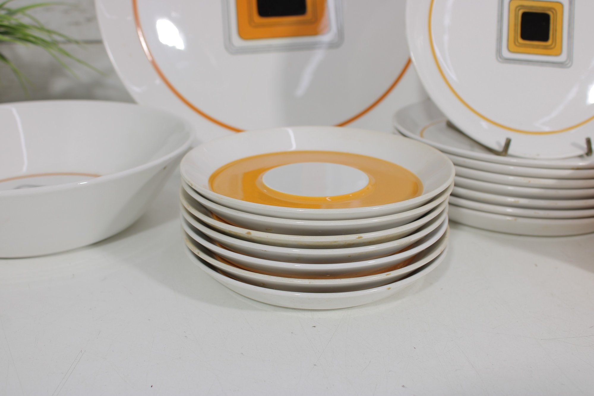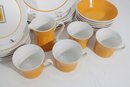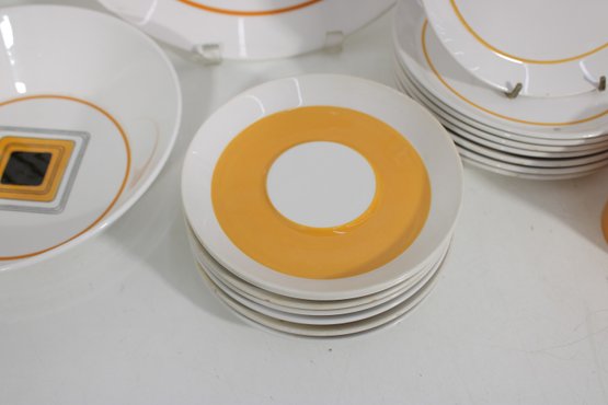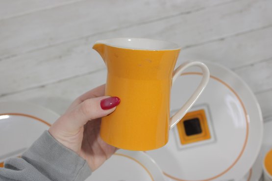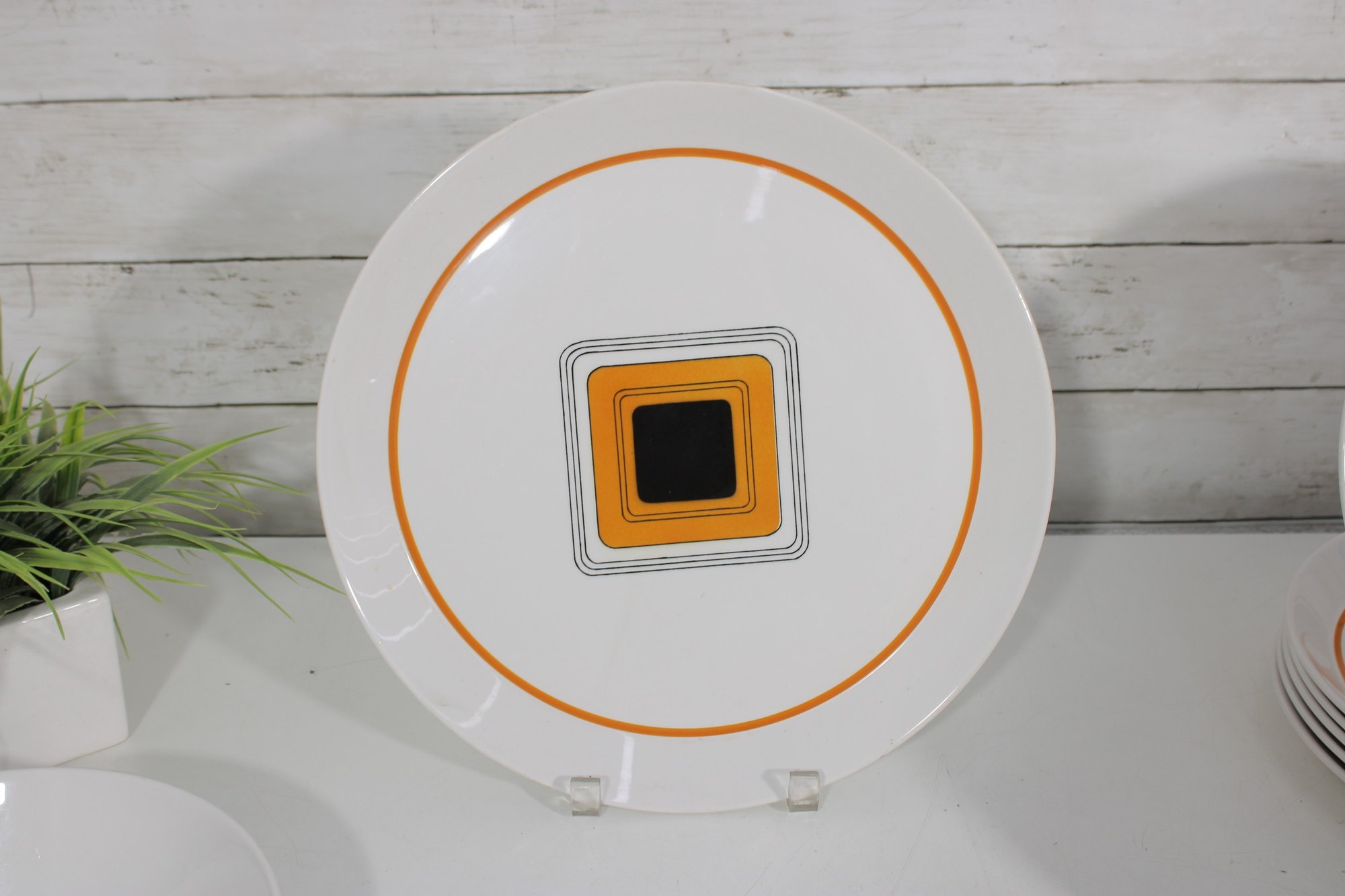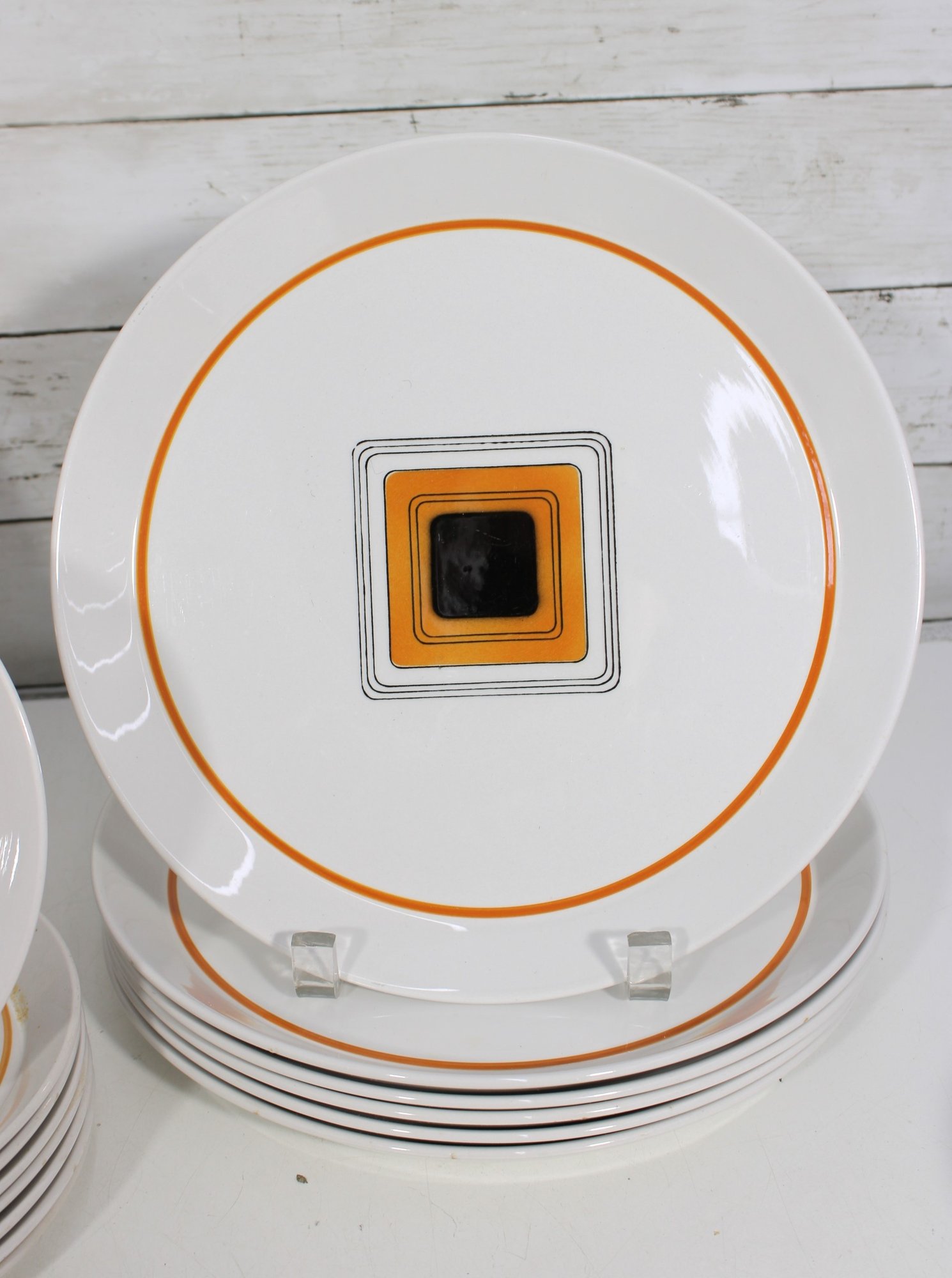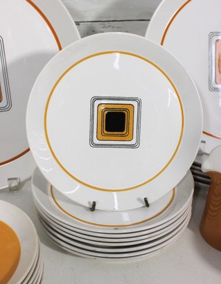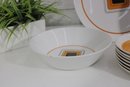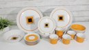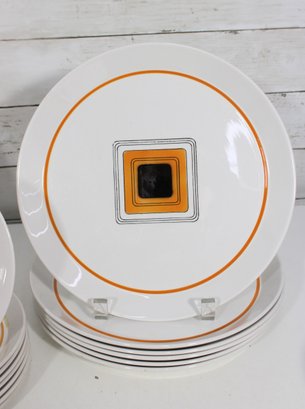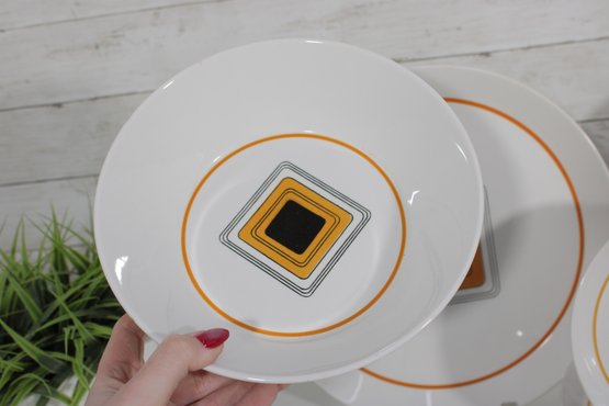 This set features a crisp white base accented with vibrant orange bands and a distinctive geometric square motif in black and gold at the center—an iconic look of mid-century modern design.
