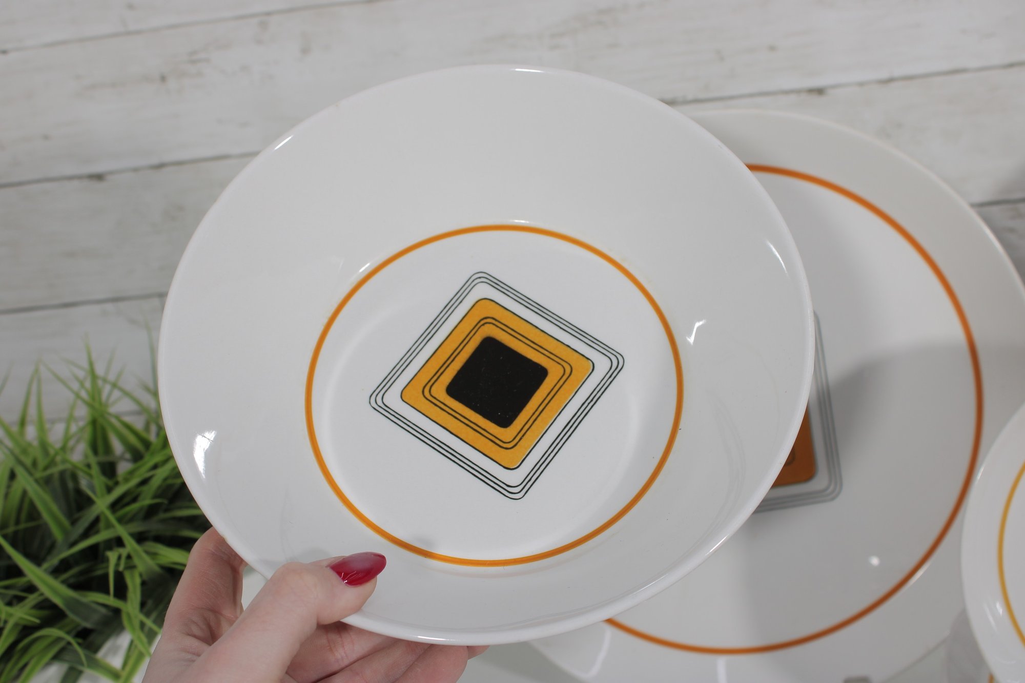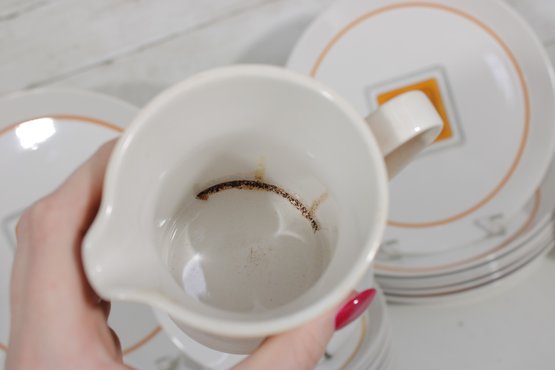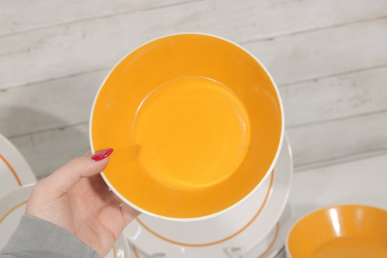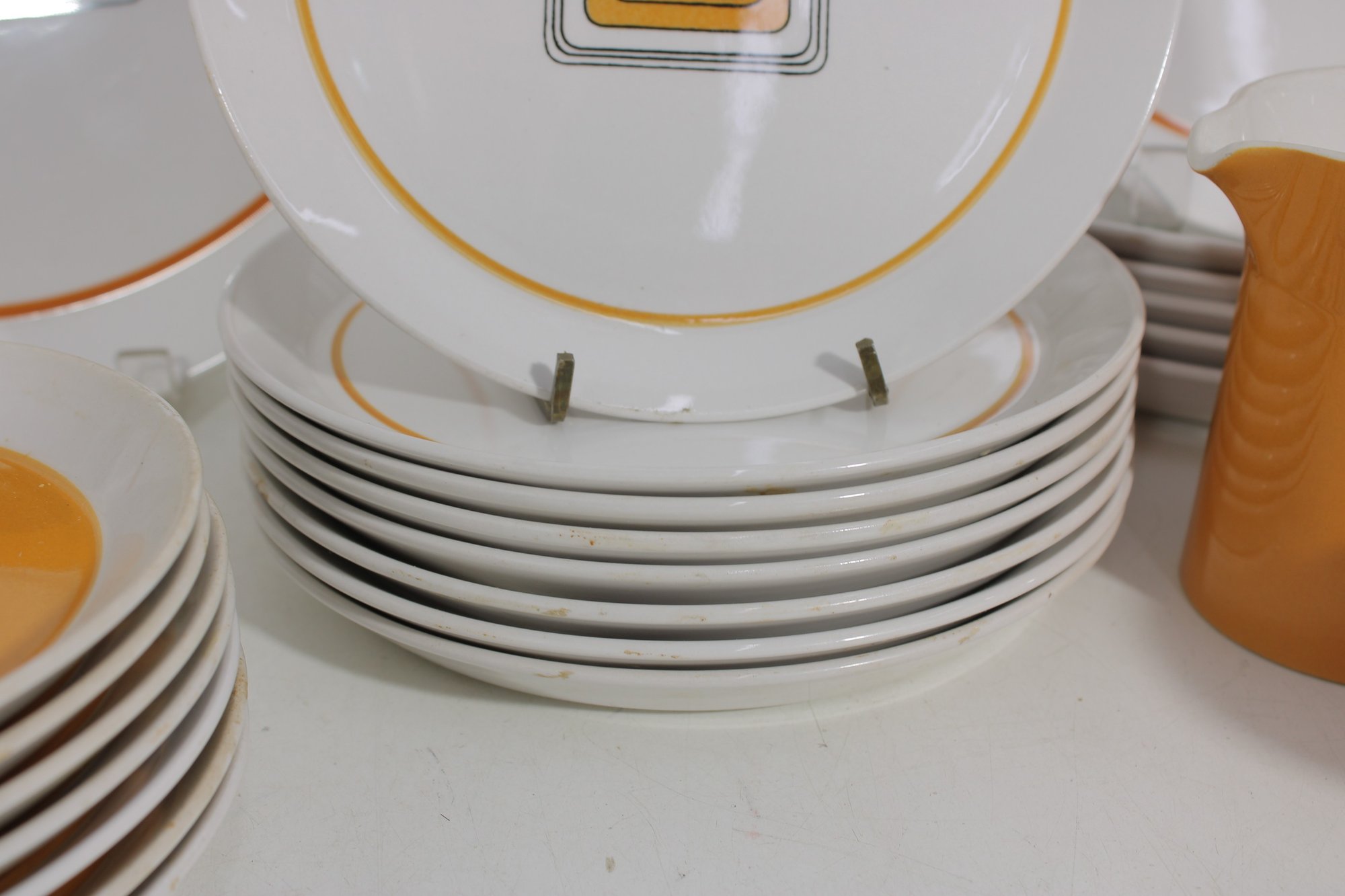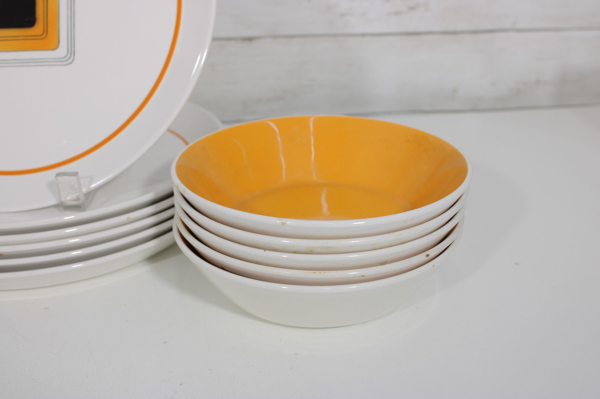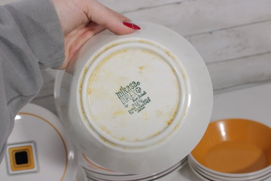 This set features a crisp white base accented with vibrant orange bands and a distinctive geometric square motif in black and gold at the center—an iconic look of mid-century modern design.