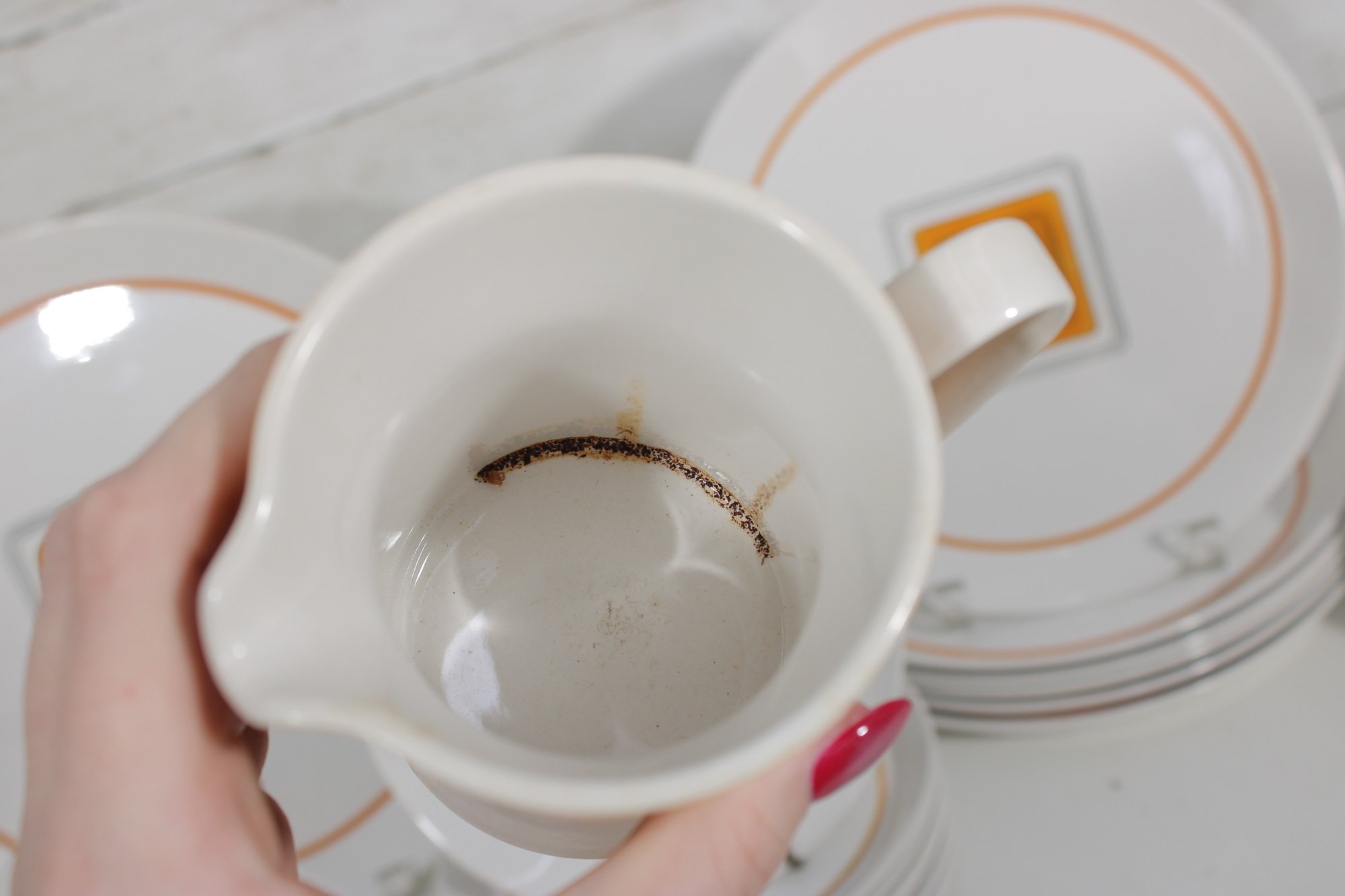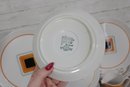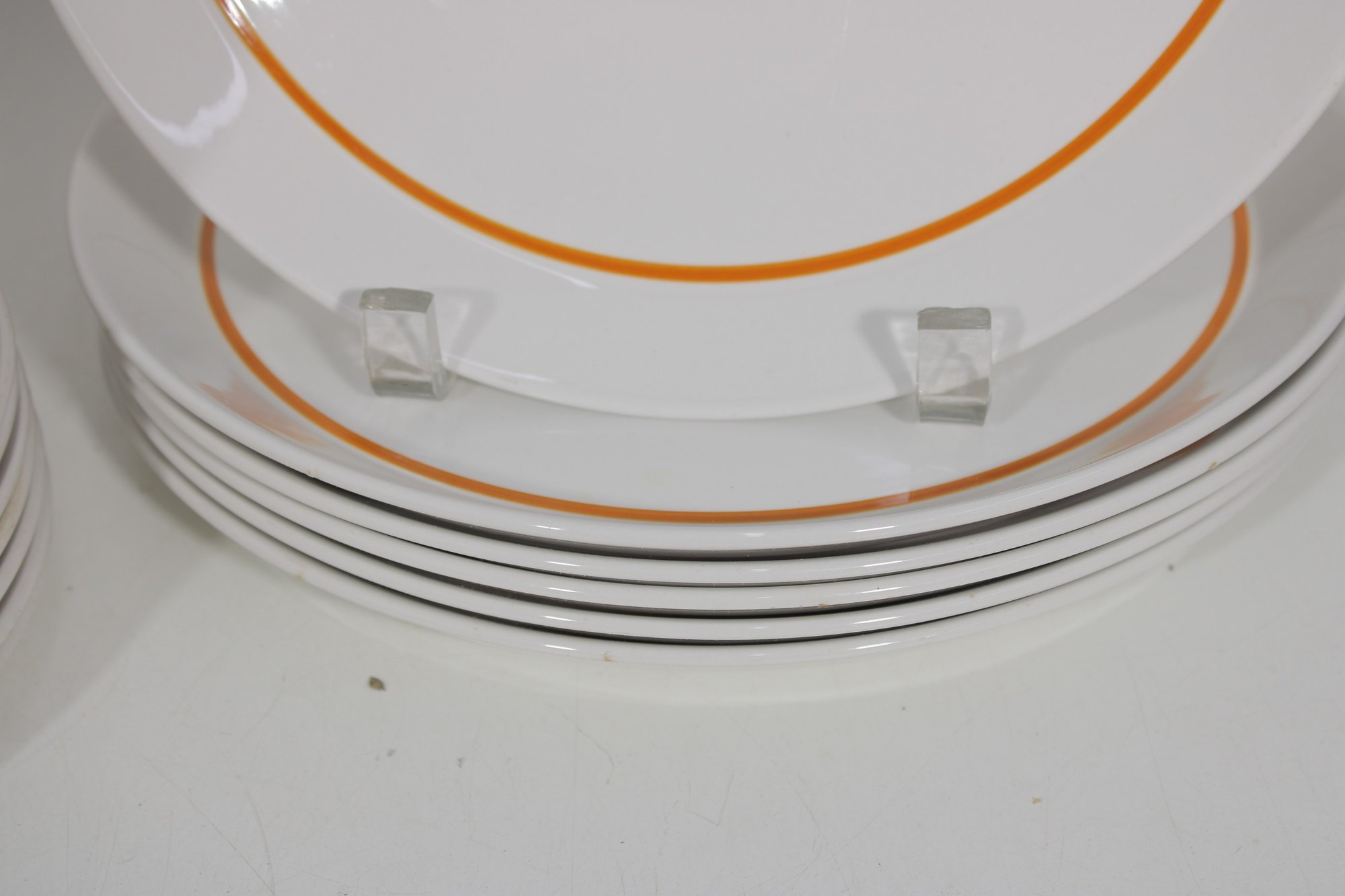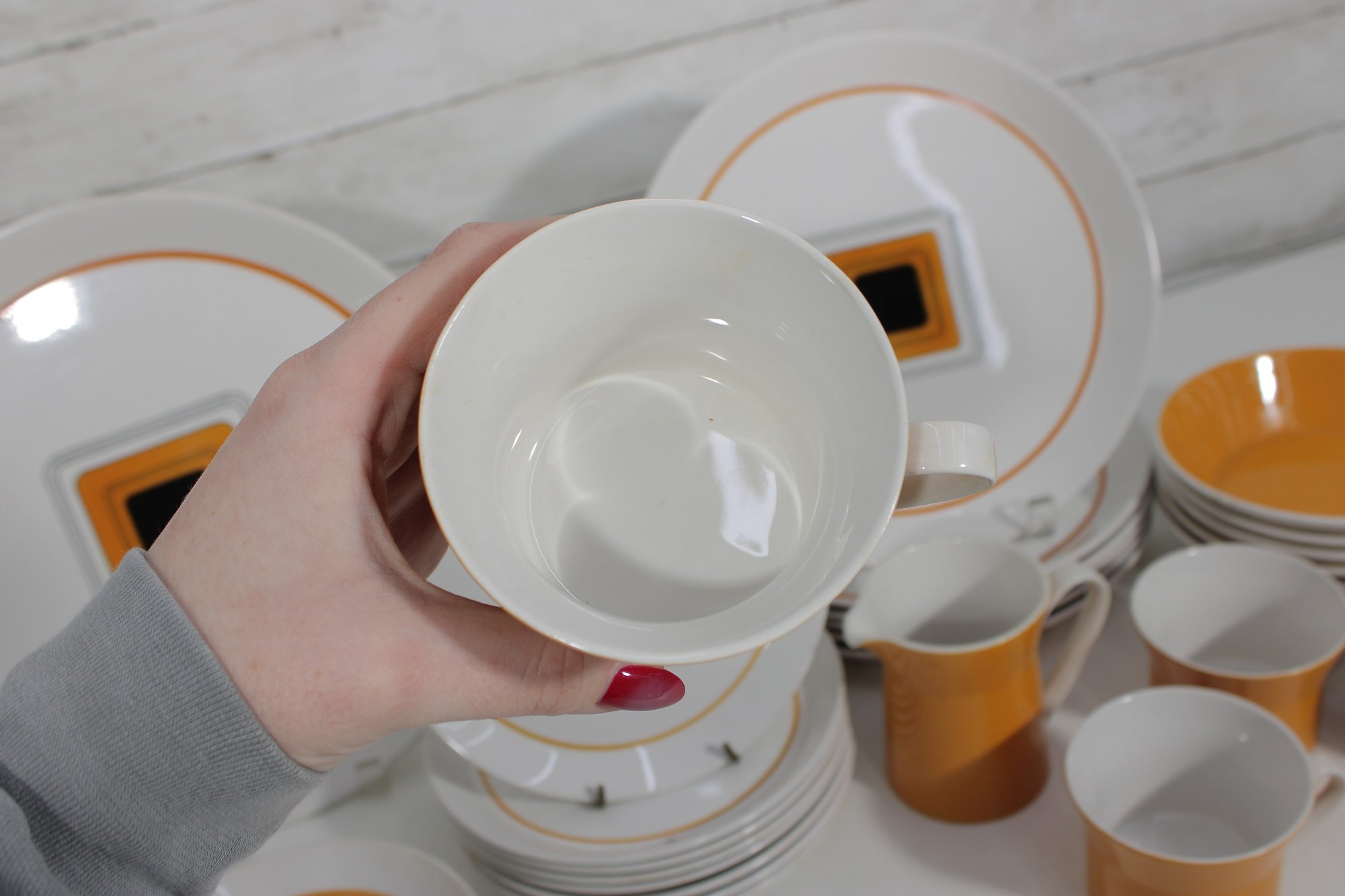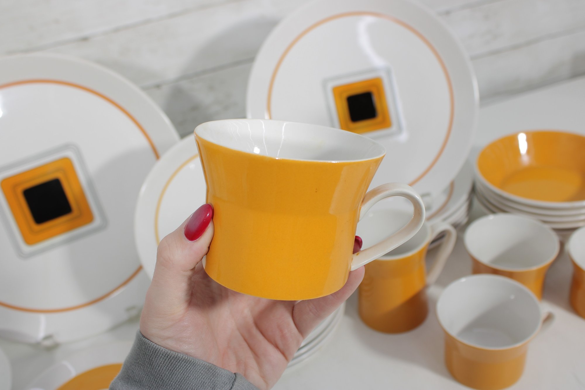 This set features a crisp white base accented with vibrant orange bands and a distinctive geometric square motif in black and gold at the center—an iconic look of mid-century modern design.