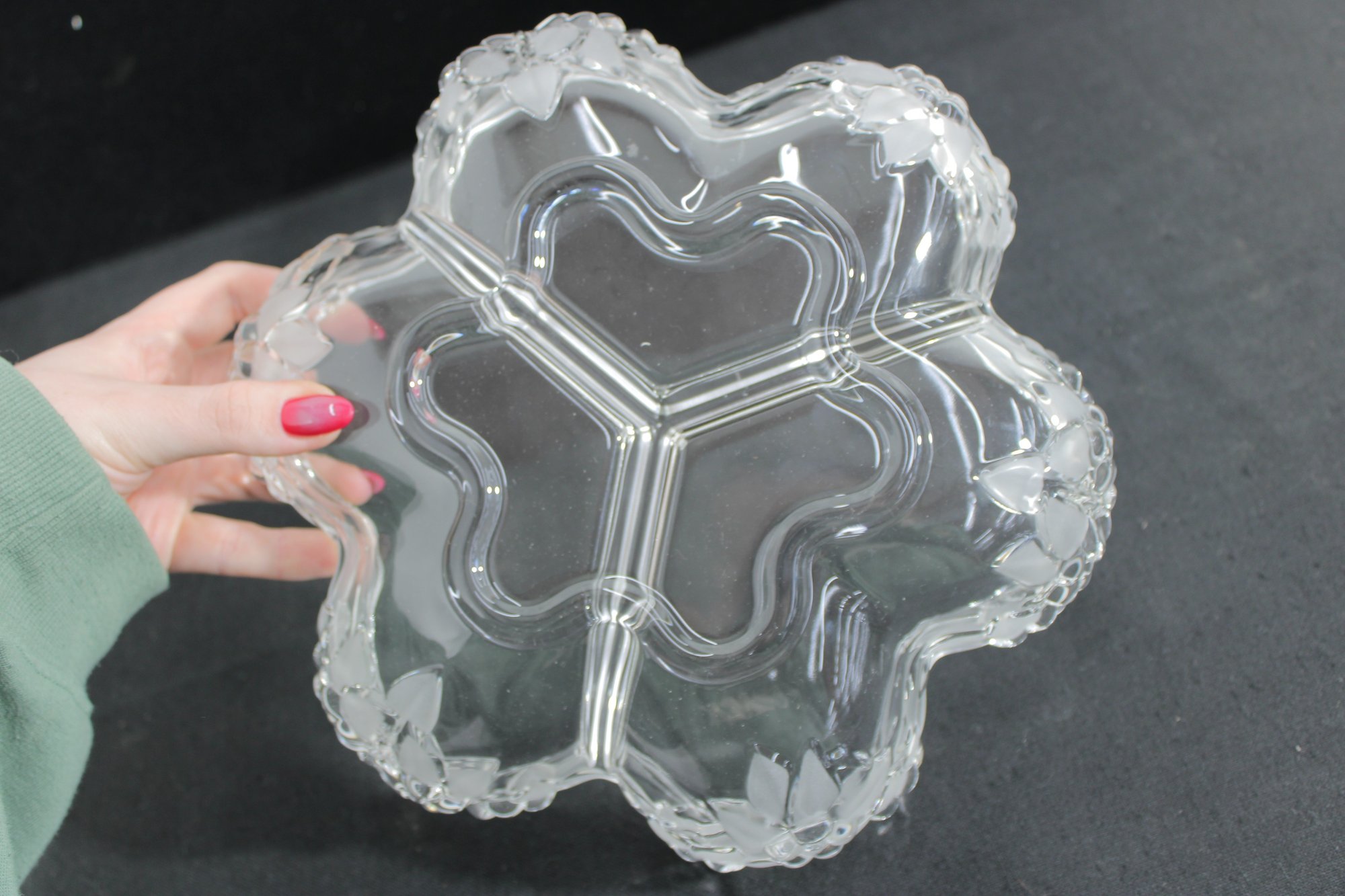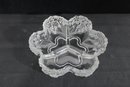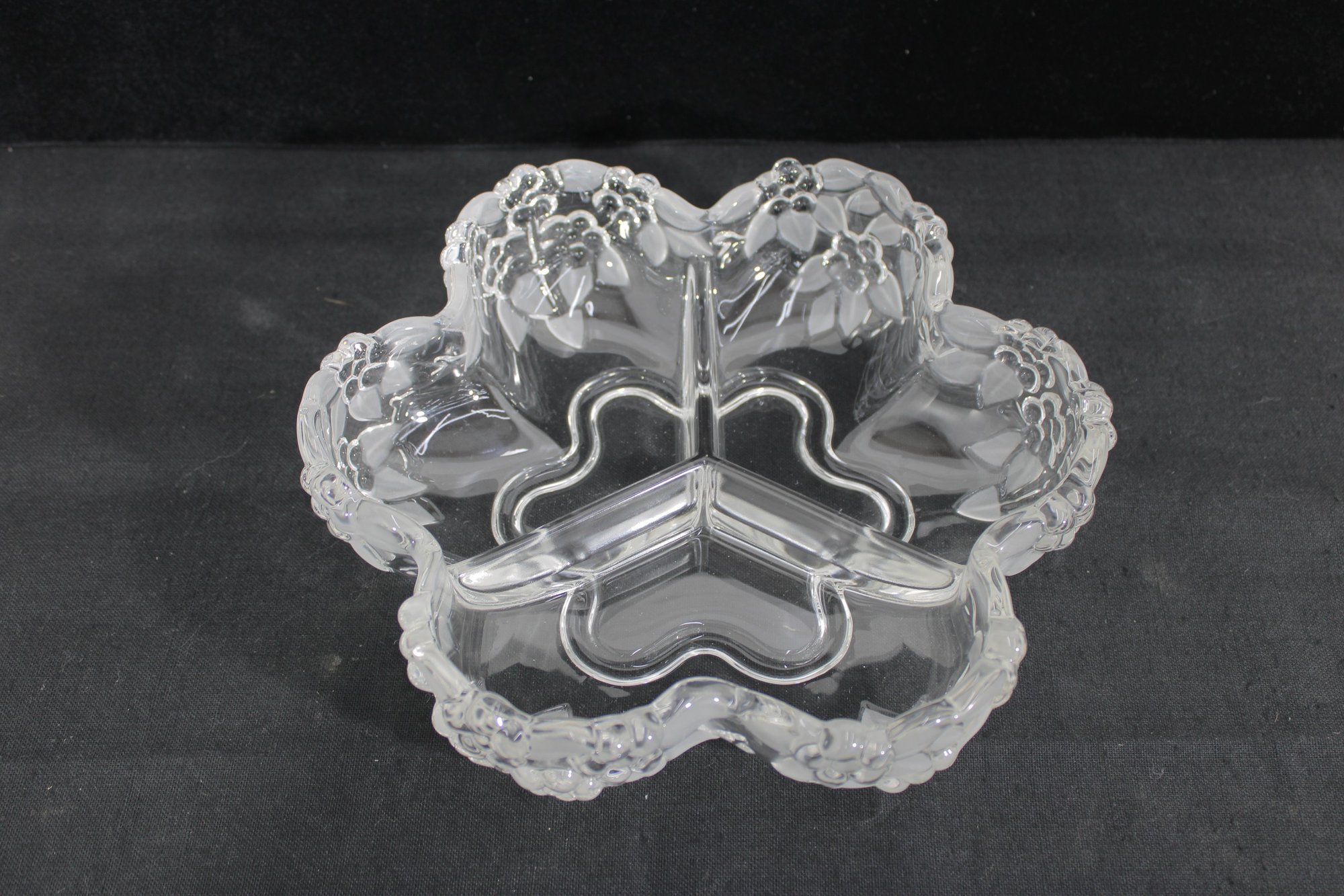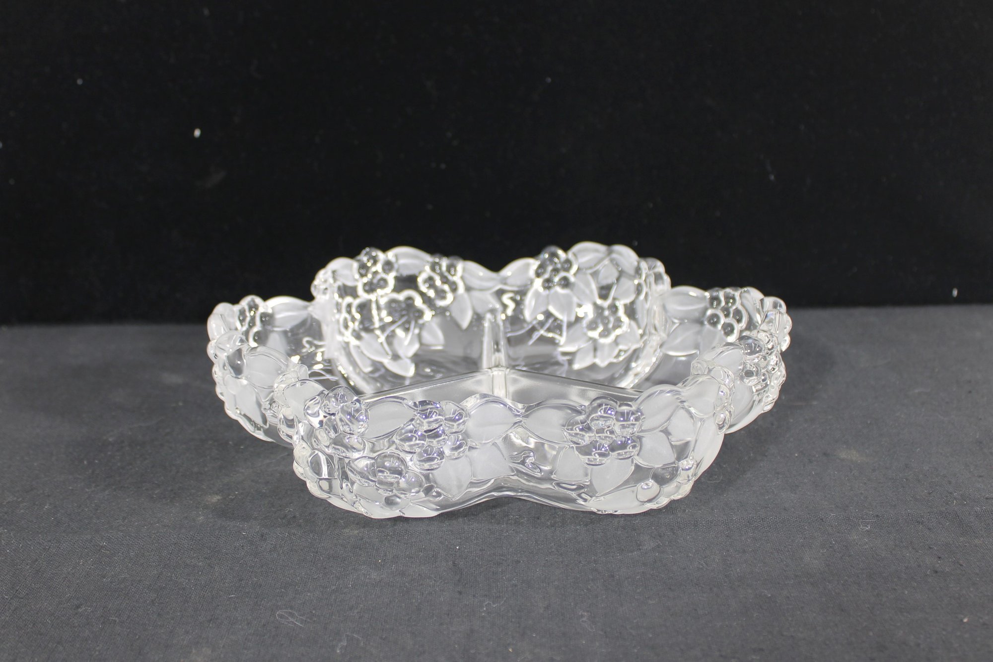 An elegant vintage Mikasa Walther Crystal serving bowl in the sought-after Carmen pattern, featuring a beautifully sculpted three-section design. This divided bowl showcases intricate floral and scroll motifs in clear crystal, creating a refined and timeless presentation.