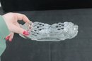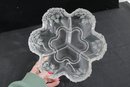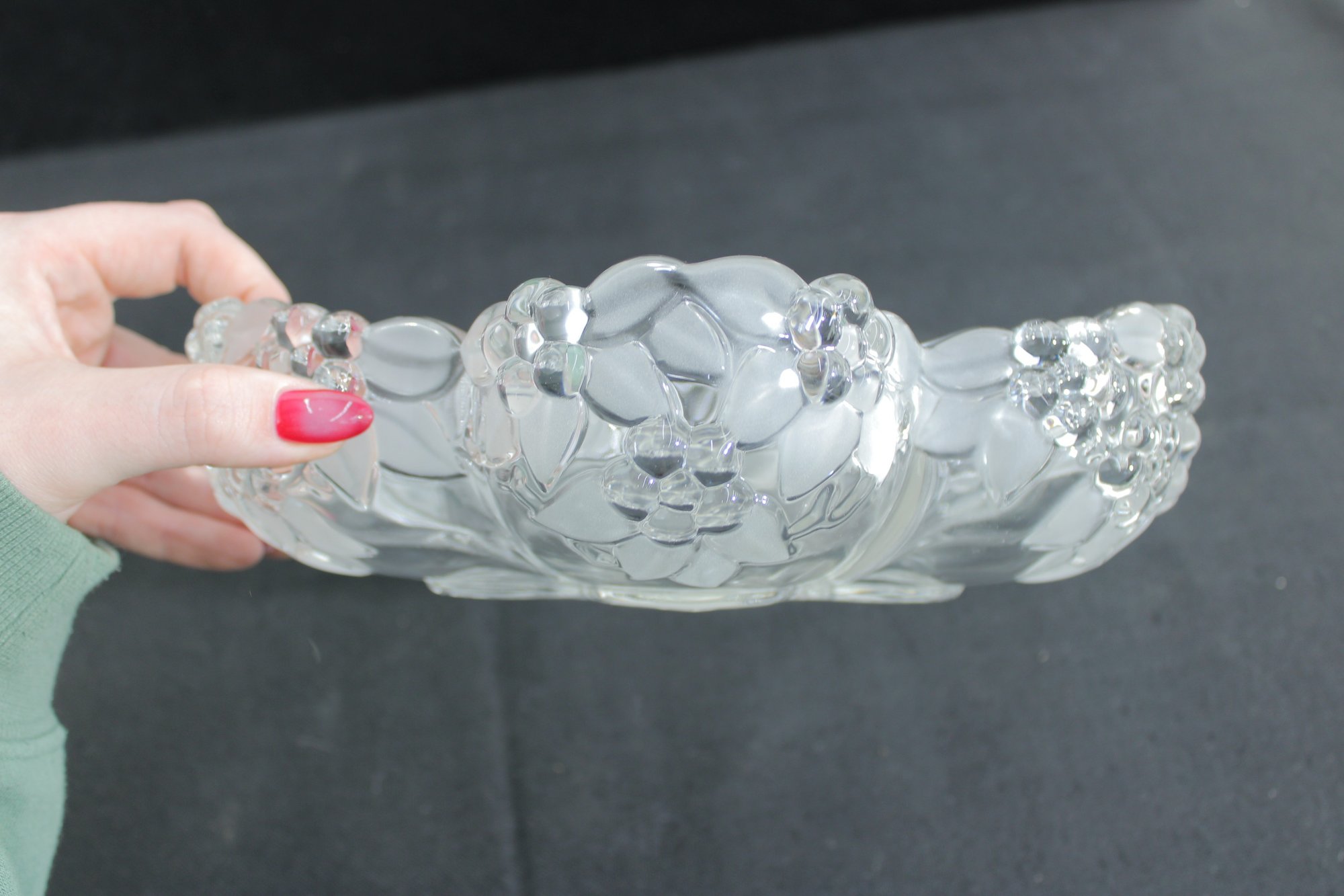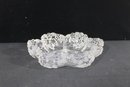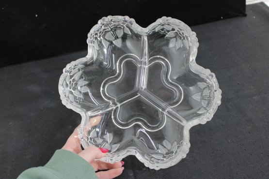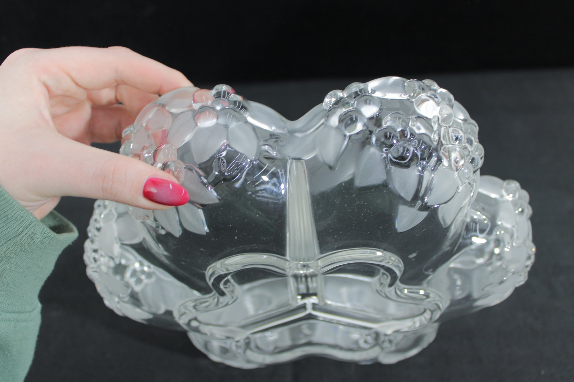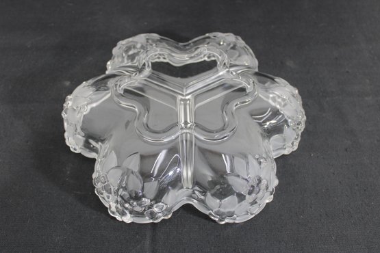 An elegant vintage Mikasa Walther Crystal serving bowl in the sought-after Carmen pattern, featuring a beautifully sculpted three-section design. This divided bowl showcases intricate floral and scroll motifs in clear crystal, creating a refined and timeless presentation.