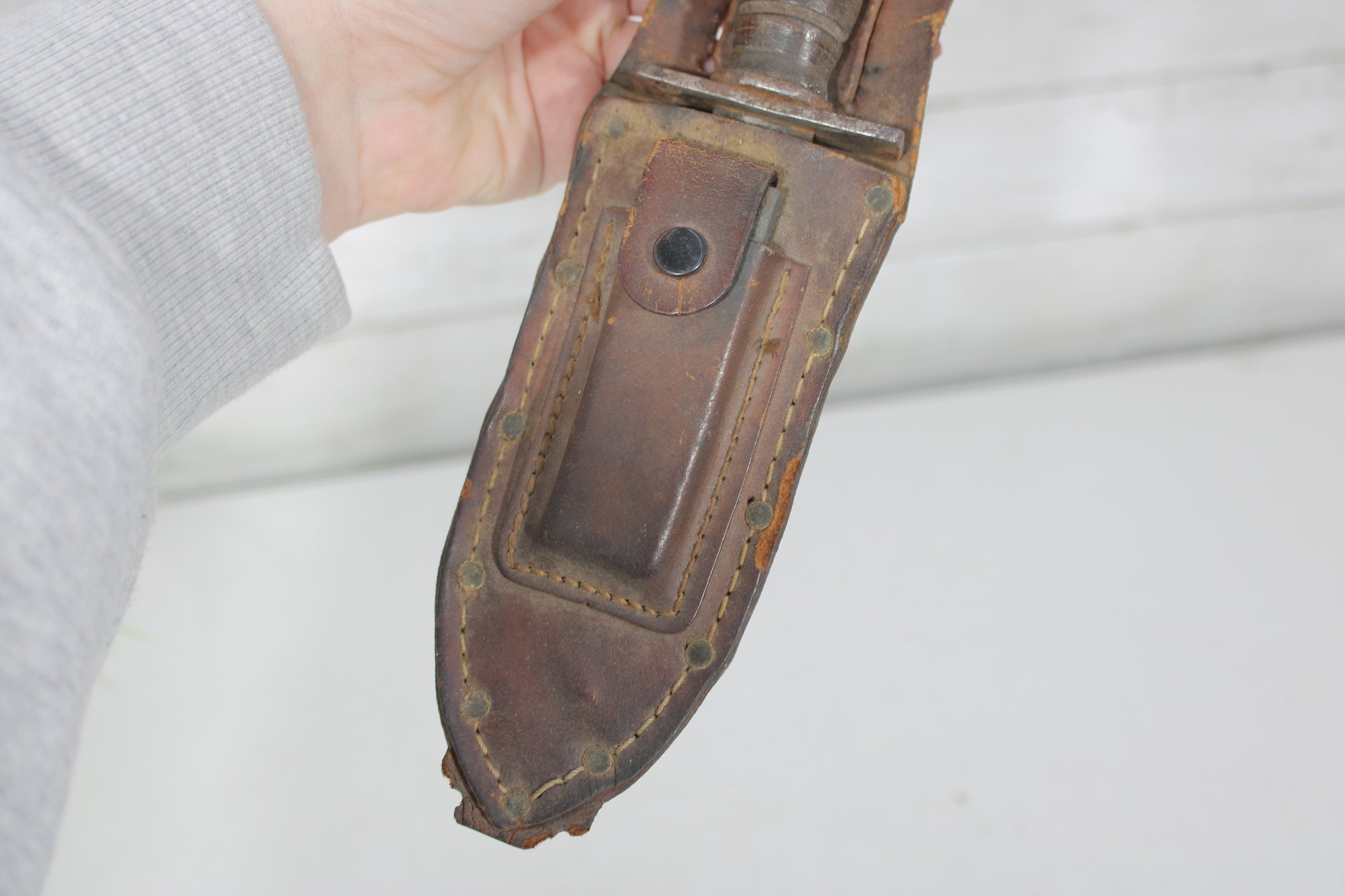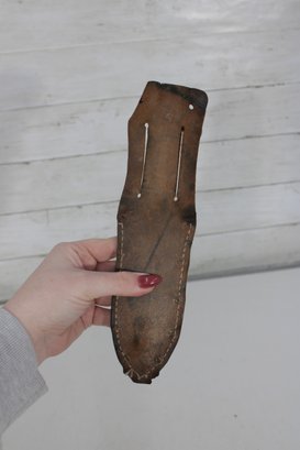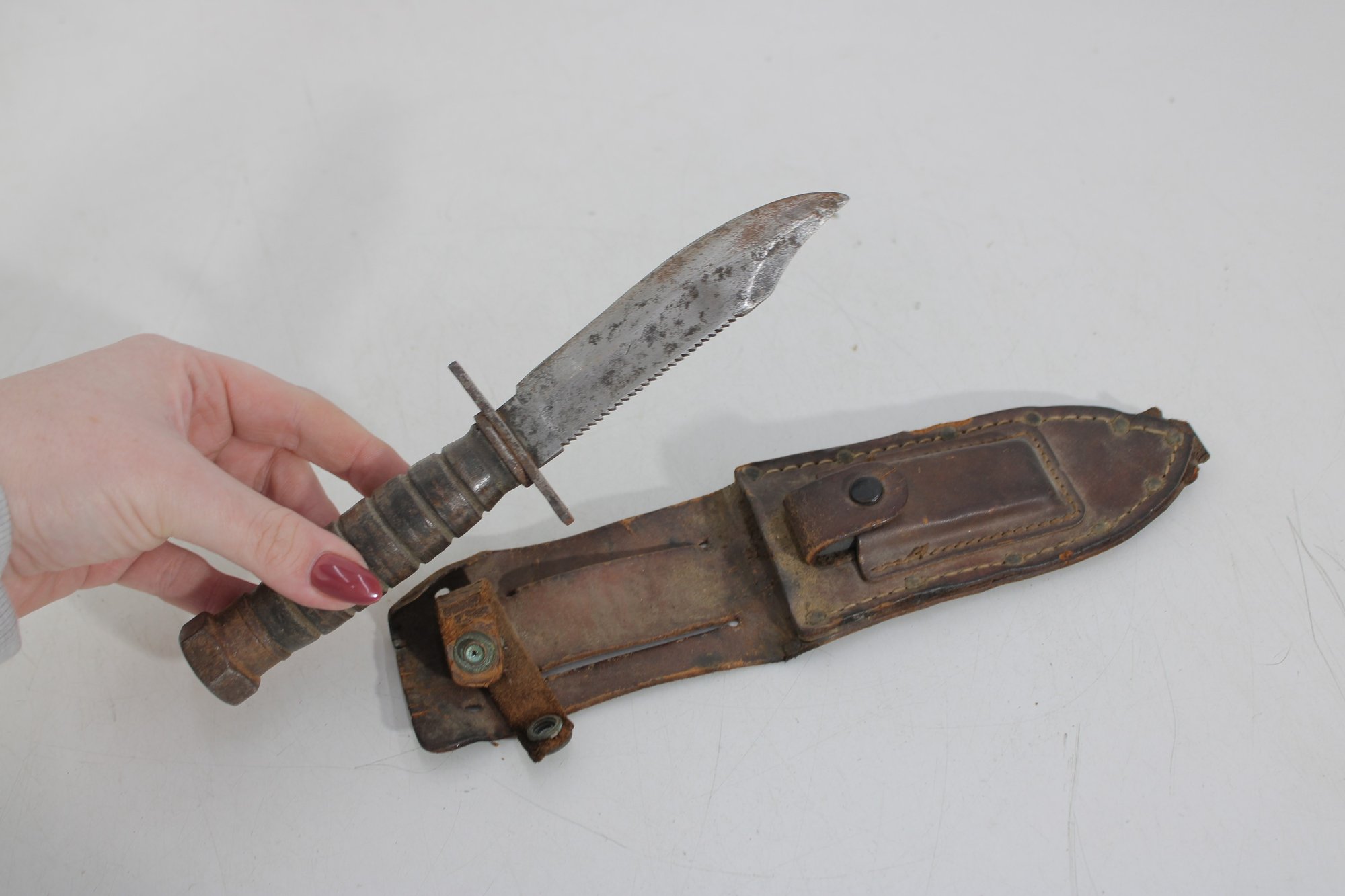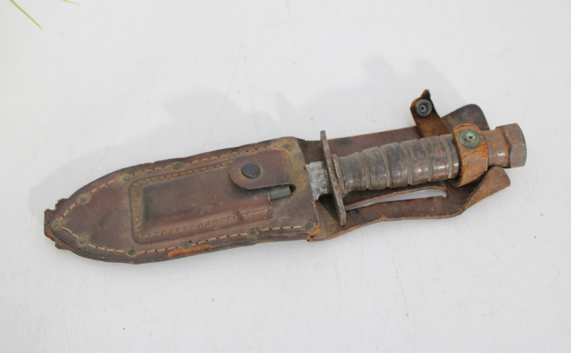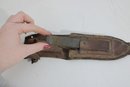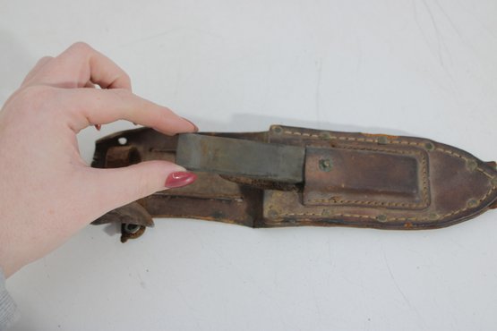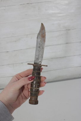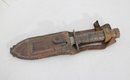 Vintage military-style fixed blade fighting knife offered with its original leather sheath. This compact 10” knife features a stacked handle grip, metal guard, and aged blade with a well-worn patina that reflects years of use and storage. The leather sheath shows classic stitched construction with belt attachment, adding to its rugged collectible appeal.