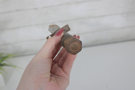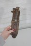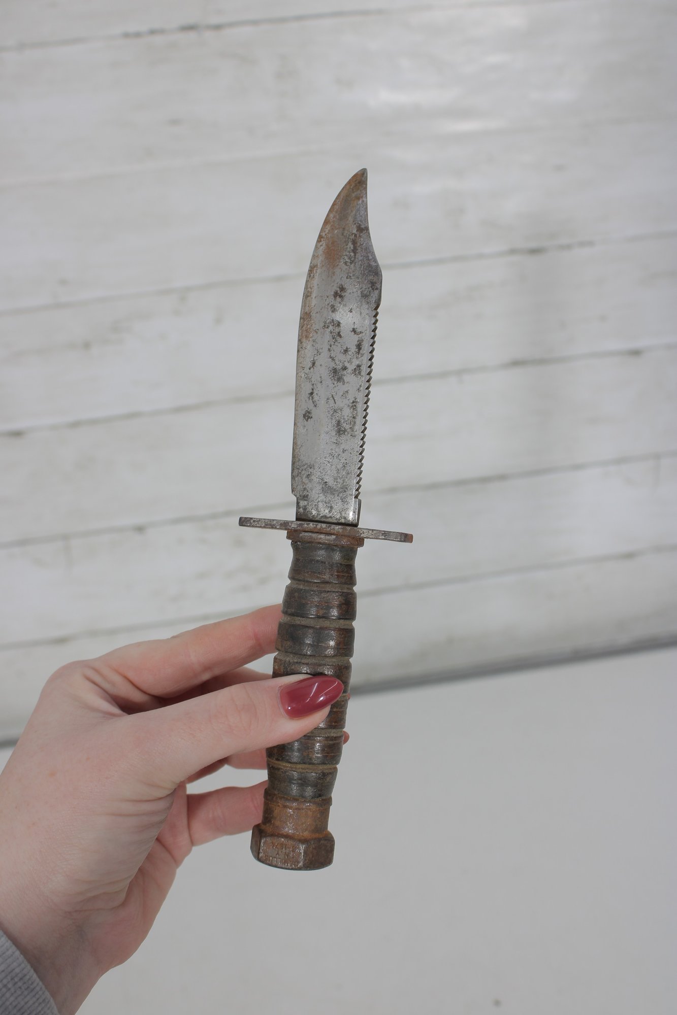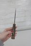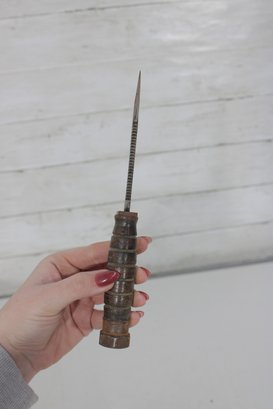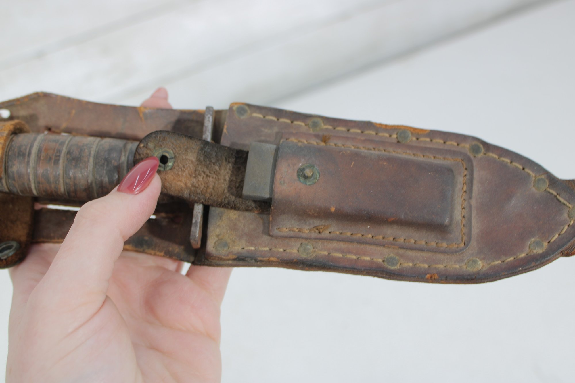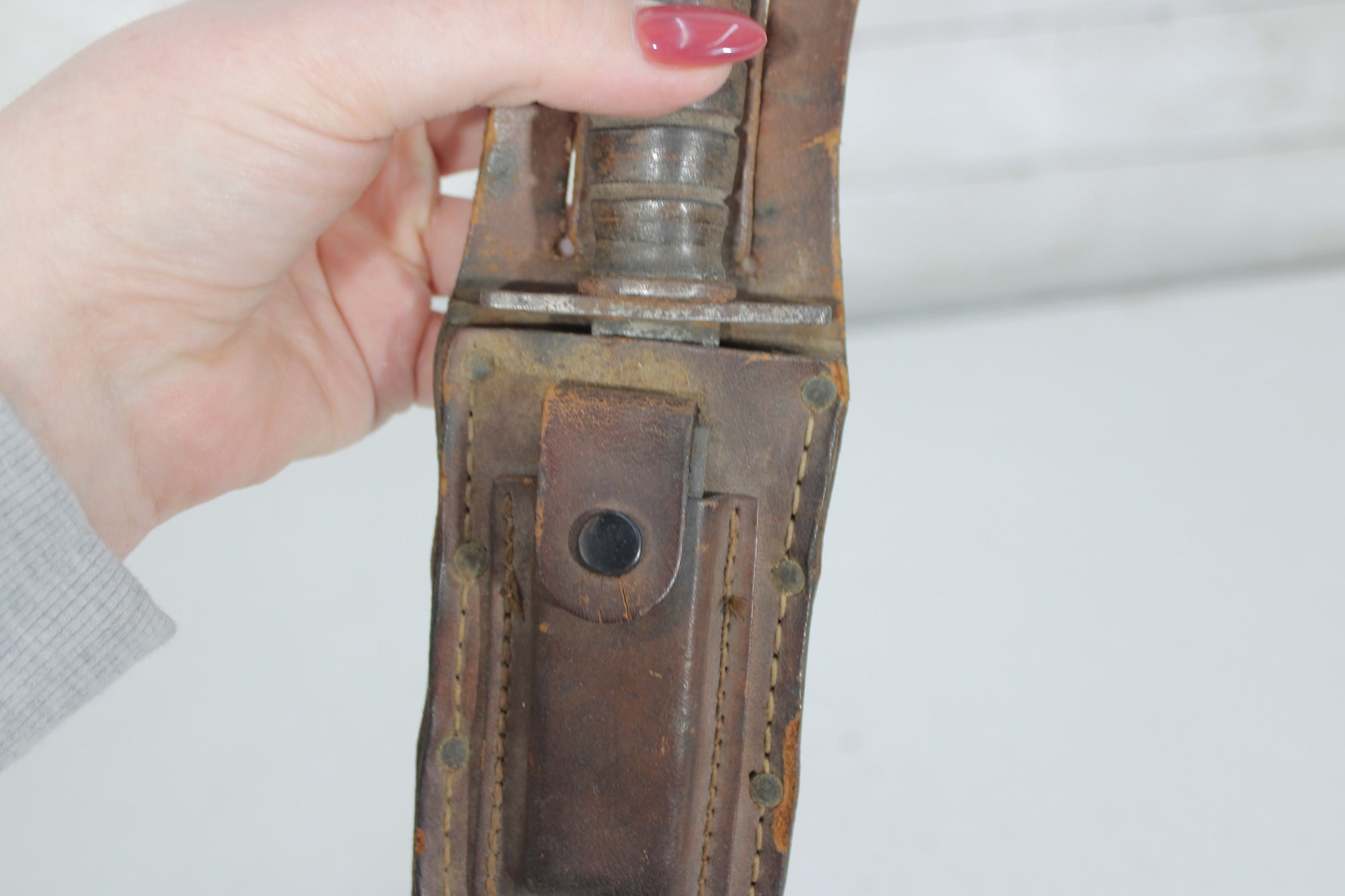 Vintage military-style fixed blade fighting knife offered with its original leather sheath. This compact 10” knife features a stacked handle grip, metal guard, and aged blade with a well-worn patina that reflects years of use and storage. The leather sheath shows classic stitched construction with belt attachment, adding to its rugged collectible appeal.