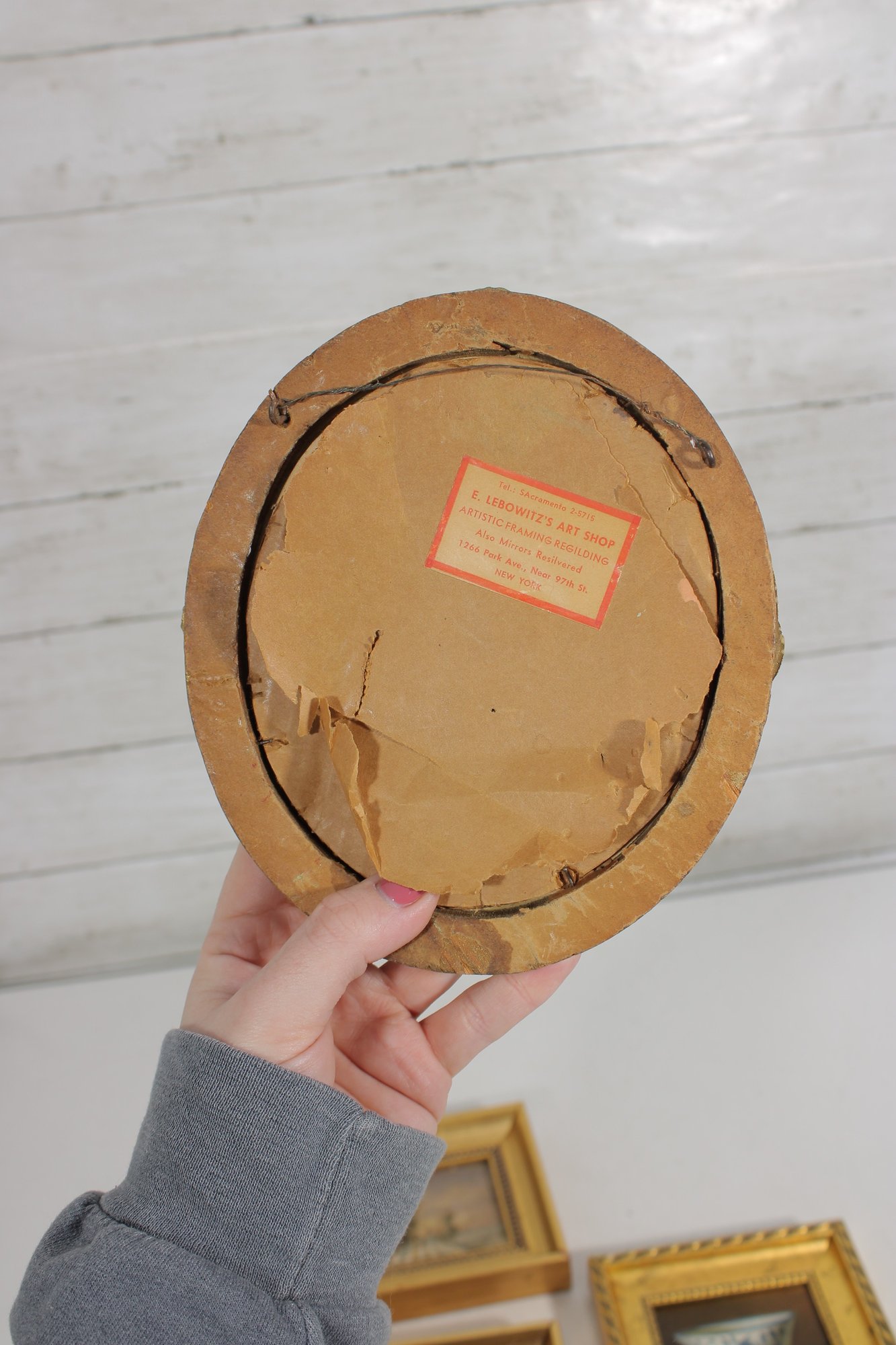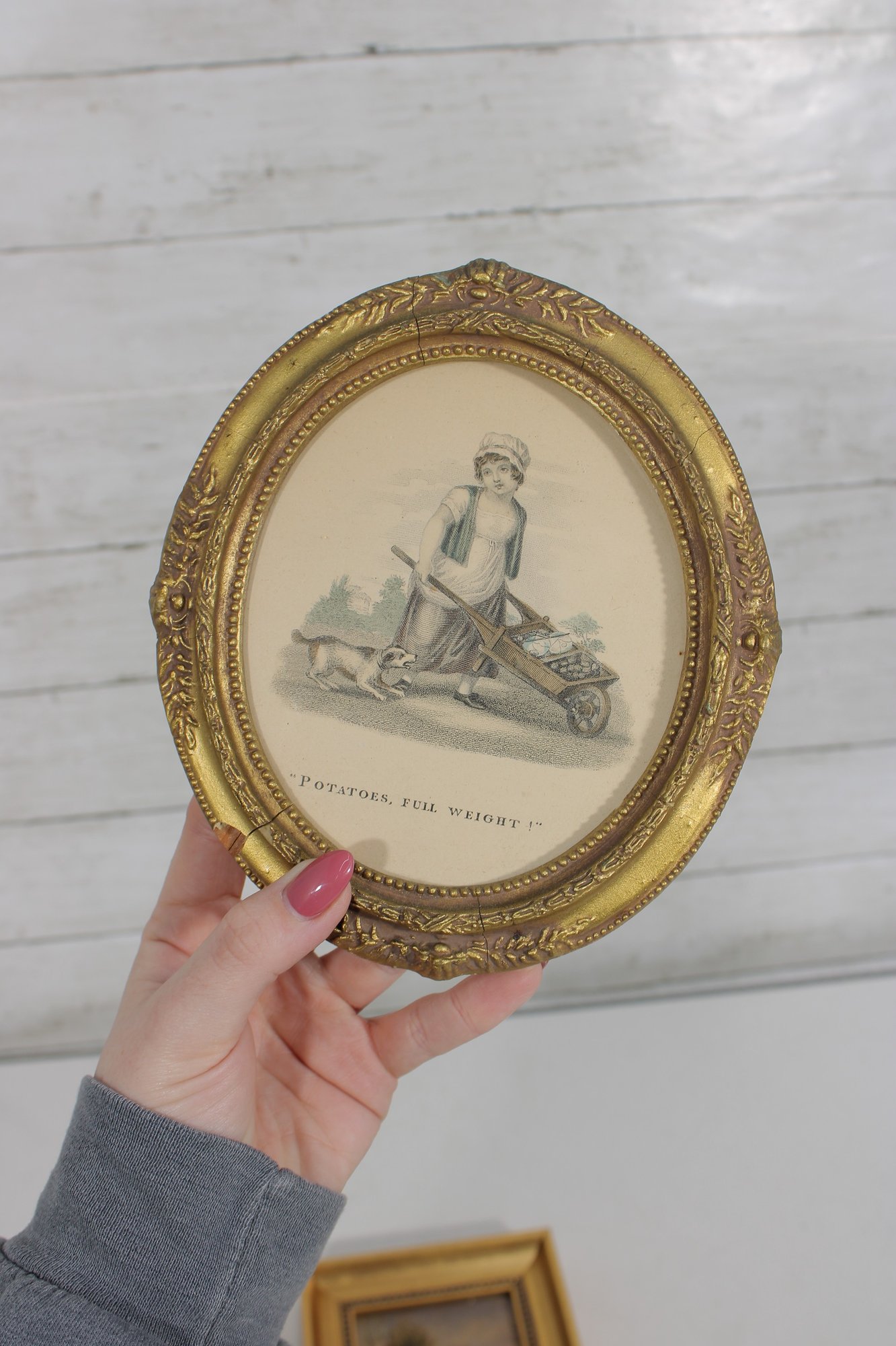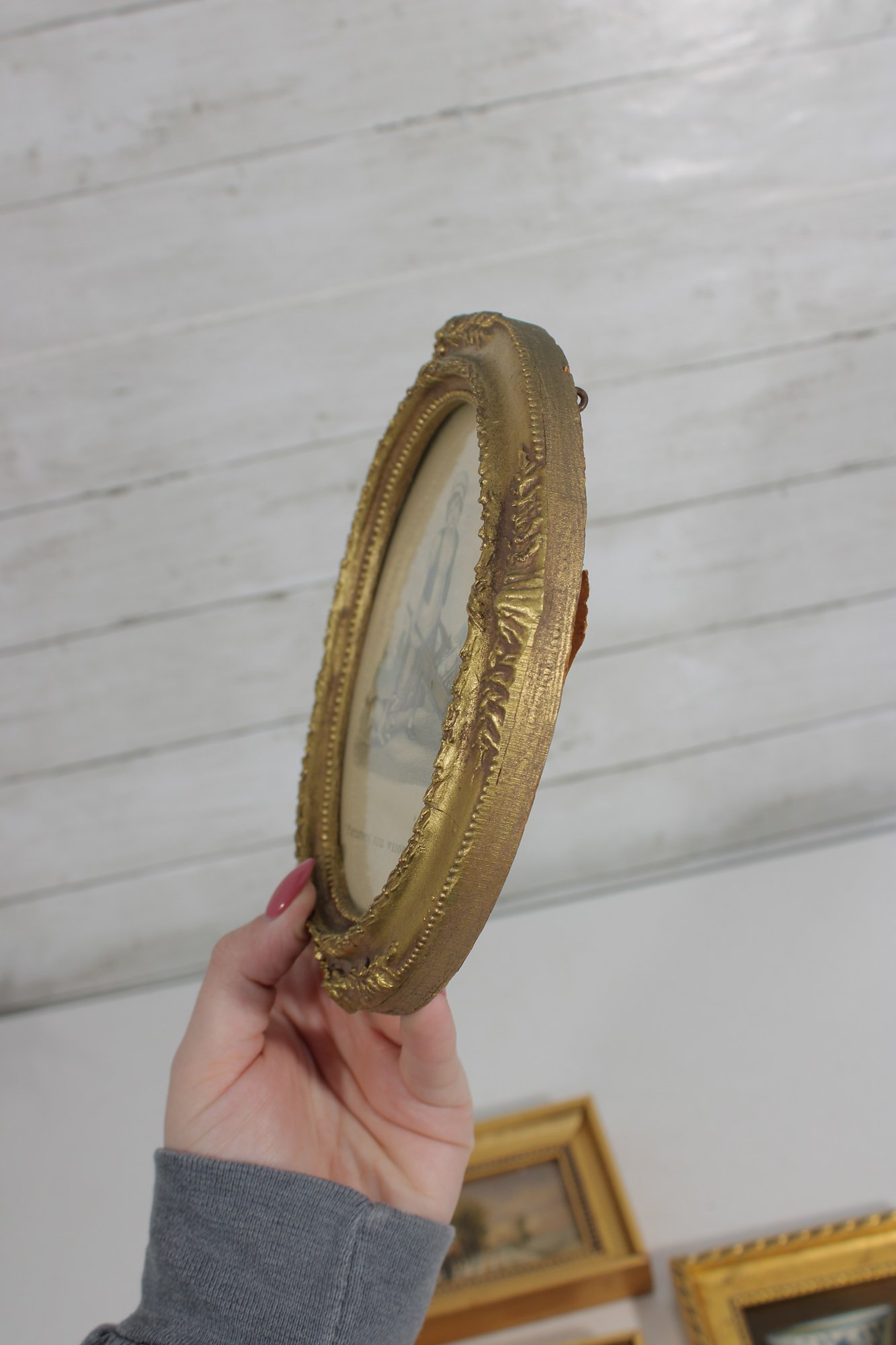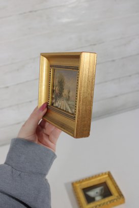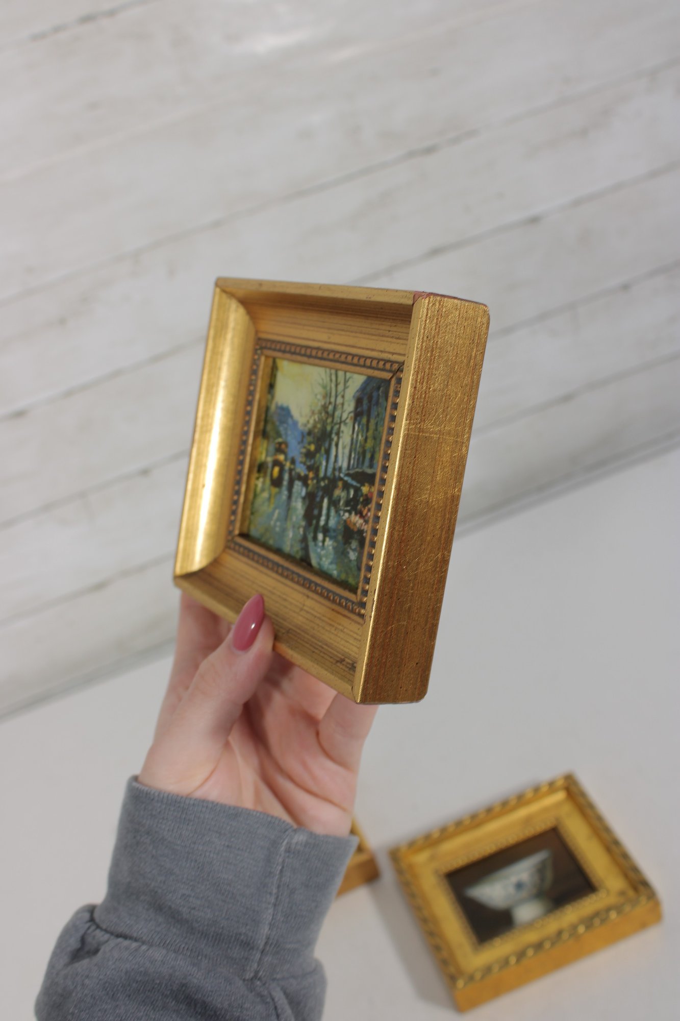 a charming group lot of four vintage mini framed art prints, each presented in decorative gold-tone frames. This collection features a variety of subjects and styles, making it perfect for a gallery wall or accent décor.