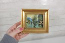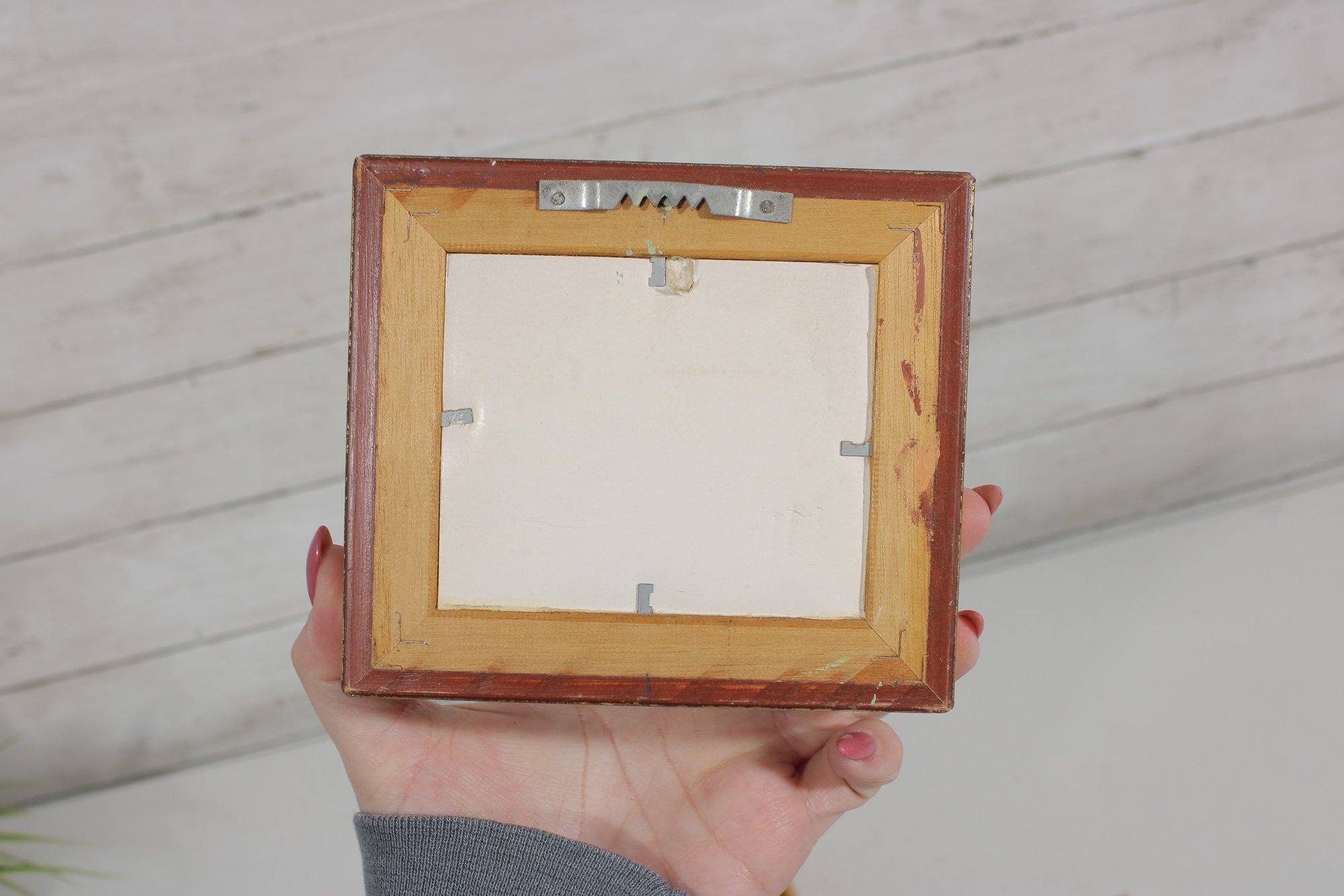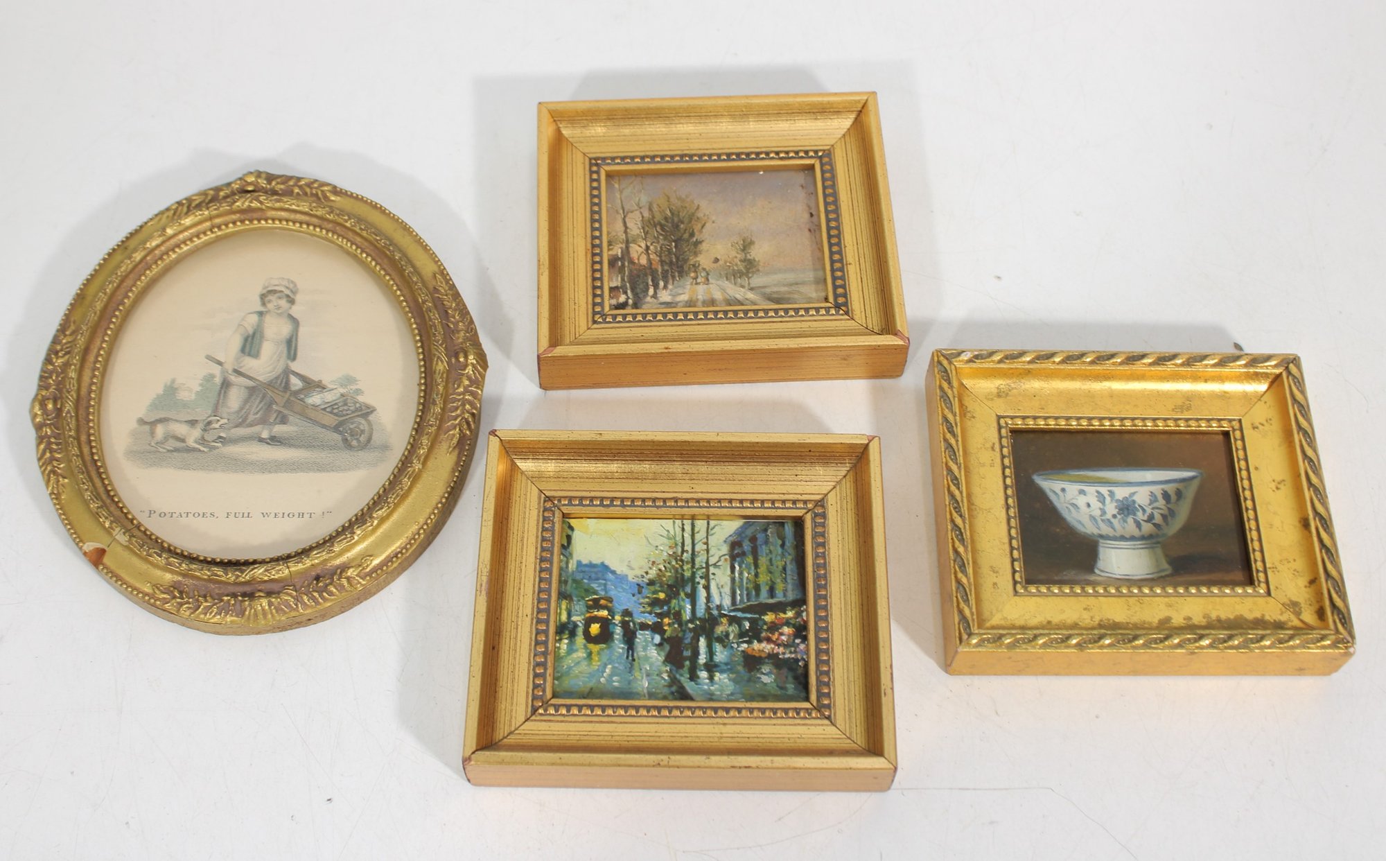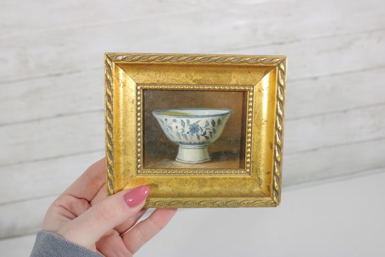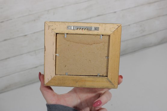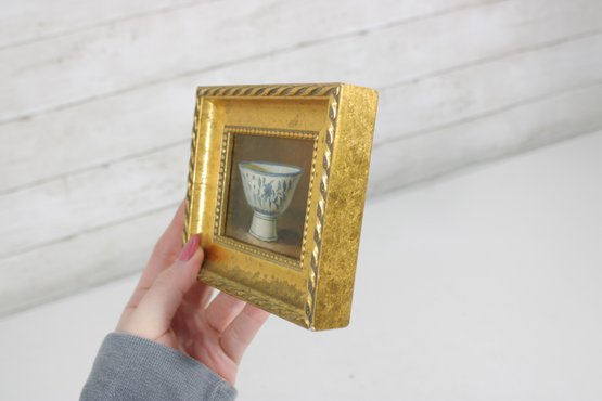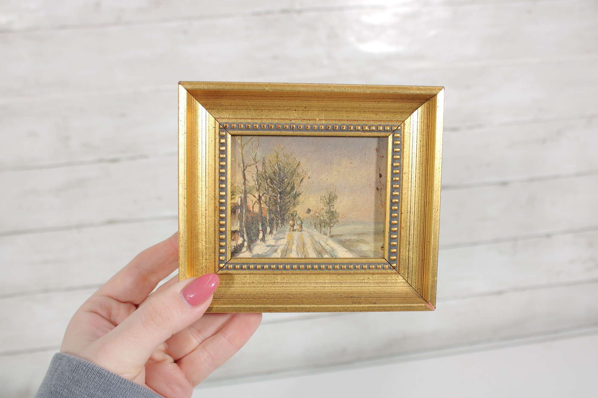 a charming group lot of four vintage mini framed art prints, each presented in decorative gold-tone frames. This collection features a variety of subjects and styles, making it perfect for a gallery wall or accent décor.