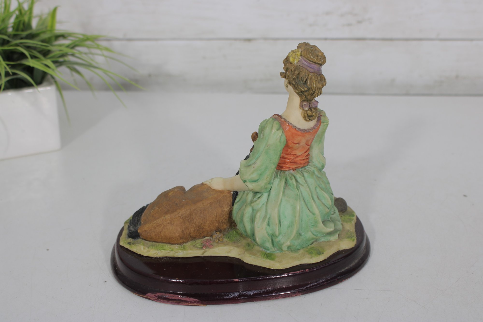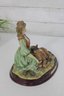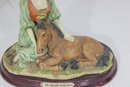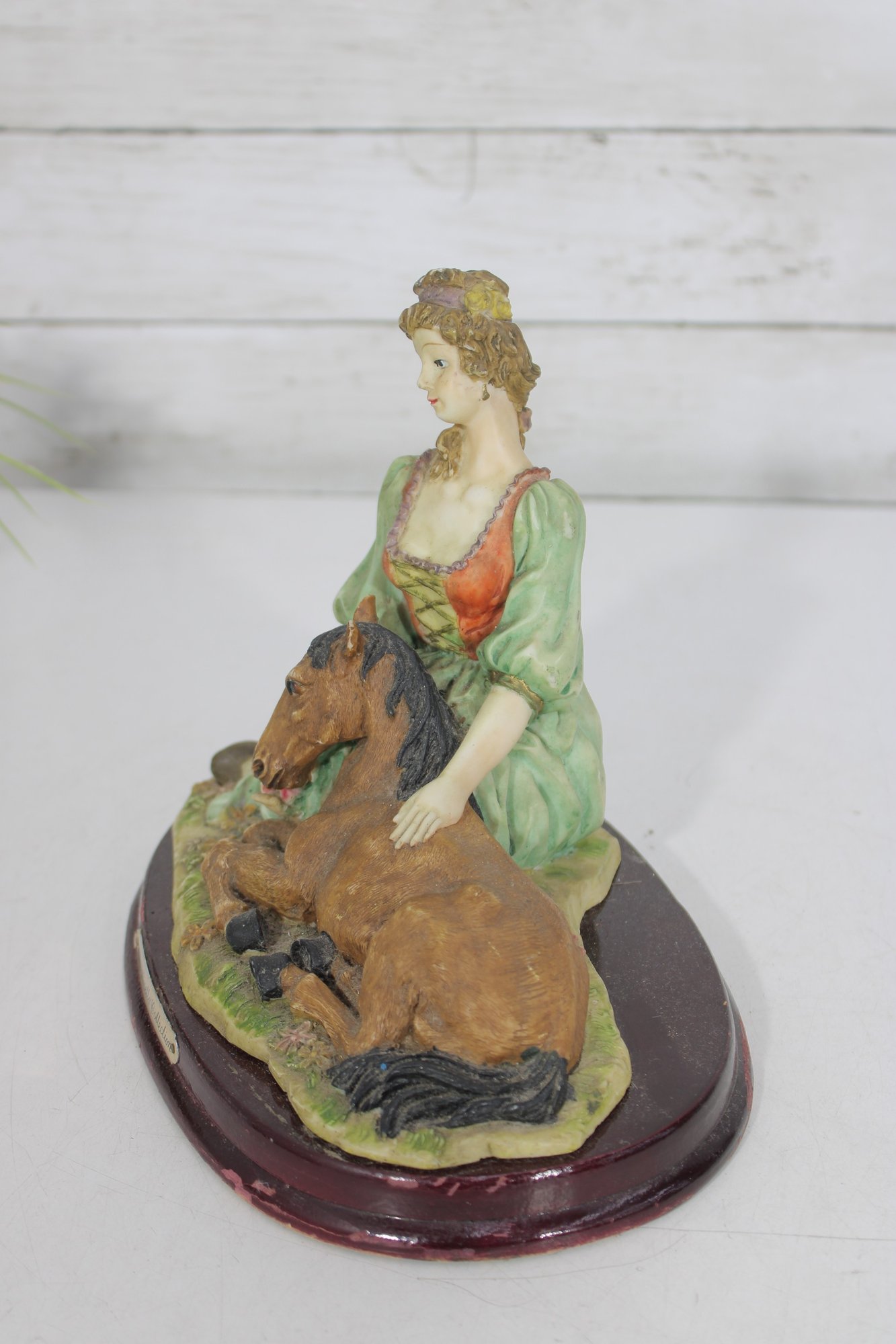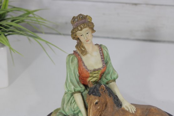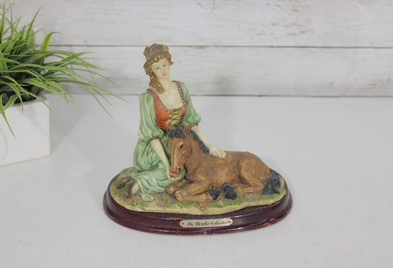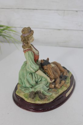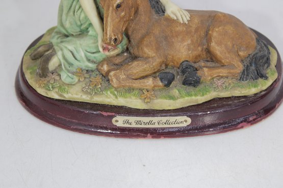 vintage resin figurine from The Mirella Collection, part of Peggy’s Collection, featuring a graceful lady seated beside a resting pony. Designed in a romantic Victorian-inspired style, this charming piece showcases soft pastel tones, delicate sculpted details, and a classic oval wood-look base.