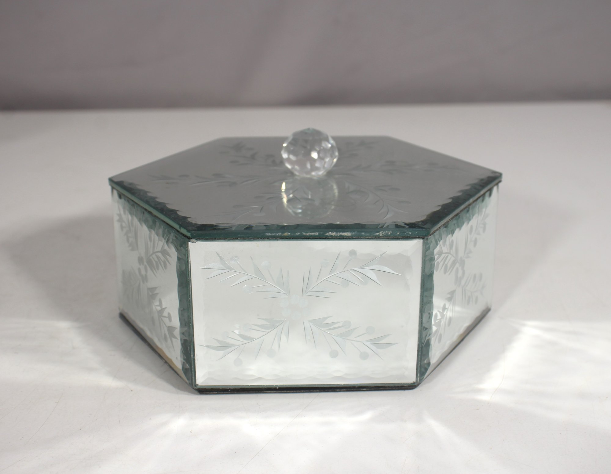a beautiful vintage mirrored glass box with a hexagonal shape and an intricate etched floral design on all sides and the lid. A faceted glass knob adorns the top, adding a touch of elegance.