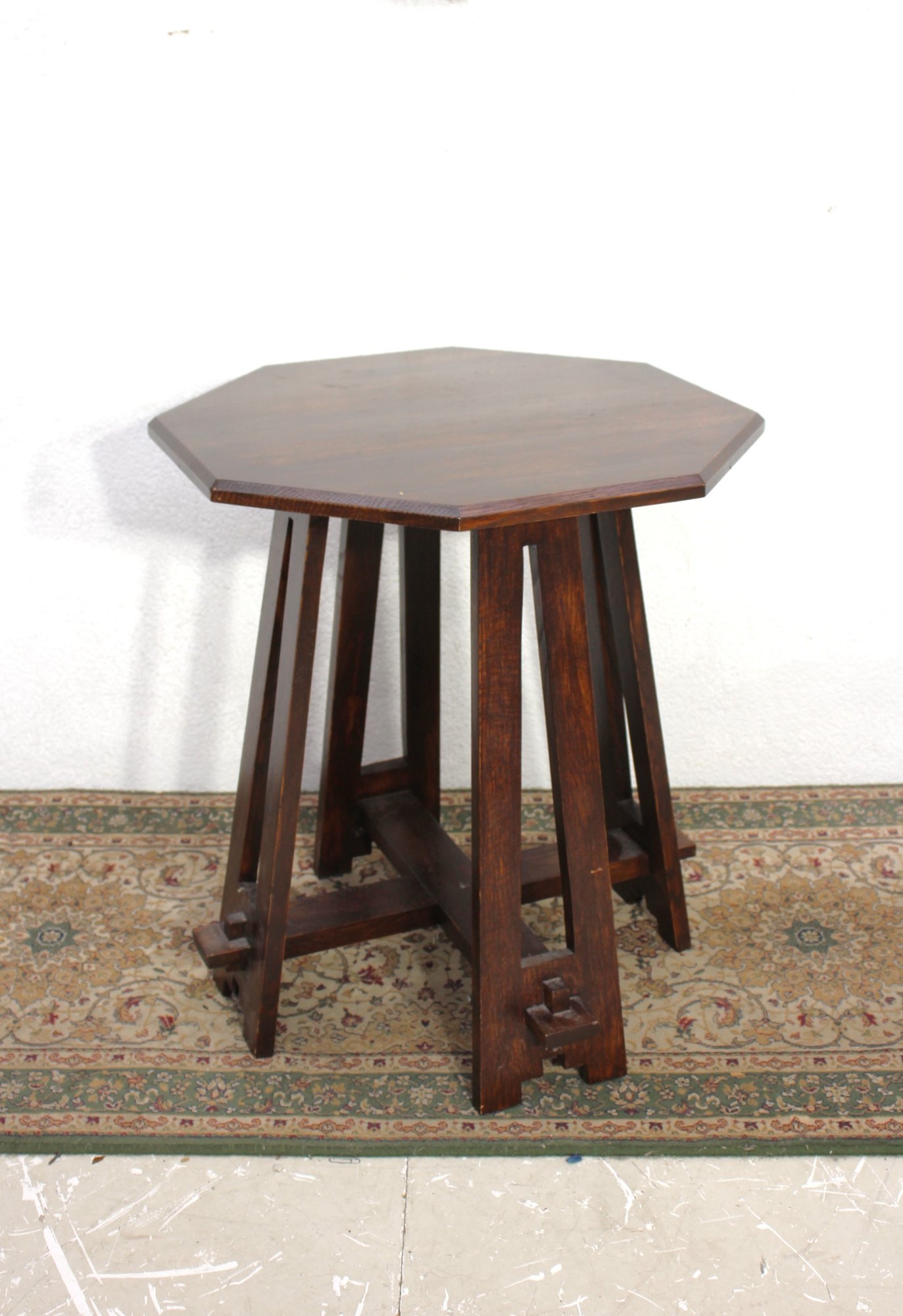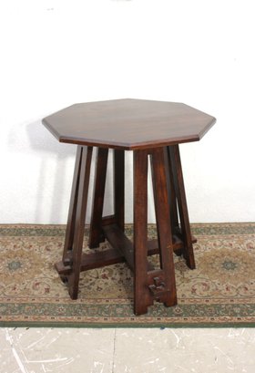 This striking Mission-style side table features an octagonal top and a handcrafted base with bold architectural lines. Made of solid wood with a rich dark finish, it showcases traditional craftsmanship with exposed pegs and a sturdy cross-braced foundation.