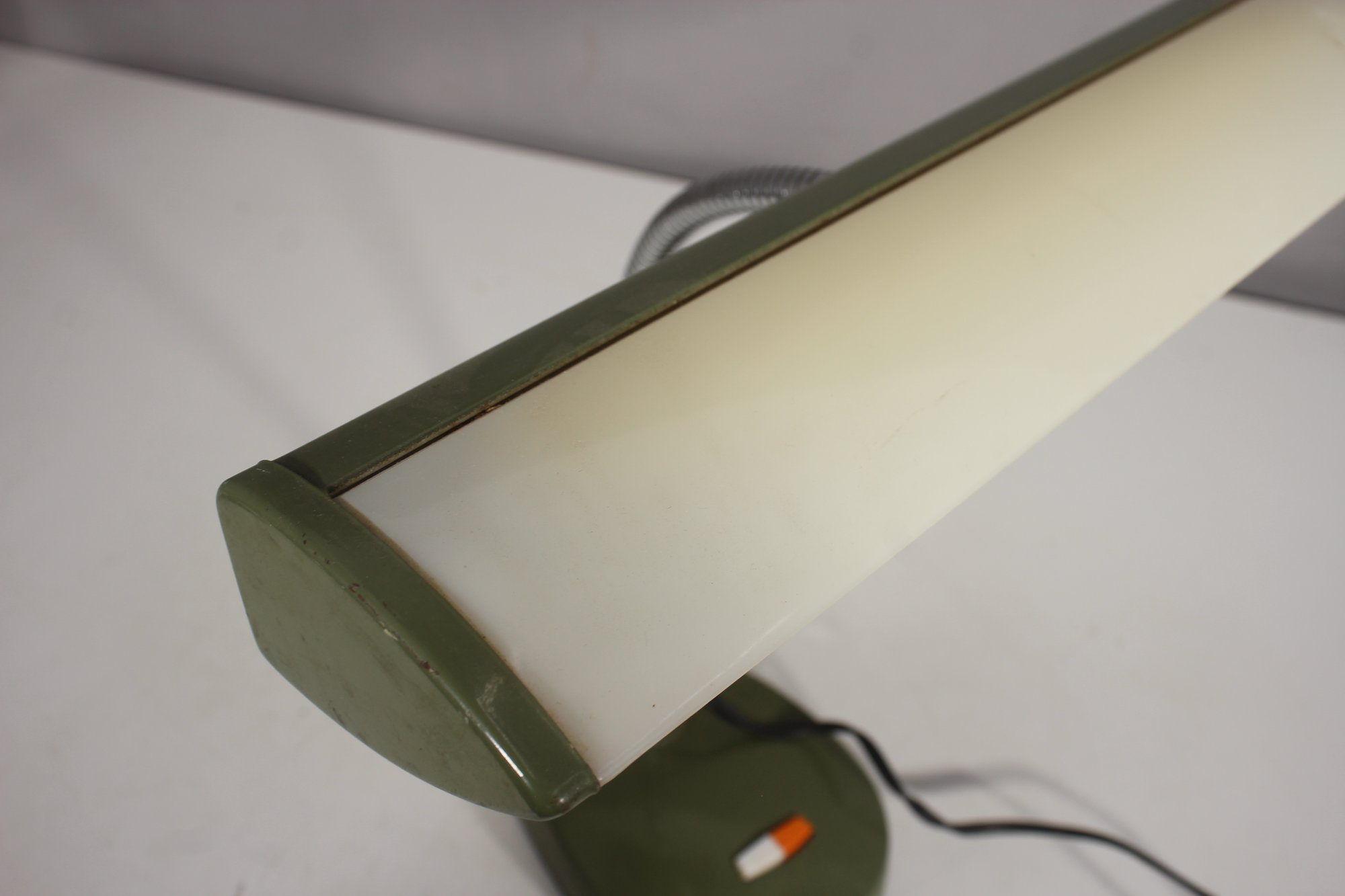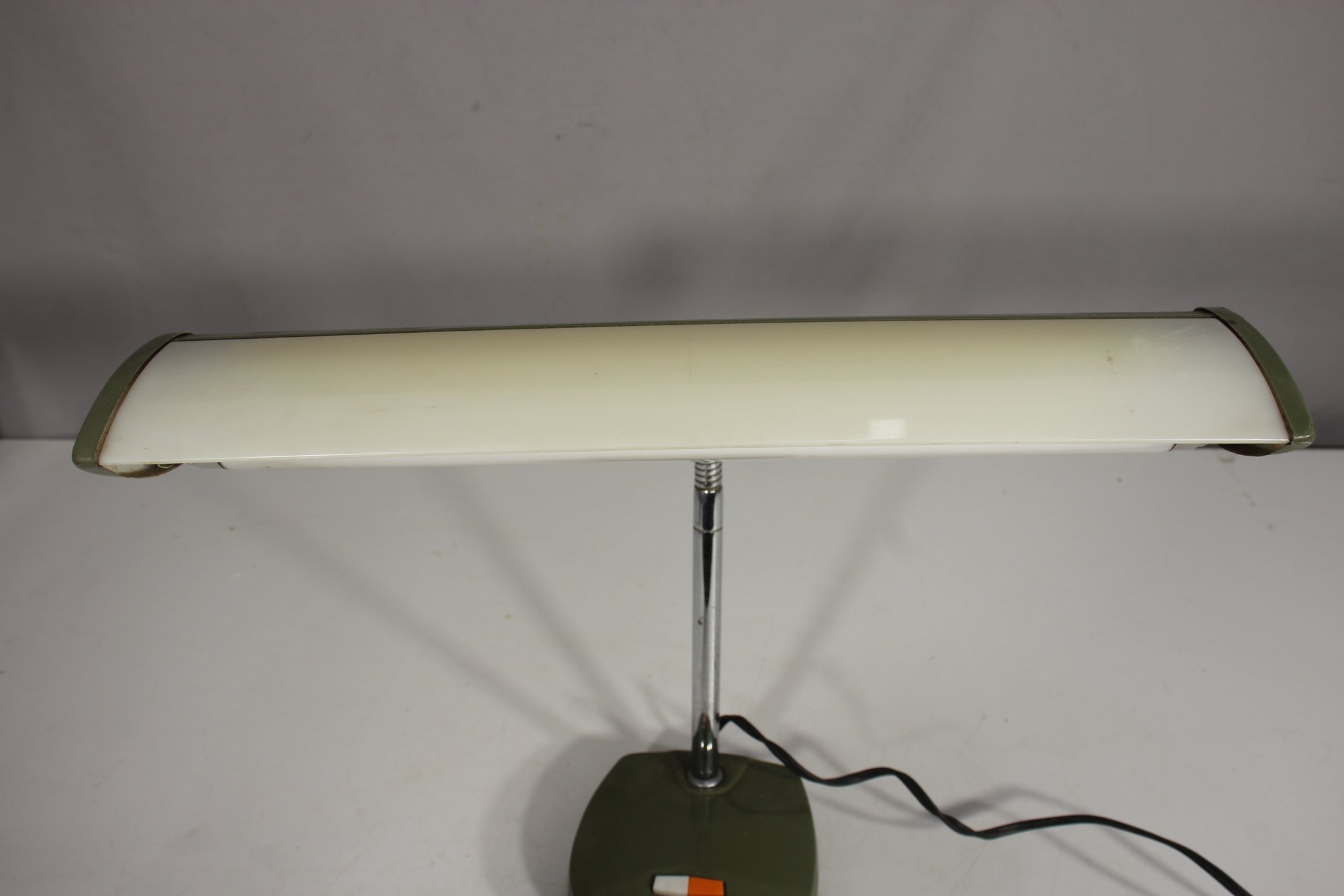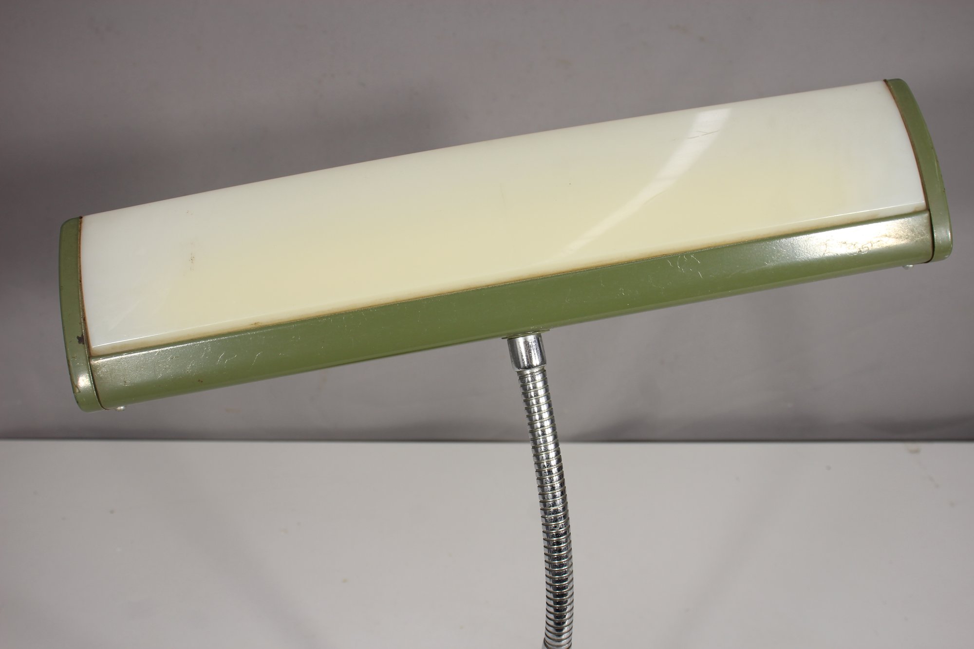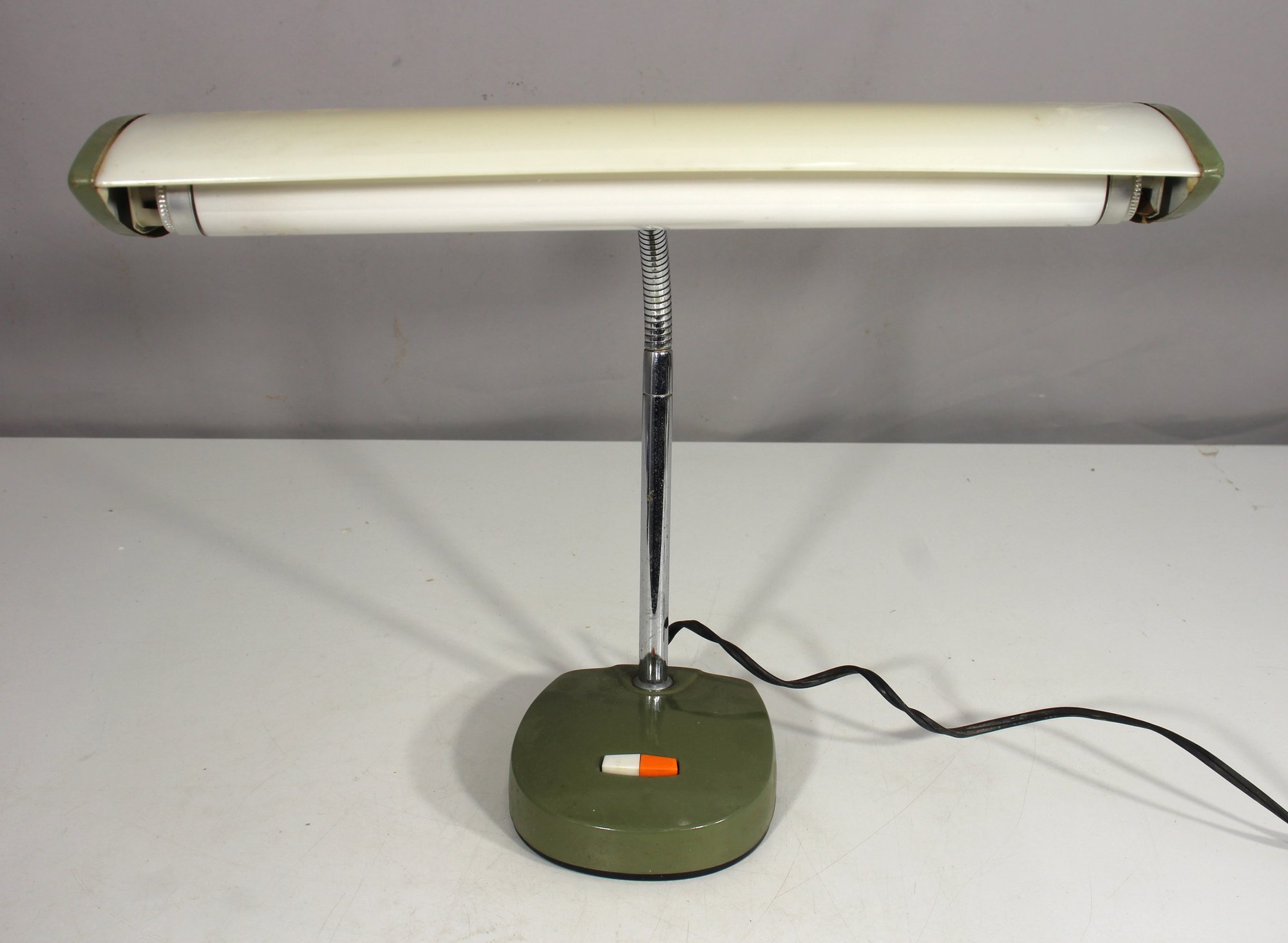 a vintage Mobilite fluorescent desk lamp, featuring a sleek mid-century modern design with an adjustable chrome neck, green metal base, and a wide light diffuser.