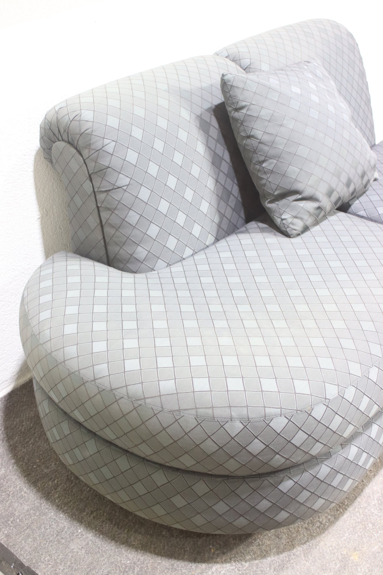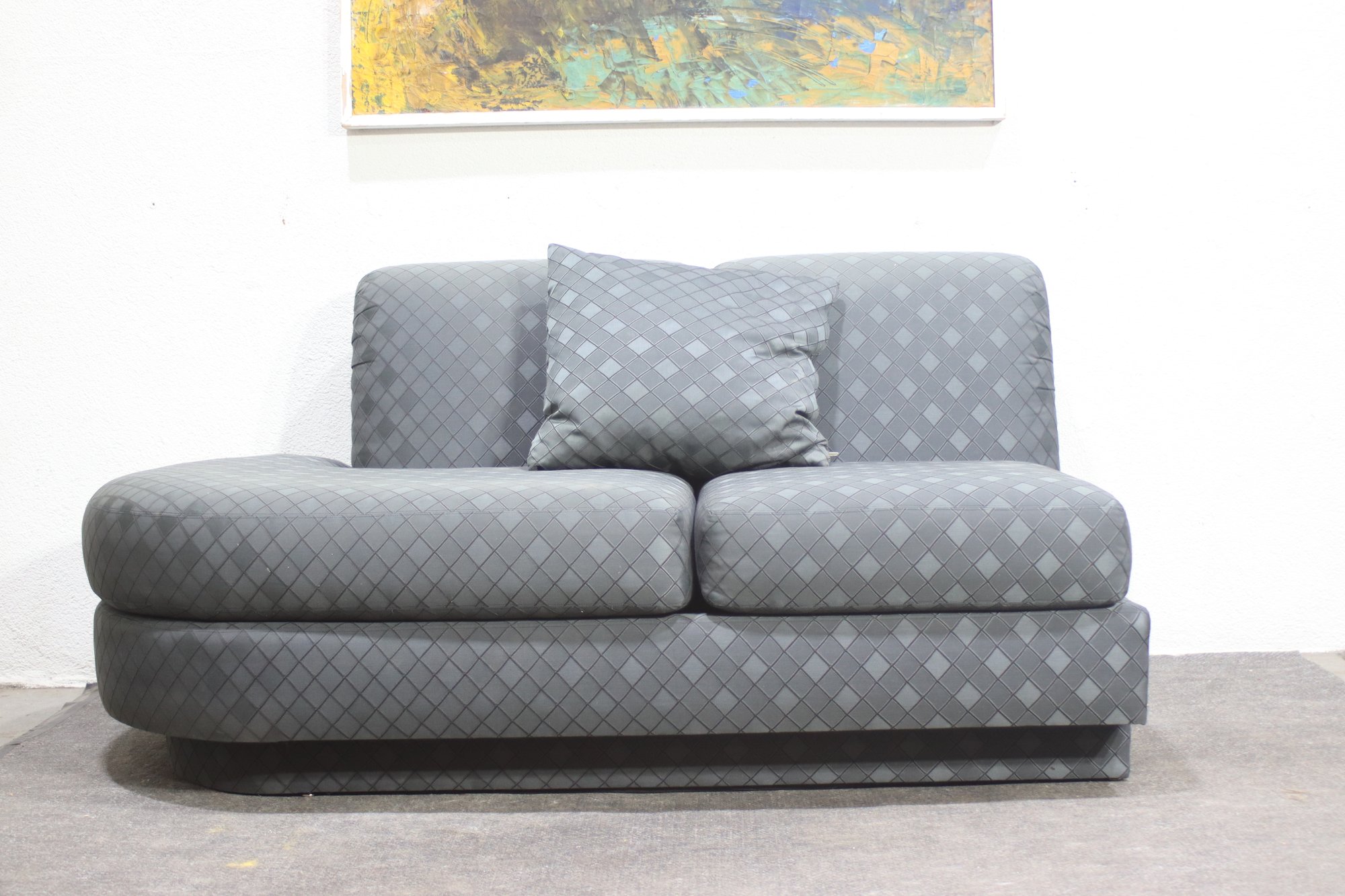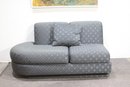 Upgrade your space with this stylish vintage modern chaise loveseat, featuring a unique asymmetrical curved design and geometric patterned upholstery in deep gray tones. A perfect blend of comfort and contemporary style, this piece makes an eye-catching addition to any living space.
