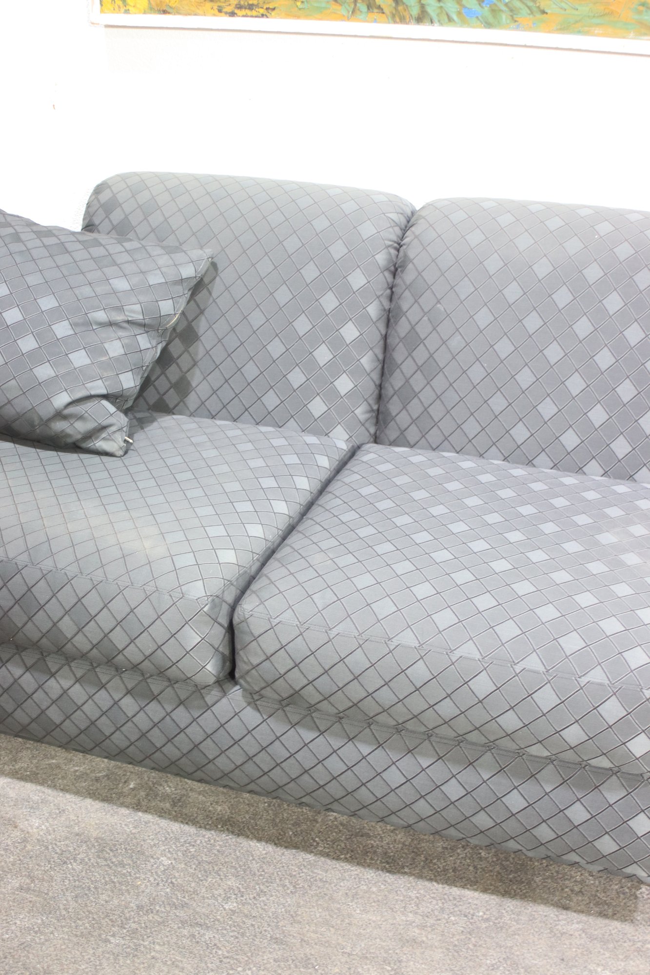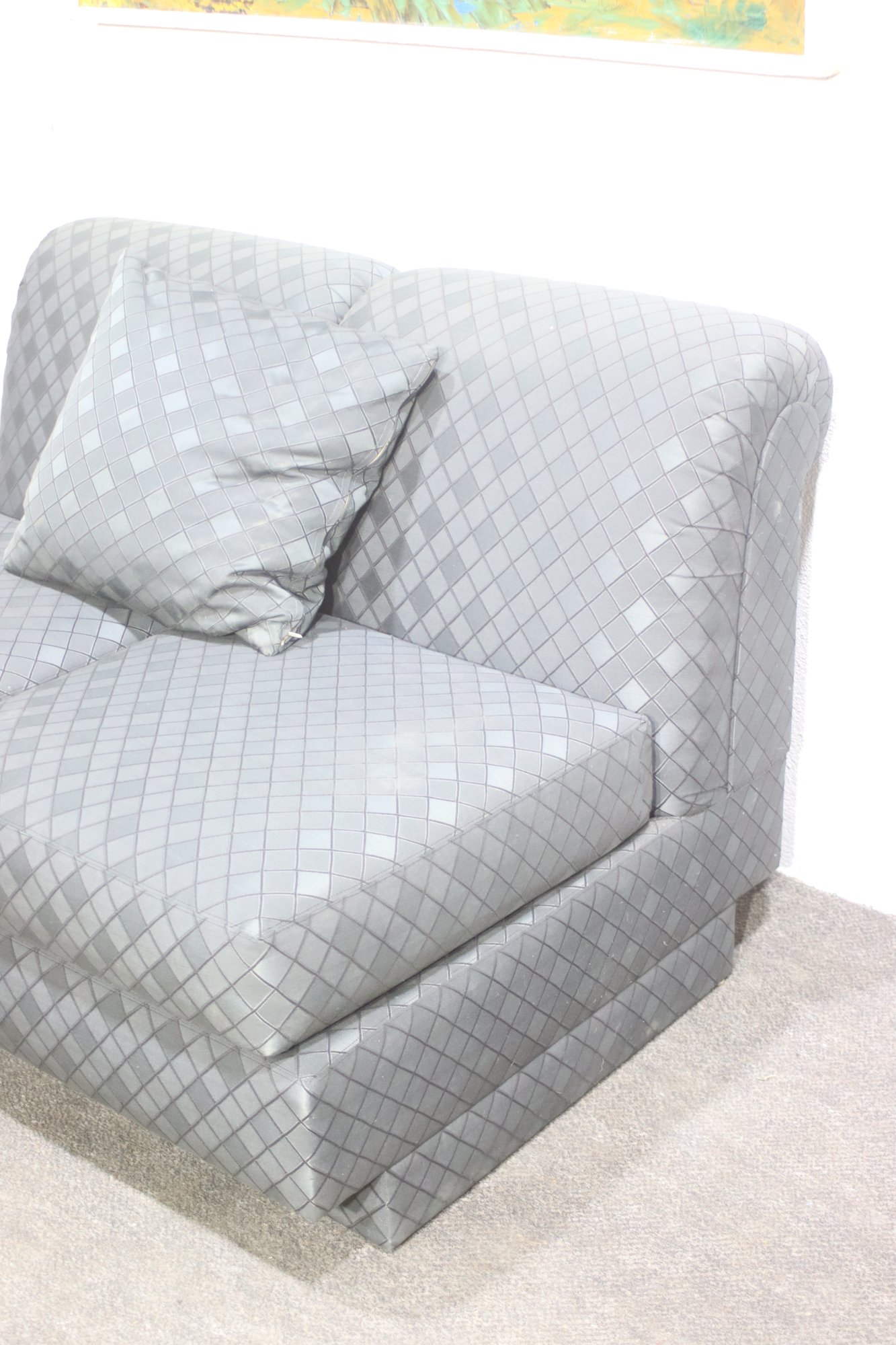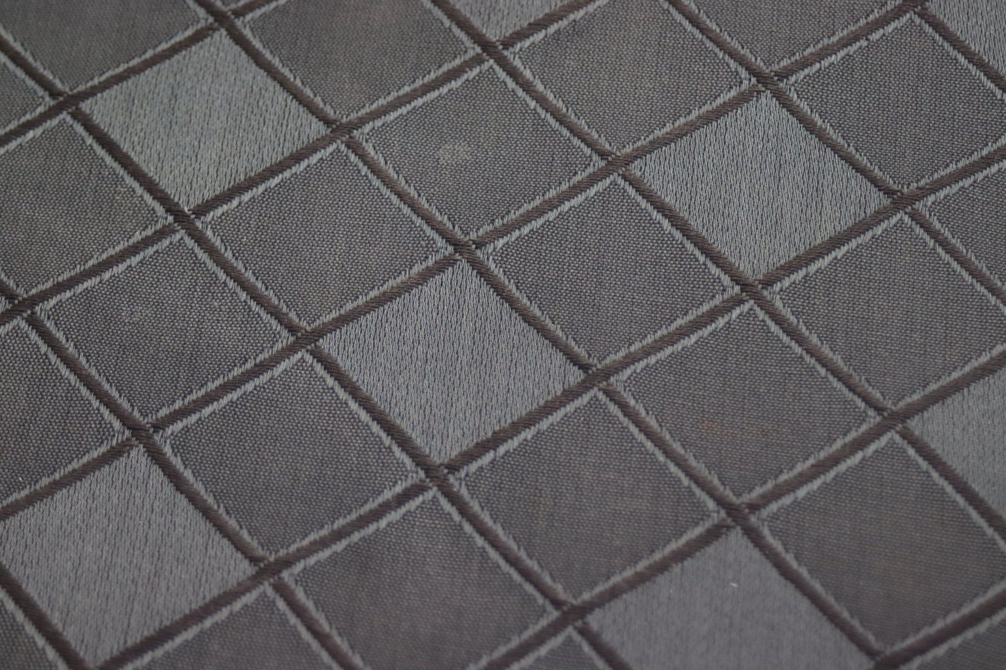 Plush geometric-patterned fabric upholstery in a neutral gray tone