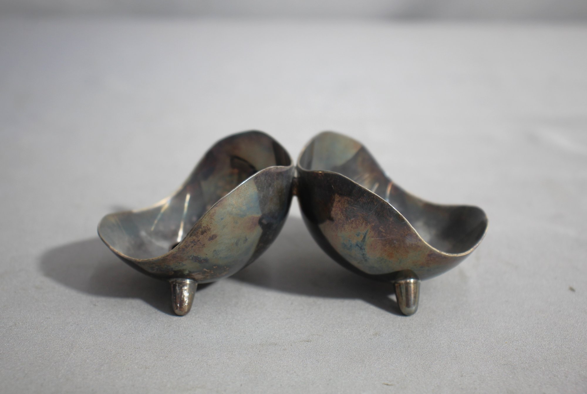 mid-century modern Danish design, a silver-plated double bowl footed candle holder by Hans Jensen. This unique item features an elegant and minimalistic design with two intertwined bowls set on small feet, demonstrating the sleek and functional aesthetics typical of Danish silver work from the era. Each bowl is designed to hold a single candle, making it both a decorative and practical addition to any setting.