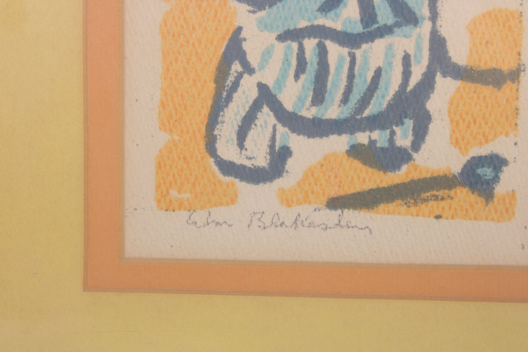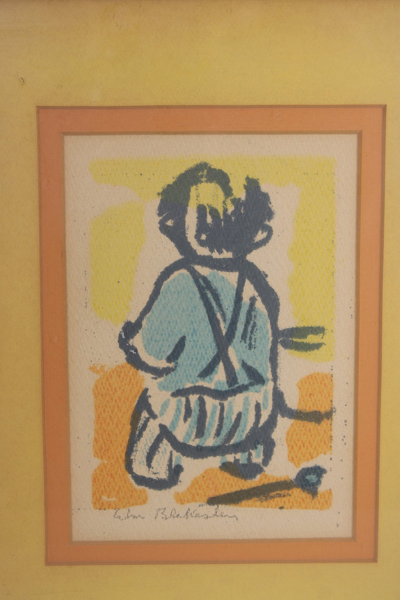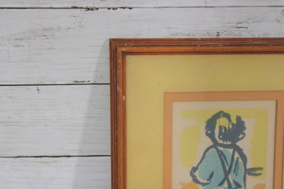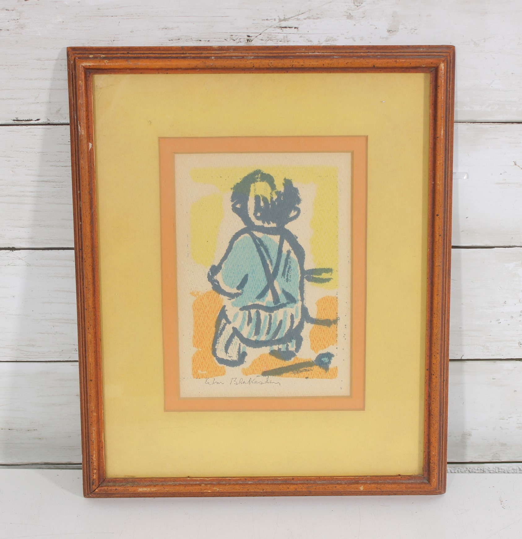 a charming vintage modernist print featuring a simplified, stylized seated figure rendered in bold, expressive lines. The composition uses a soft, muted color palette with contrasting outlines, giving the piece a playful yet sophisticated mid-century aesthetic.