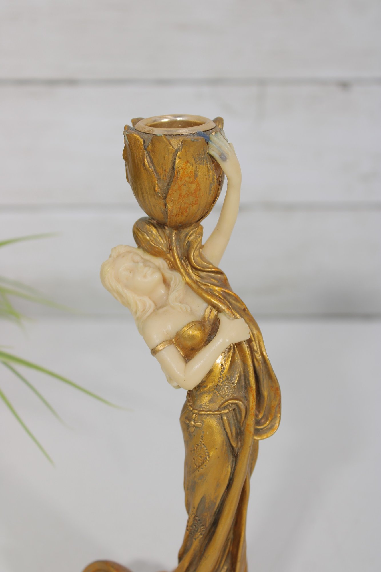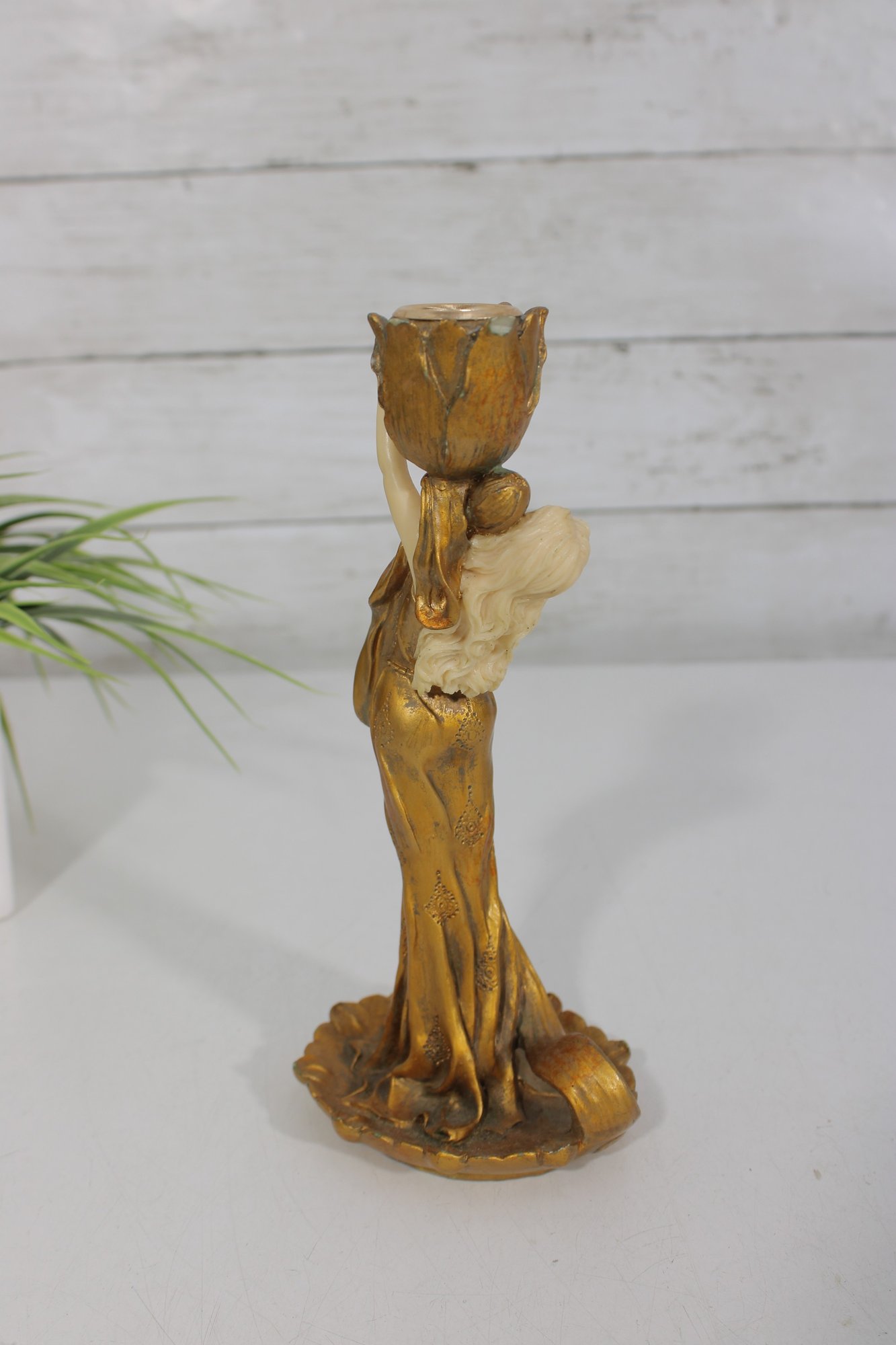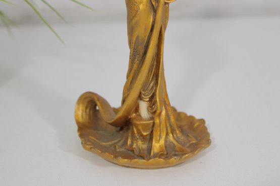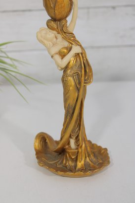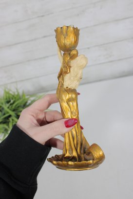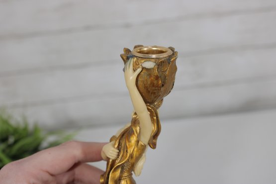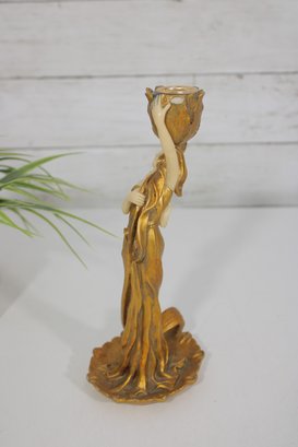 eye-catching modernist style figural candlestick featuring a graceful lady form in flowing lines and a rich gold-tone finish. This sculptural piece evokes Art Deco-inspired design, with a stylized female figure holding a tulip-shaped candle holder.