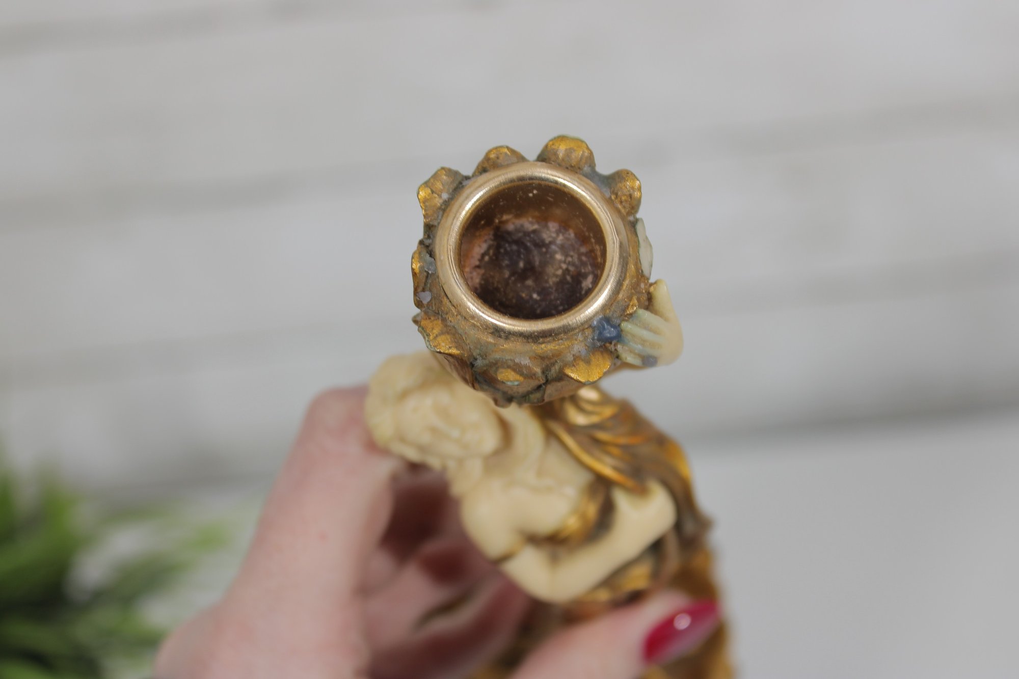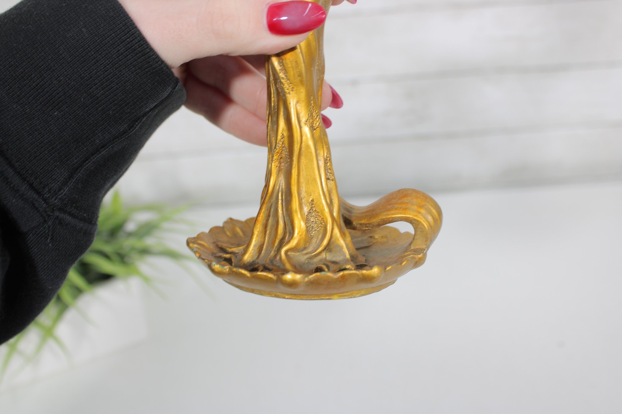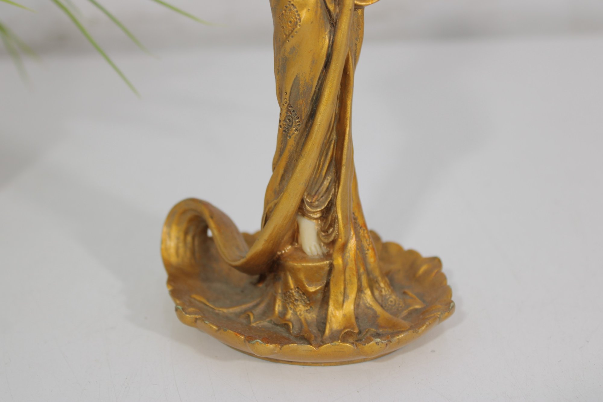 eye-catching modernist style figural candlestick featuring a graceful lady form in flowing lines and a rich gold-tone finish. This sculptural piece evokes Art Deco-inspired design, with a stylized female figure holding a tulip-shaped candle holder.