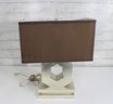 Bring bold mid-century style to your space with this vintage modernist table lamp, featuring a striking geometric silver-tone base and a sleek rectangular brown fabric shade.