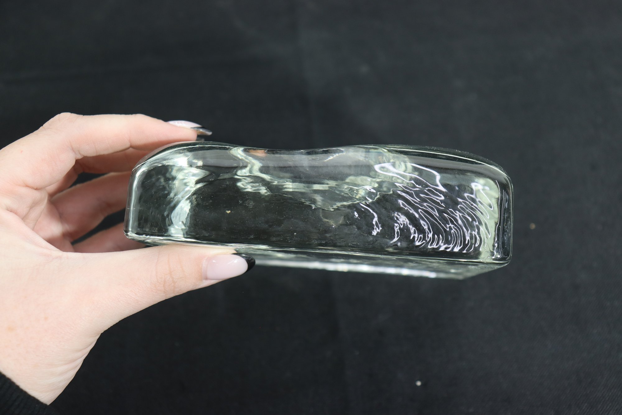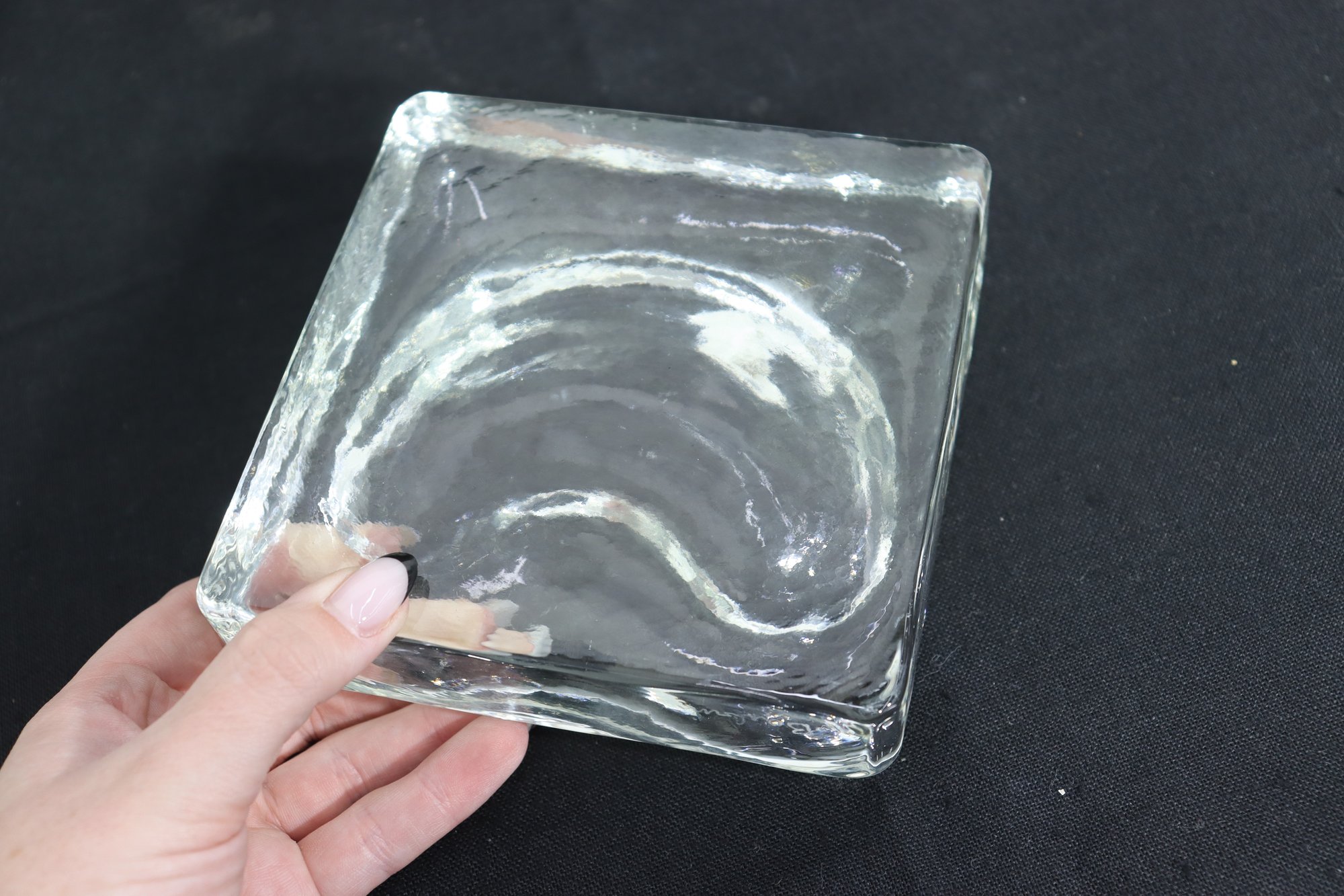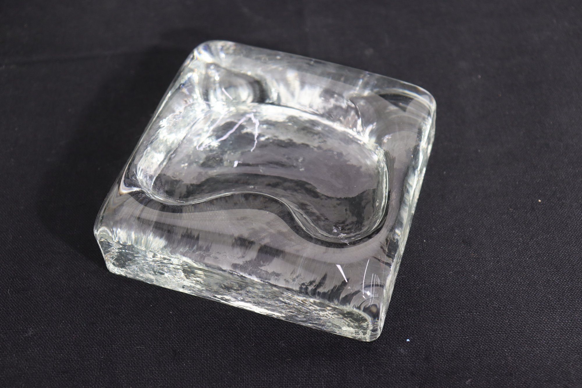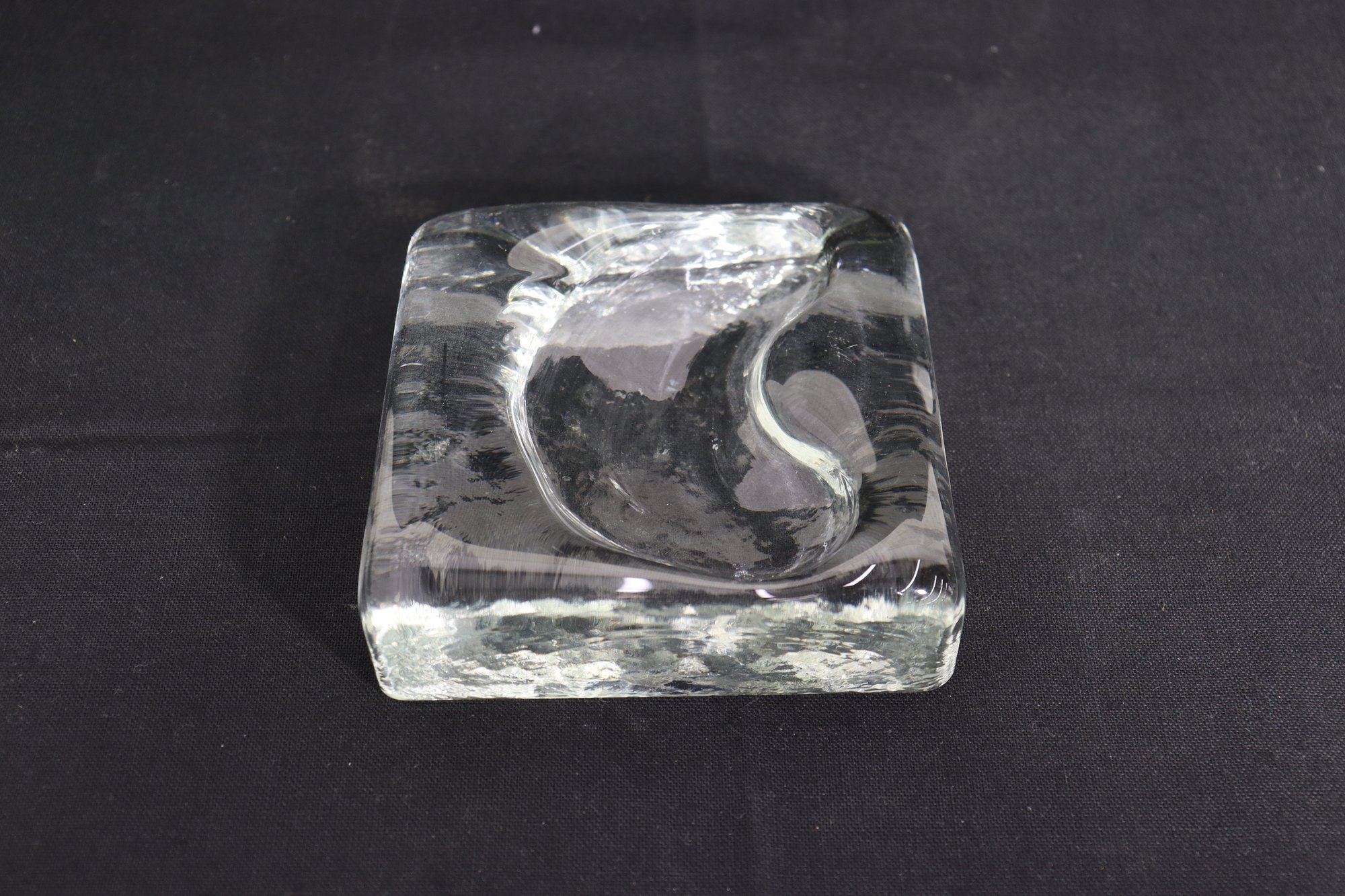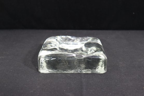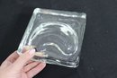 Vintage heavy clear glass square ashtray / catchall dish featuring a sculpted modernist form with organic recessed bowl design. Thick solid glass with great clarity and weight—classic mid-century style.