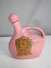 This unique vintage ceramic decanter bottle is a standout mid-century collectible, originally used for Mohawk liquor. Measuring approximately 8.5 inches tall, it features a glossy pink glaze, molded handle, and an eye-catching boho floral transfer design on the front. The back is embossed with the phrase: