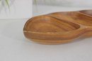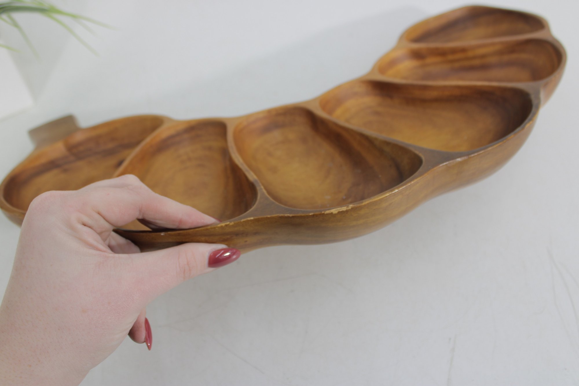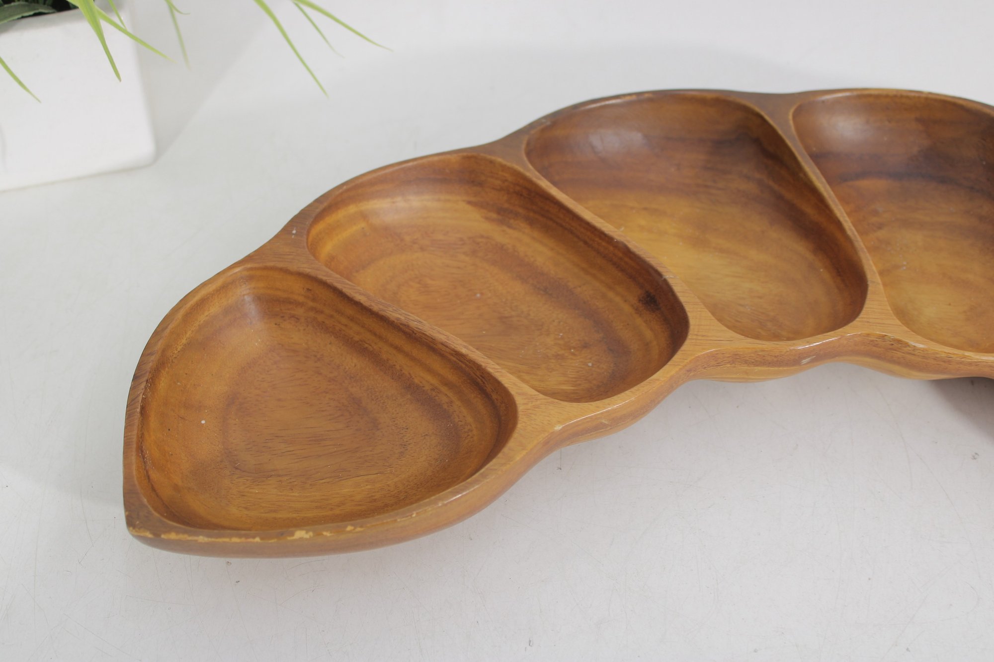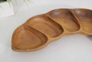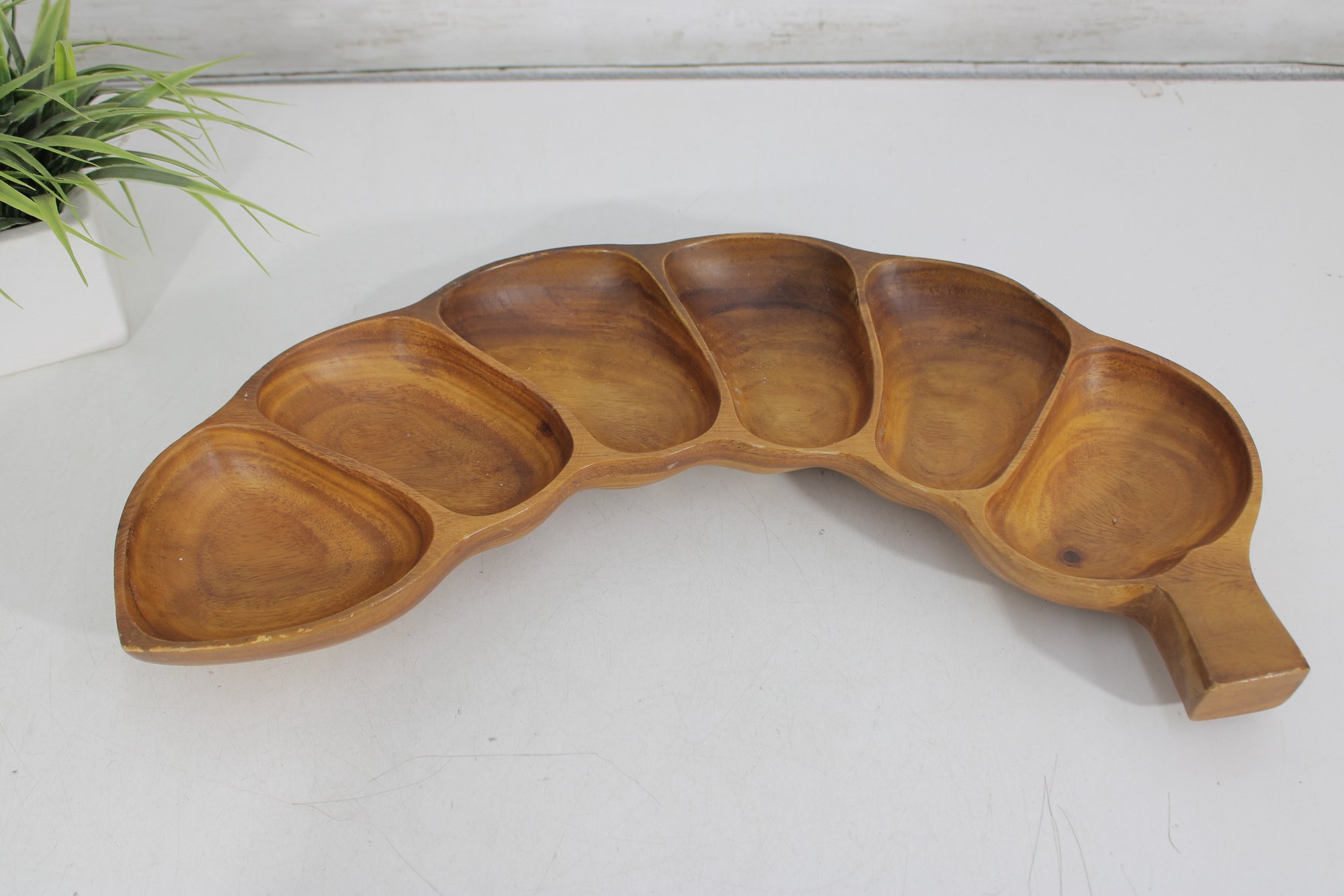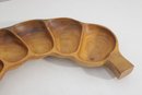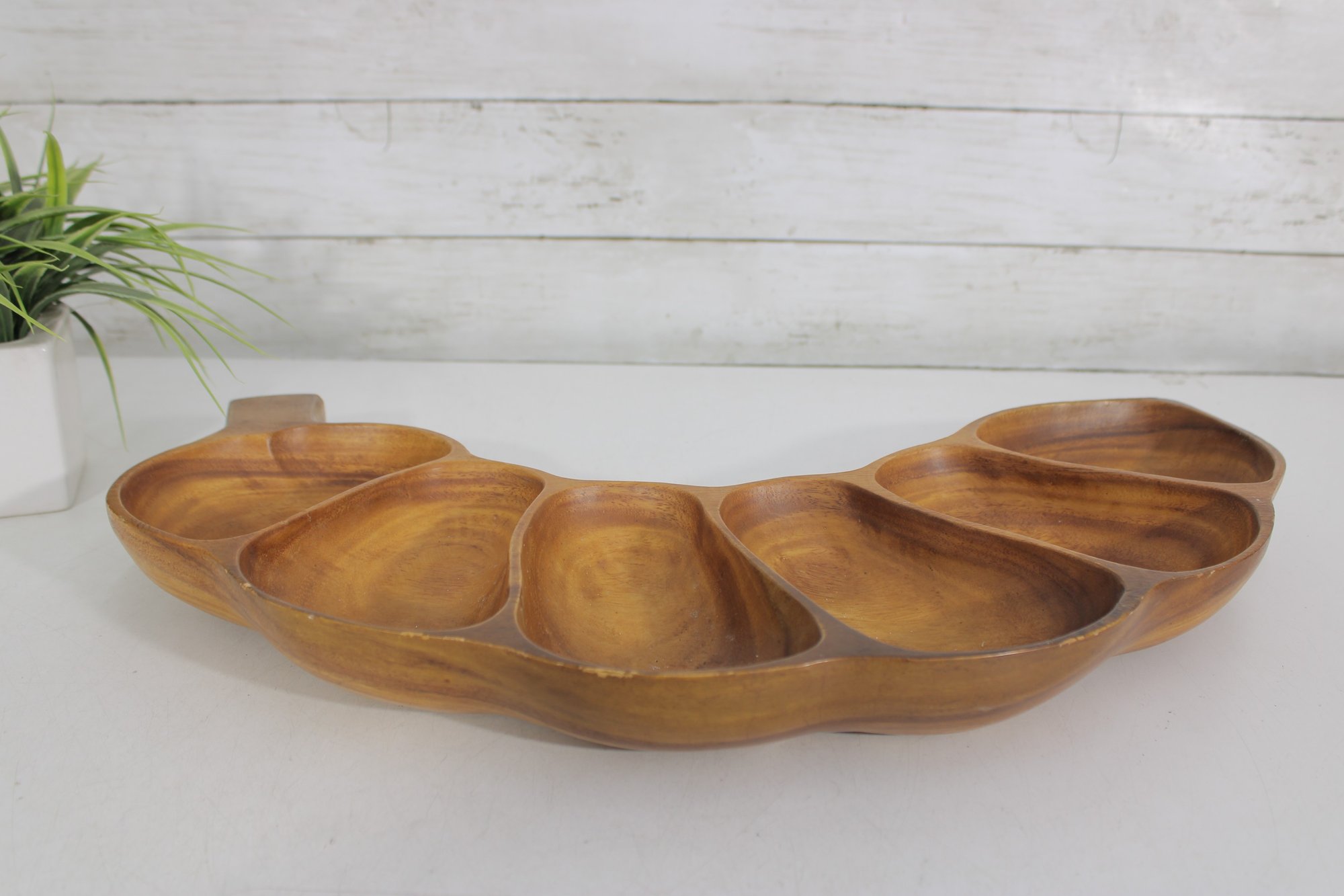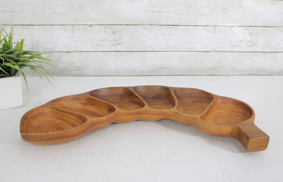 This divided tray showcases six carved compartments, making it perfect for serving nuts, candies, olives, snacks, or appetizers. The warm honey-brown tones and striking wood grain patterns are characteristic of monkeypod wood, a popular material in mid-century Hawaiian and Pacific décor.