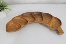 The tray’s organic crescent shape and smooth hand-carved finish give it a classic mid-century modern appeal, ideal for entertaining or display.