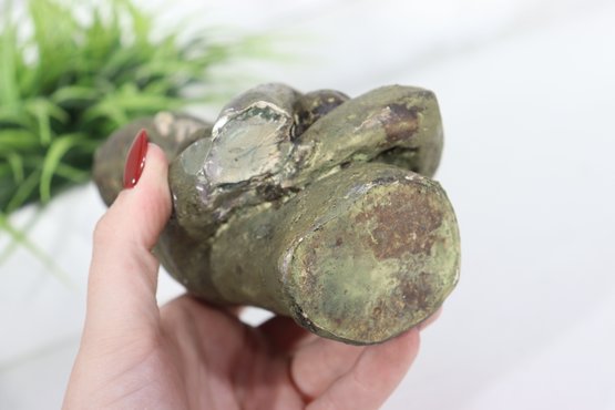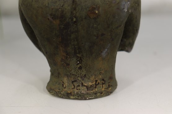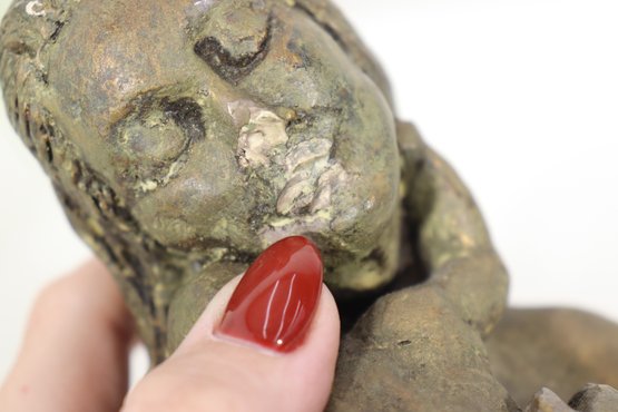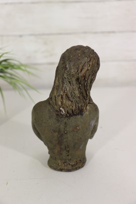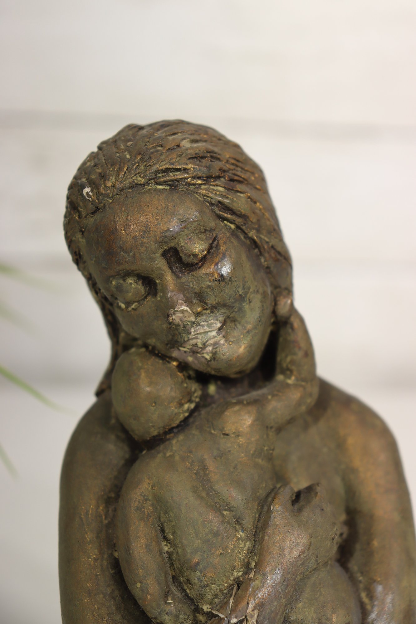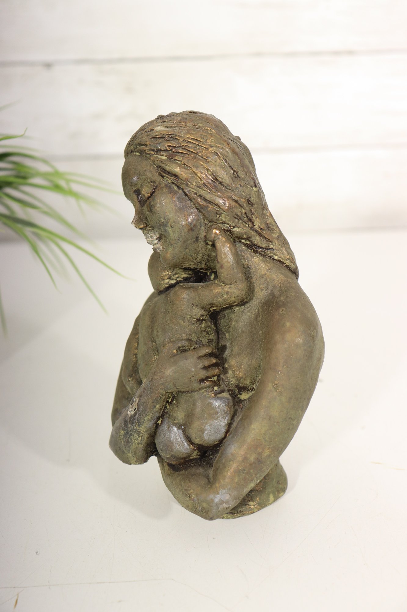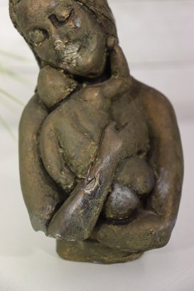Tender and expressive, this 7-inch vintage sculpture depicts a serene mother cradling her child in a heartfelt embrace. Cast in a bronze-tone finish, the piece exudes warmth and emotion, capturing the timeless theme of maternal love. The textured surface and hand-finished details add depth and a rustic, artistic quality to the form.